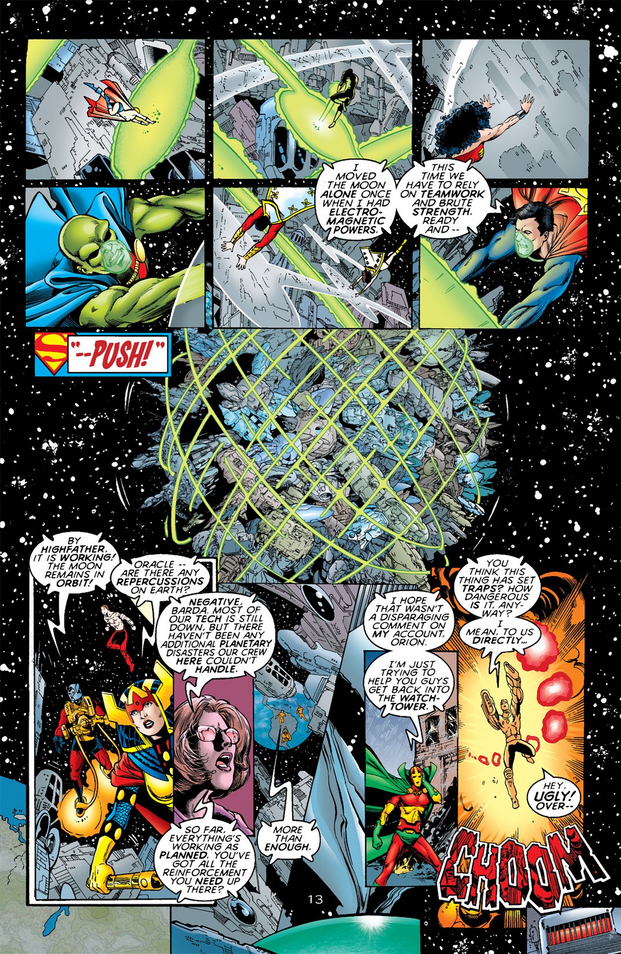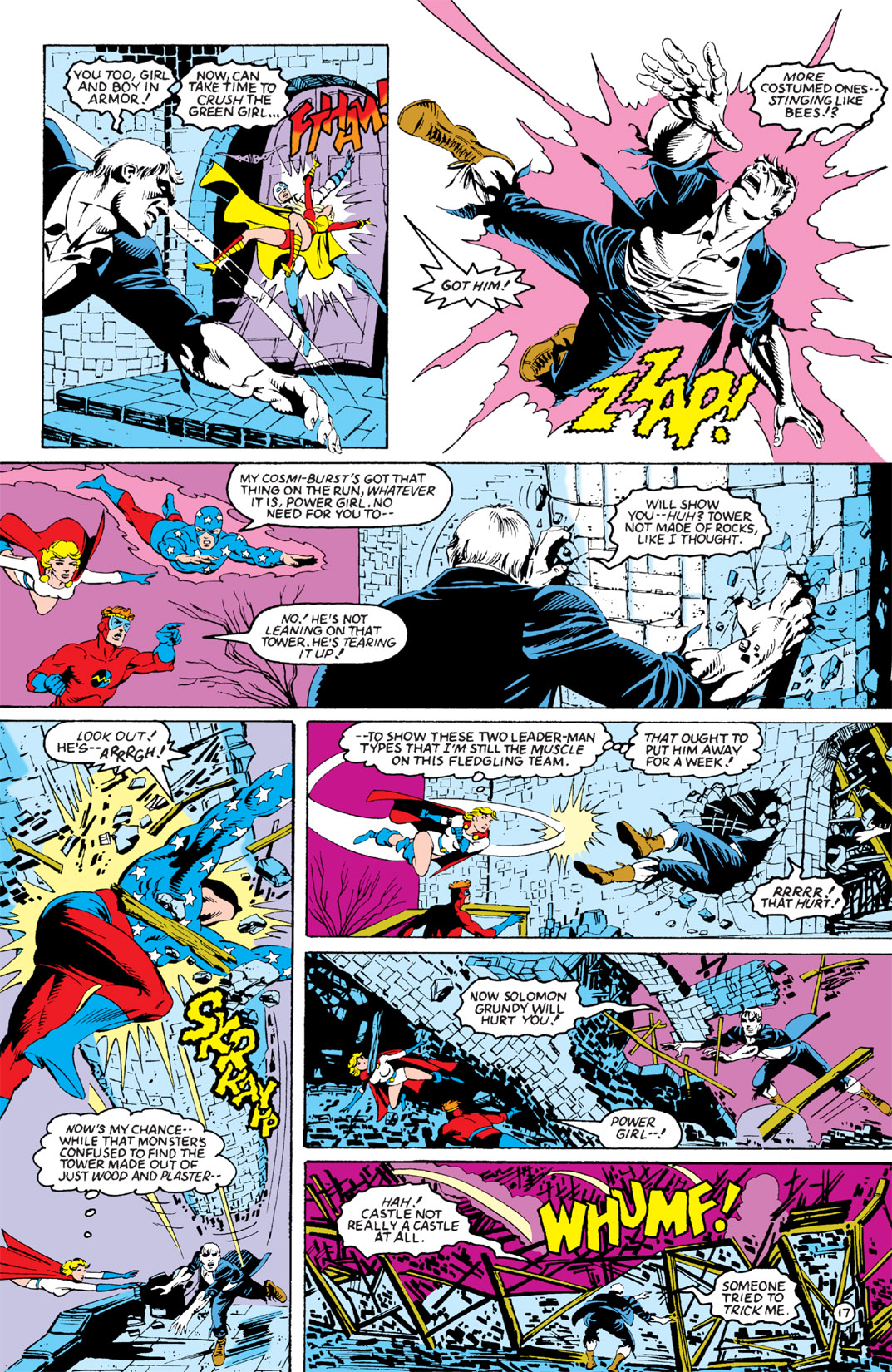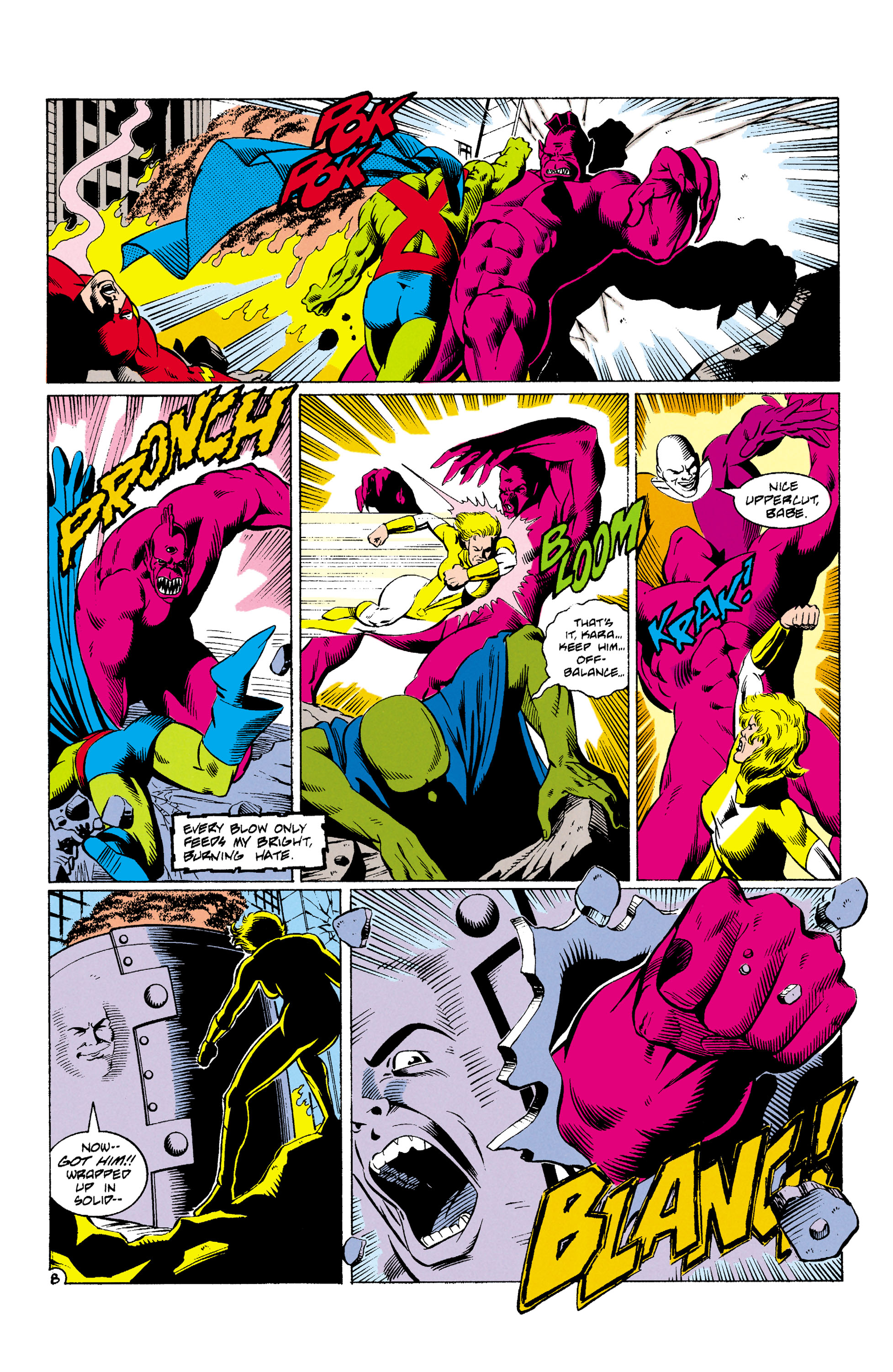 Tears through the hull of Brain Wave’s satellite and punches Degaton.