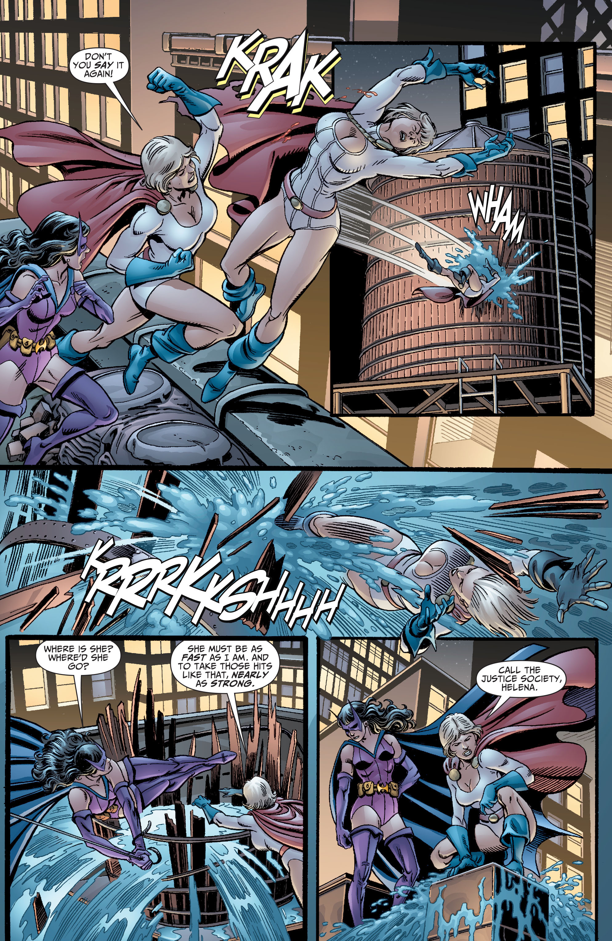 Believing her to be an impostor, this world’s more brutal Robin and Power Girl tried torturing information out of her, but she was saved after the New Earth JSA appeared and helped clear up the misunderstanding.