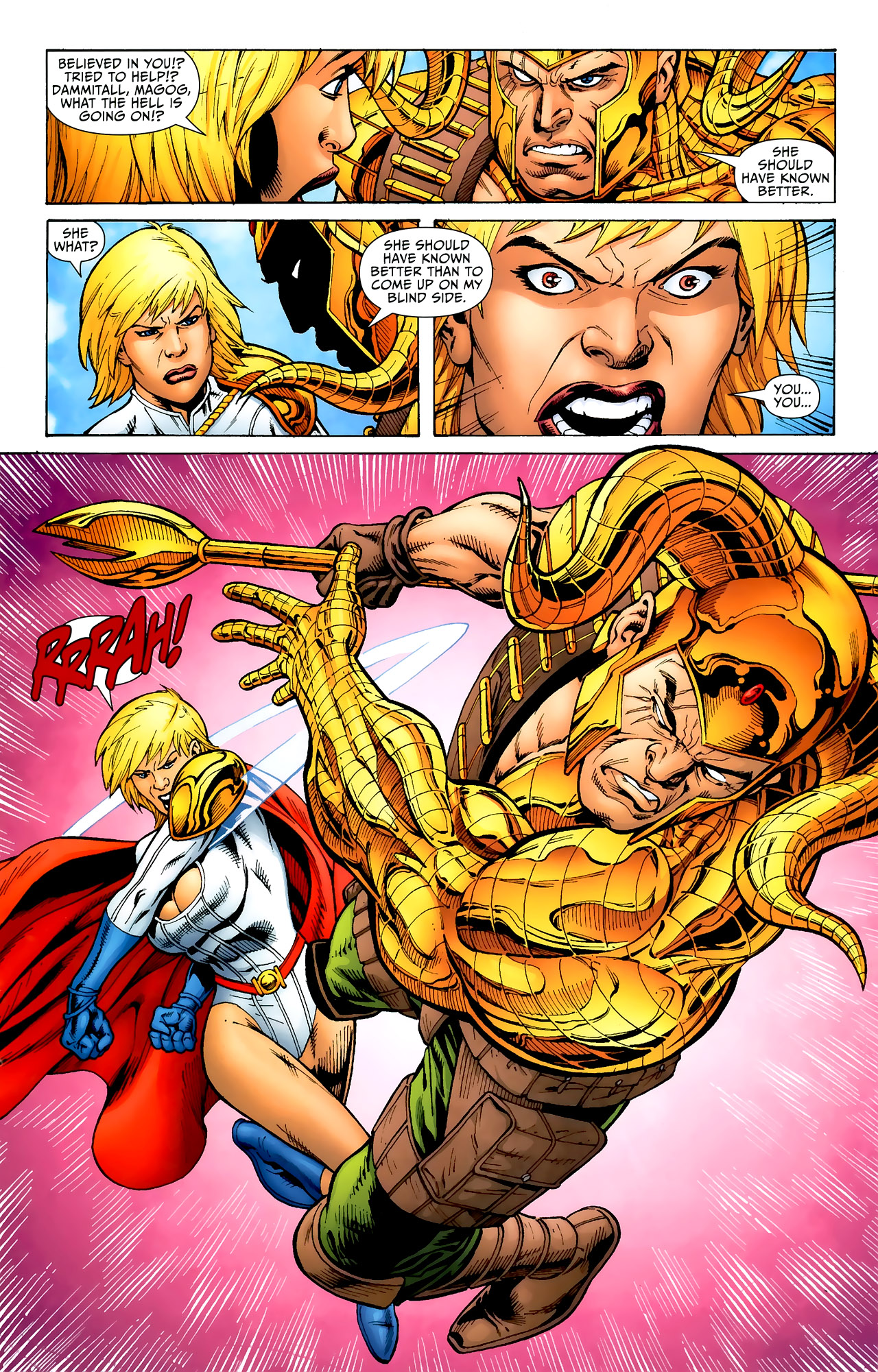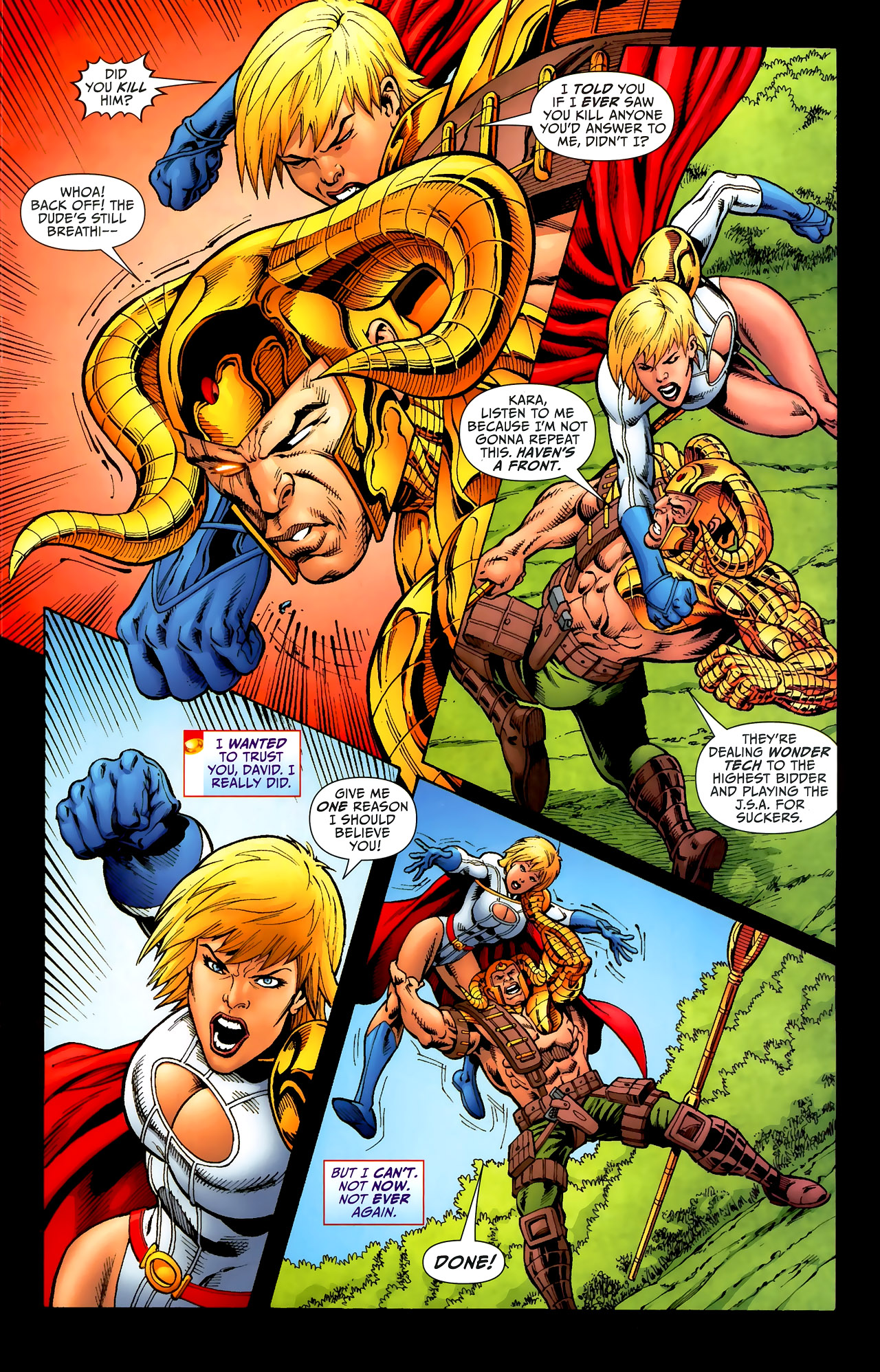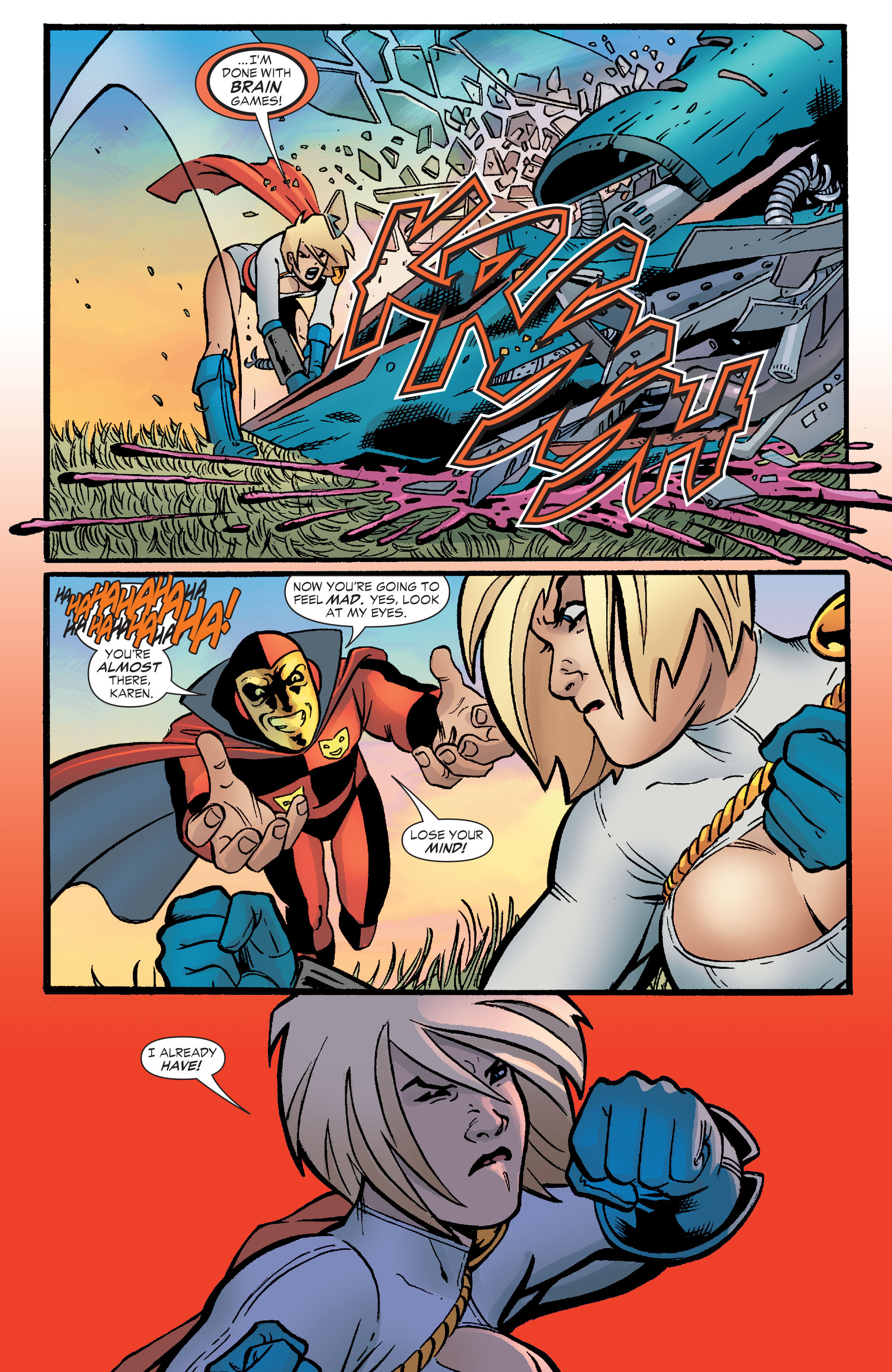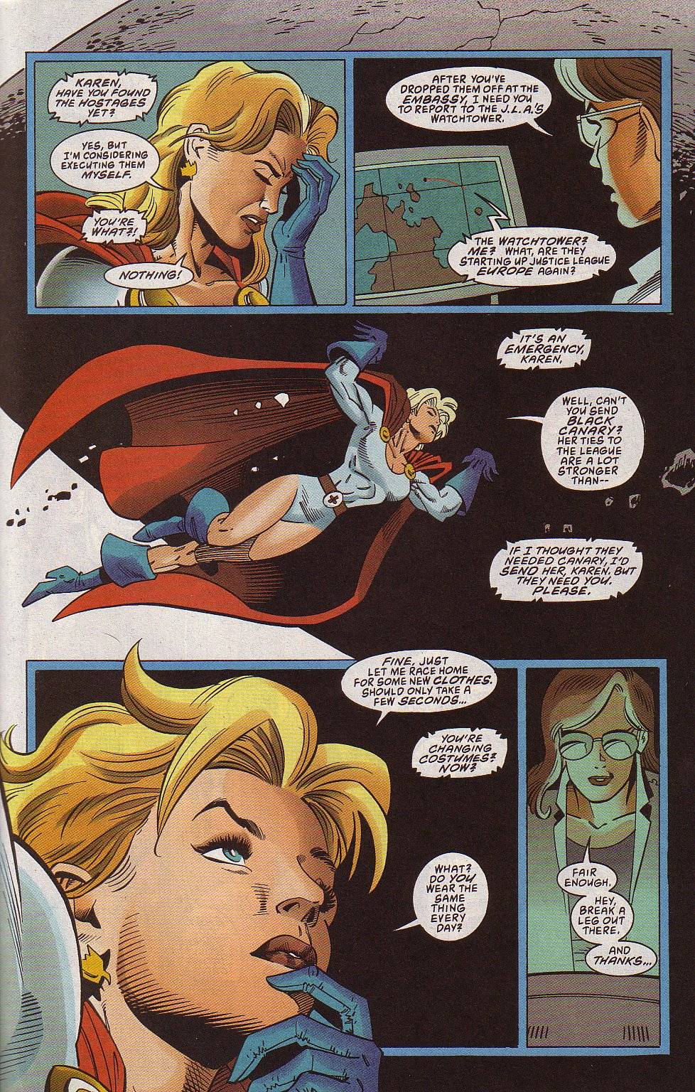 After giving birth, she mellowed out a bit, with her temper only coming out whenever her son was threatened. Even after learning the truth behind the baby’s conception (her grandfather mystically impregnating her with demon DNA against her will), it didn’t change her instincts towards him. When he died after fulfilling his purpose, Power Girl fell into a state of depression that left her moody and antisocial. This (and any acknowledgement of this plotline) vanished after Blue Devil tricked her into unleashing her pent-up rage by saying The Flash had spread rumors of them having sex. She then spends the rest of that issue relapsing into her early JLE personality, including her anger at the Flash. Because comedy.