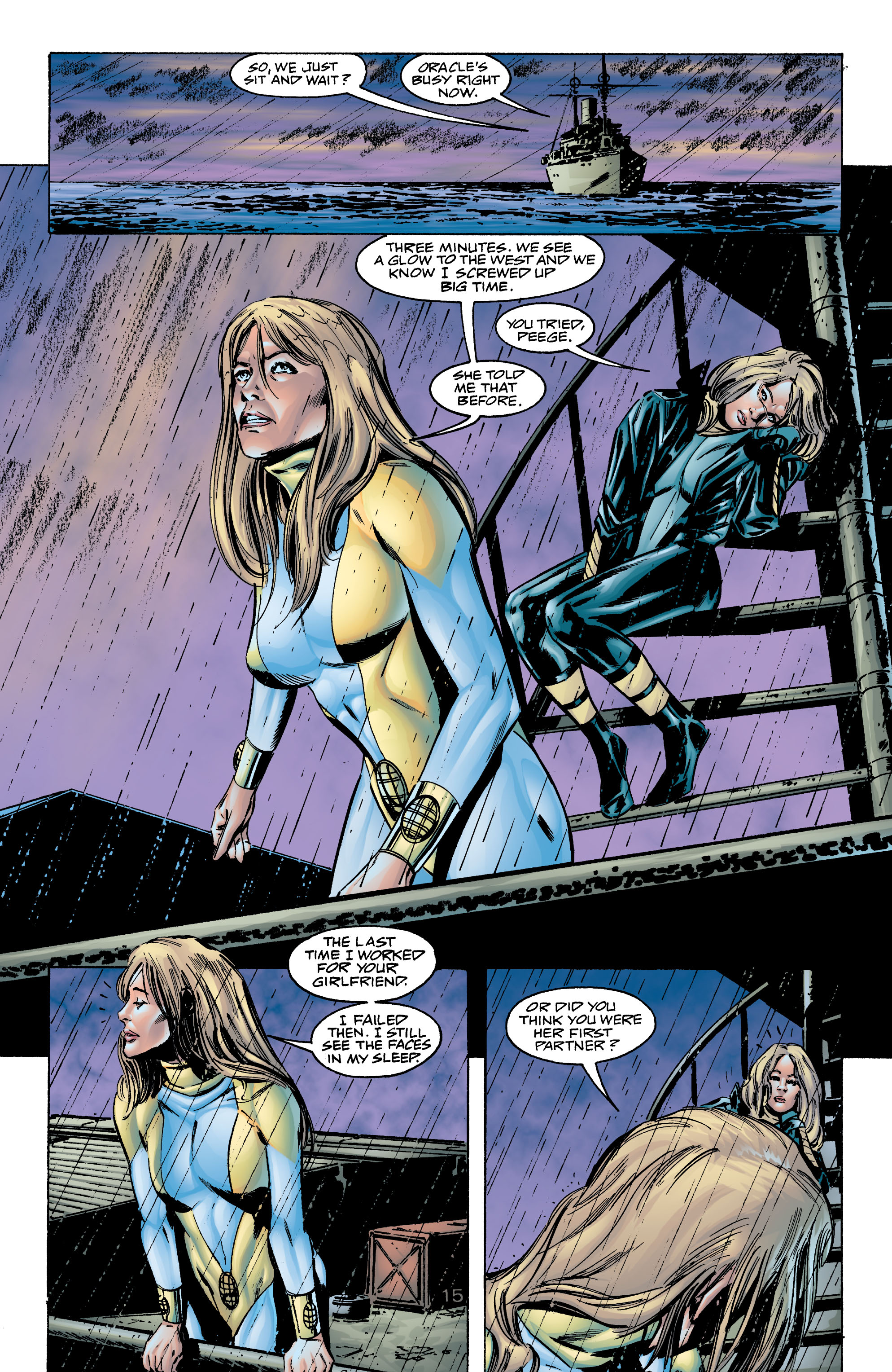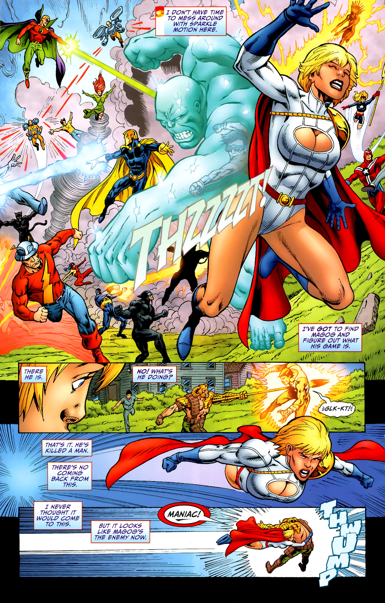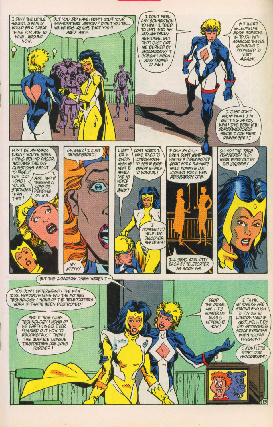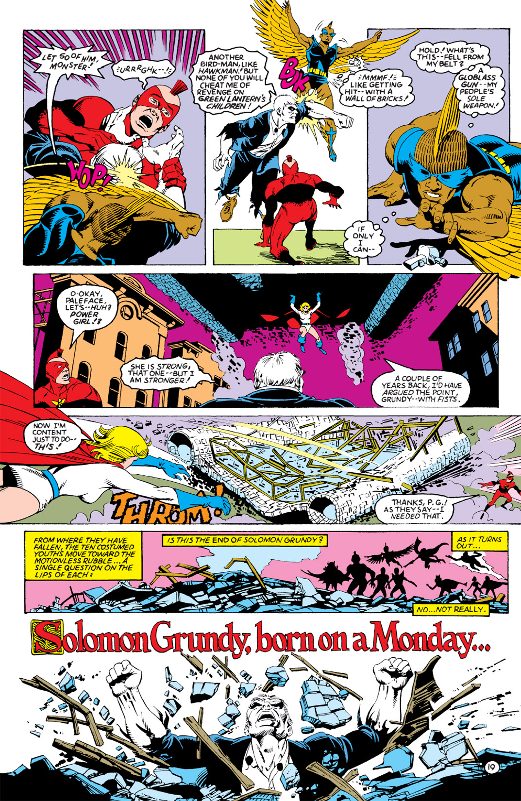 After giving birth, she mellowed out a bit, with her temper only coming out whenever her son was threatened. Even after learning the truth behind the baby’s conception (her grandfather mystically impregnating her with demon DNA against her will), it didn’t change her instincts towards him. When he died after fulfilling his purpose, Power Girl fell into a state of depression that left her moody and antisocial. This (and any acknowledgement of this plotline) vanished after Blue Devil tricked her into unleashing her pent-up rage by saying The Flash had spread rumors of them having sex. She then spends the rest of that issue relapsing into her early JLE personality, including her anger at the Flash. Because comedy.