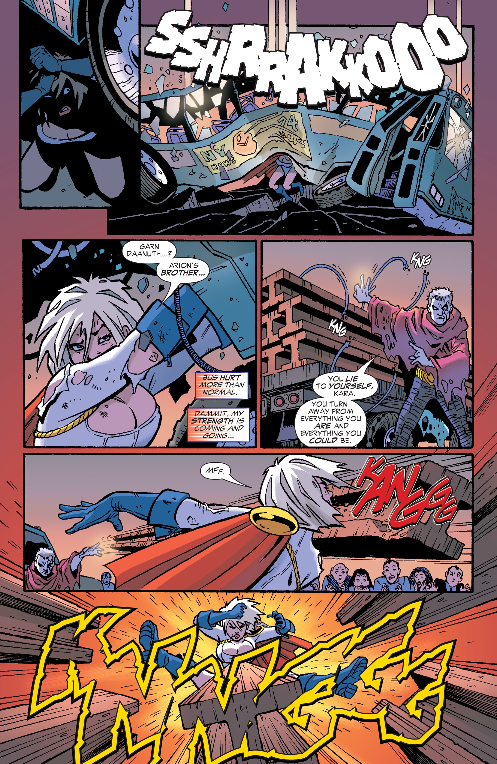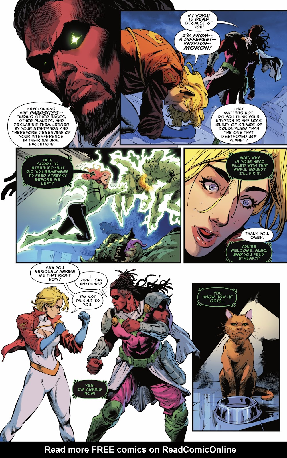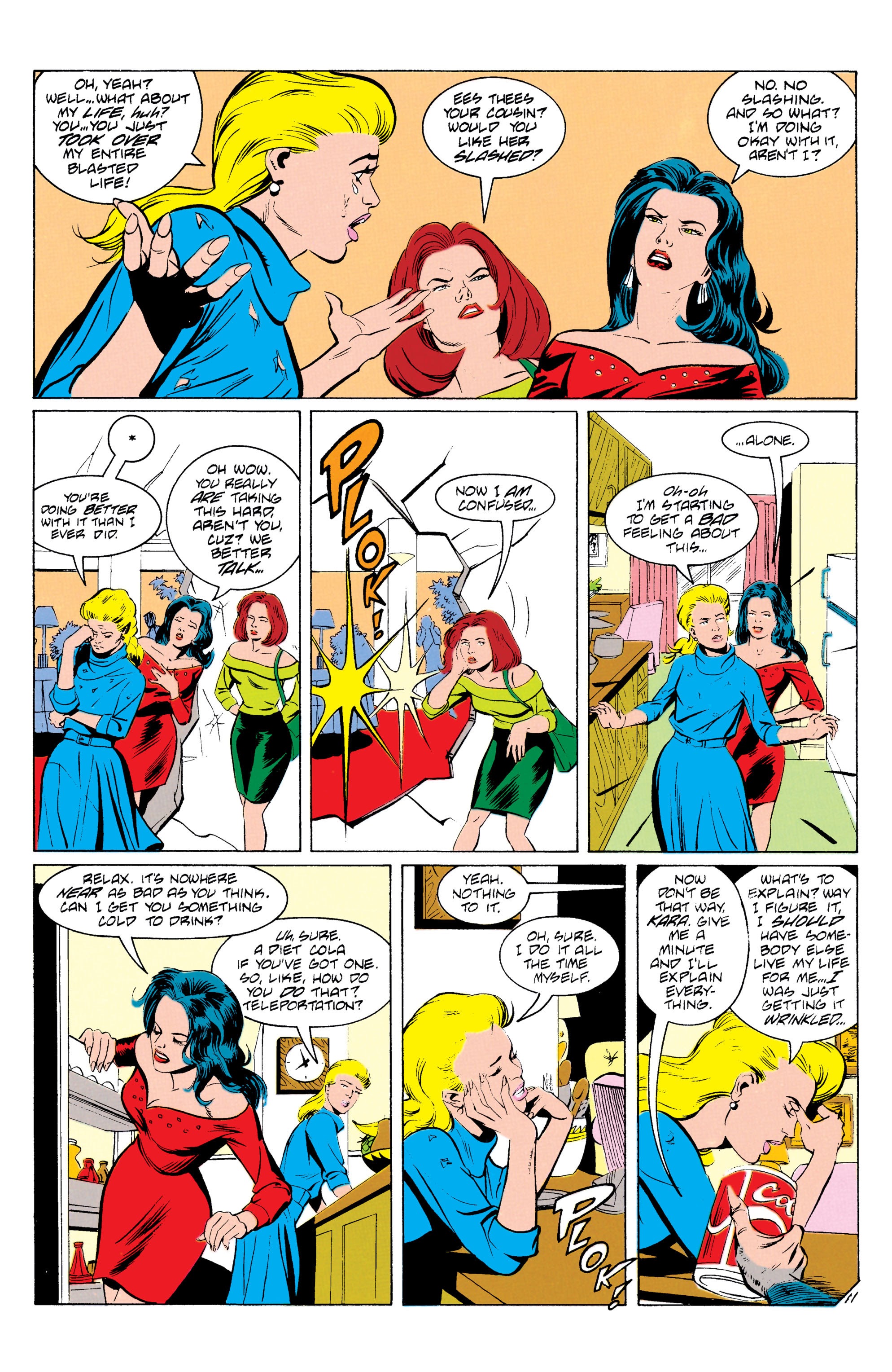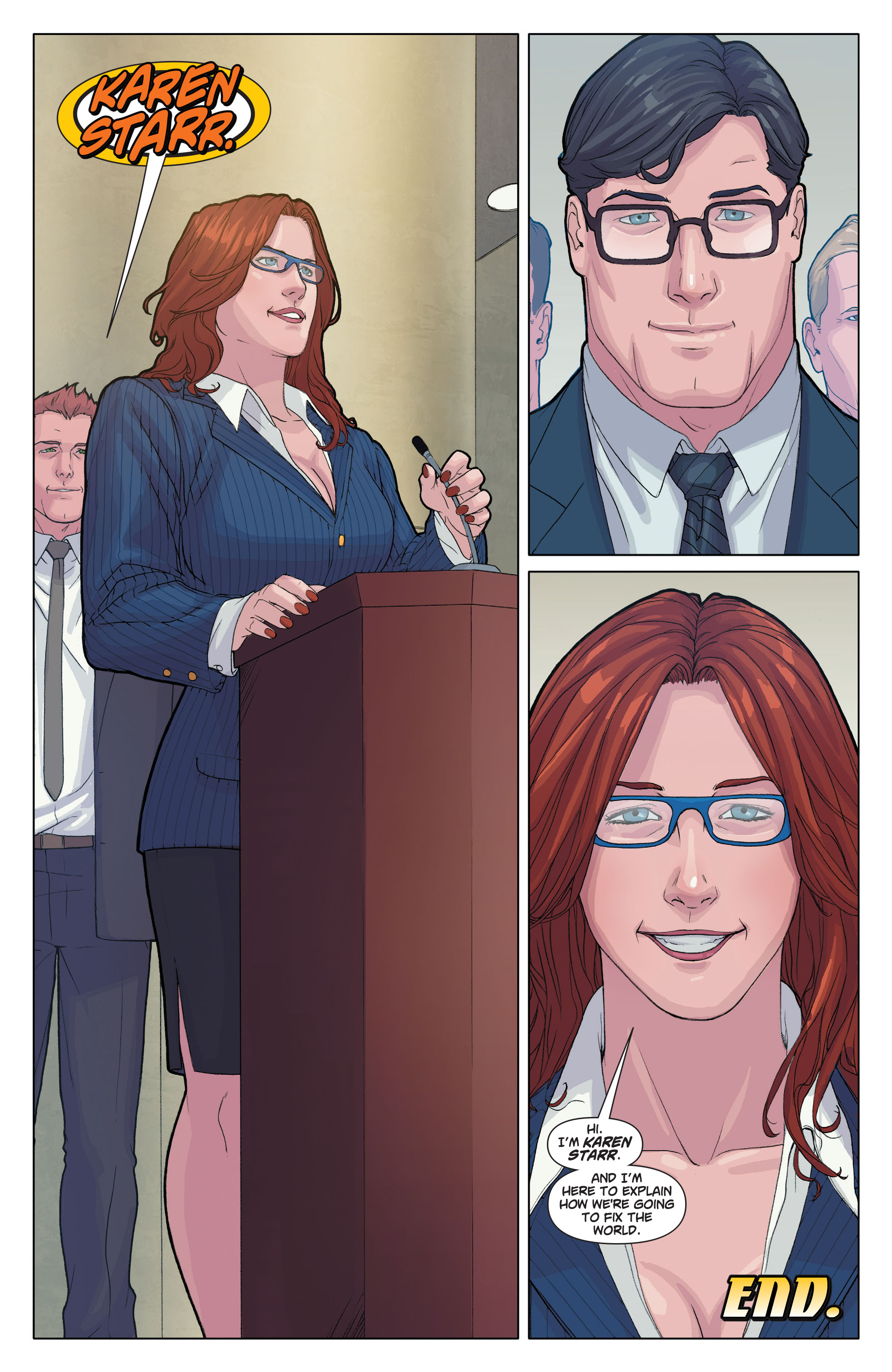 Despite having a perfectly normal relationship before, now she doesn’t see herself as part of Superman’s family because she thinks they don’t care about her. And she doesn’t want to go by “Karen Starr” anymore because Starrware no longer exists (despite previously using the name even long after the company collapsed). Now she wants to go by “Paige” because Superman’s son is a fucking idiot that thinks “Peeg” sounds like “Paige.”