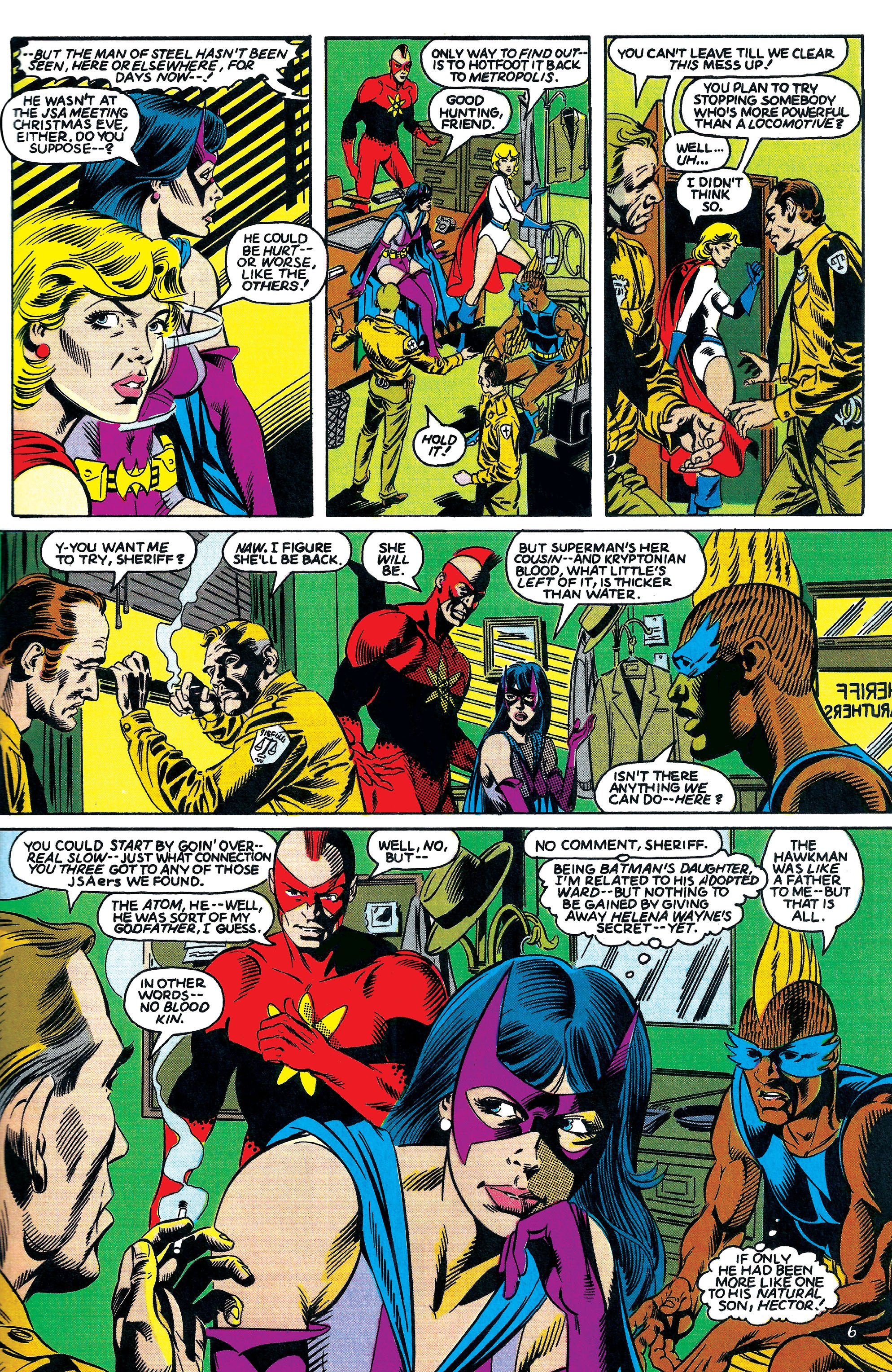 When she wasn’t saving the world, Kara spent most of her time trying to become more familiar with Earth’s culture, mainly through the civilian disguise of software engineer Karen Starr. These efforts were aided by a growing friendship with Huntress, a fellow JSA member and daughter of the deceased Batman and Catwoman. At one point, they even decided to leave the JSA together, claiming they felt out of place due to their age. They initially tried to make up for this by forming Infinity, Inc, but later rejoined the Society after realizing the Infinitors could handle themselves.
