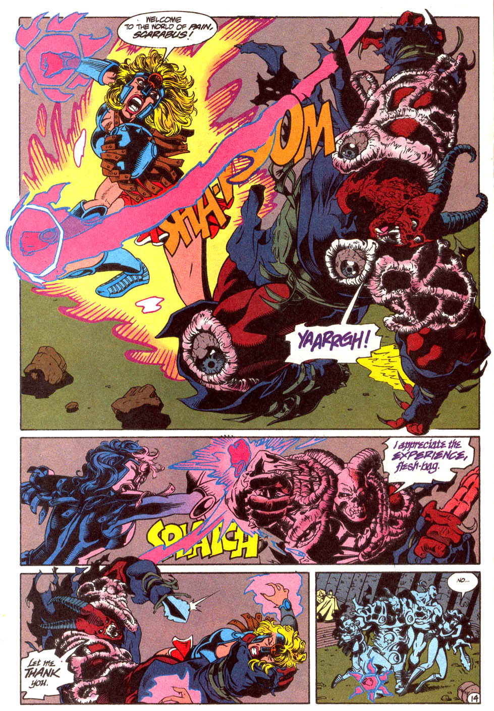 Tears through the hull of Brain Wave’s satellite and punches Degaton.