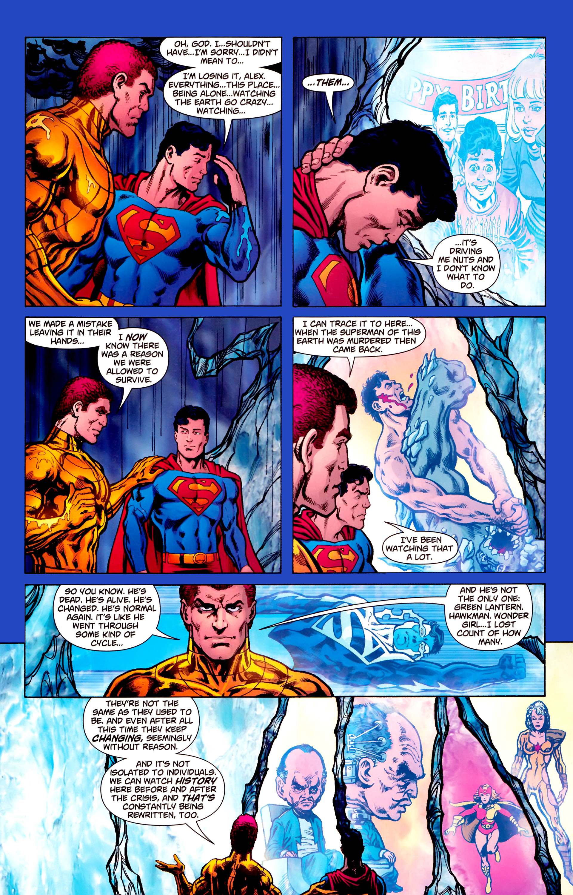 As it turned out, Superman had also survived the Crisis and been living in a paradise dimension with his Lois, Alexander Luthor from Earth-Three, and Superboy from Earth-Prime. During this conversation, Geoff Johns would solidify the restoration of her old history by revealing her Atlantean memories were fabricated and having her regain all of her Pre-Crisis memories.