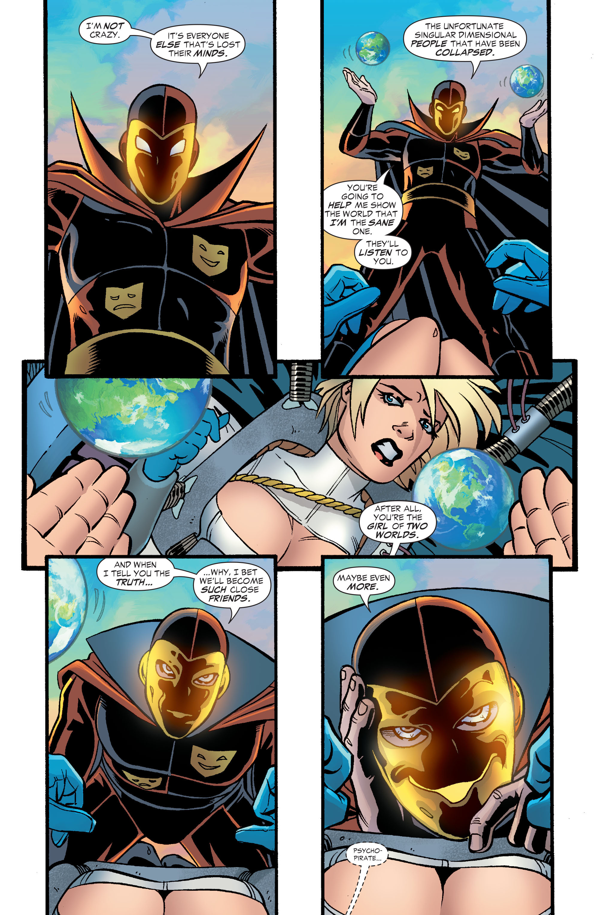 Following this, JSA Classified #1 would establish that Power Girl could still recall her “false” Kryptonian memories, with Issue #4 revealing that fellow Crisis survivor Psycho Pirate still remembered the events of the previous world and that Karen subconsciously remembered her Pre-Crisis history. Psycho Pirate attempted to exploit this by creating psychic illusions of her past friends and enemies, trying to drive her insane by making her doubt her past. His efforts failed, and instead of losing her mind, they only pointed her in the right direction, because right after his attack, she was reunited with the Superman from Earth-Two.