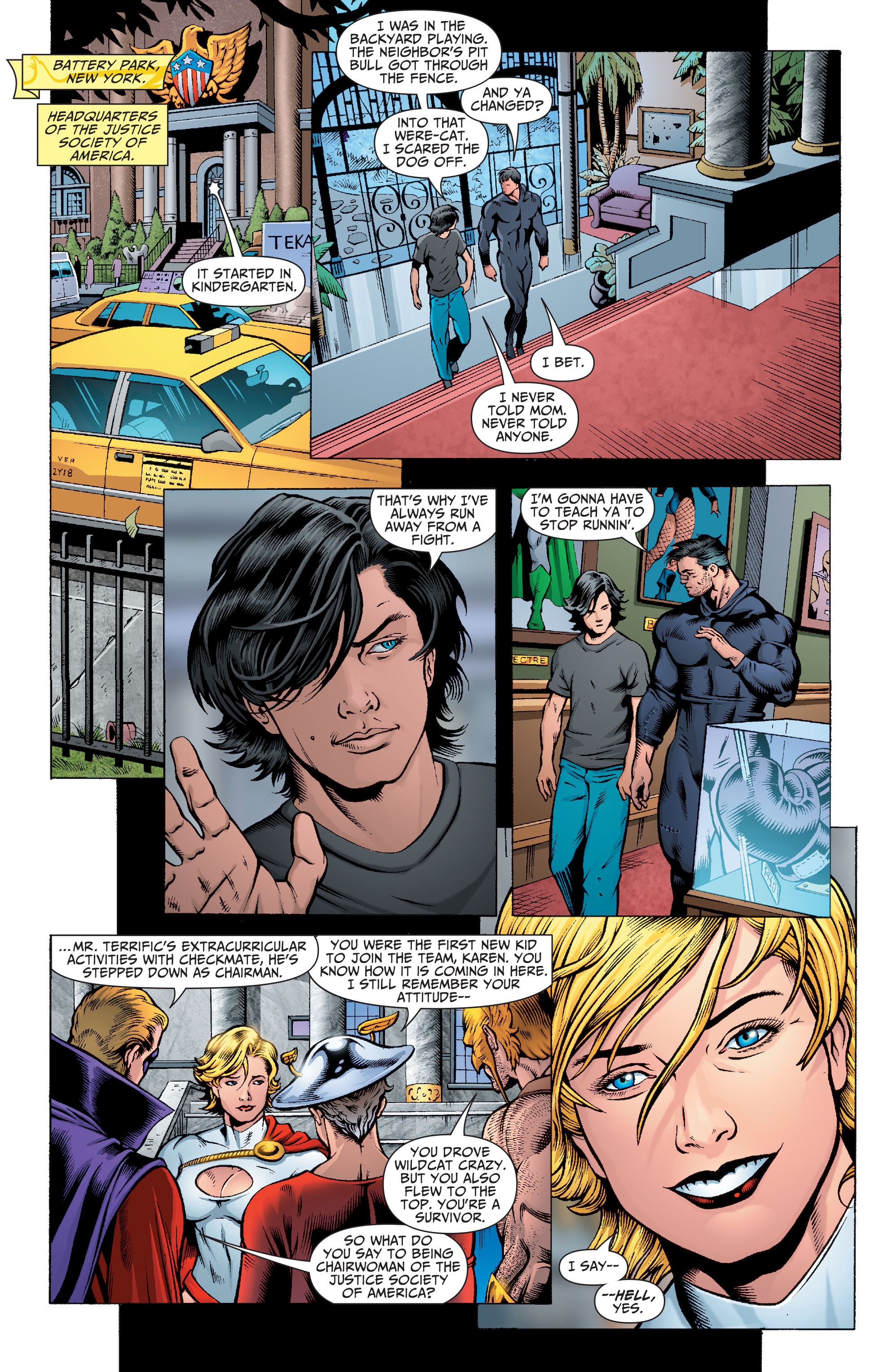 The treatment she received from the rest of the JSA often led to her refusing their help so she could accomplish tasks on her own, or taking charge against an enemy. This headstrong nature would sometimes cause her to butt heads with her teammates, mostly Wildcat, who looked down on her for being too young and a woman. This attitude would often lead to him being the subject of her anger, teasing, and jabs; and it also made her act a bit harder towards men.