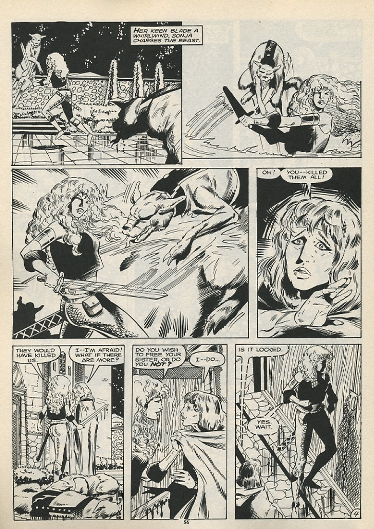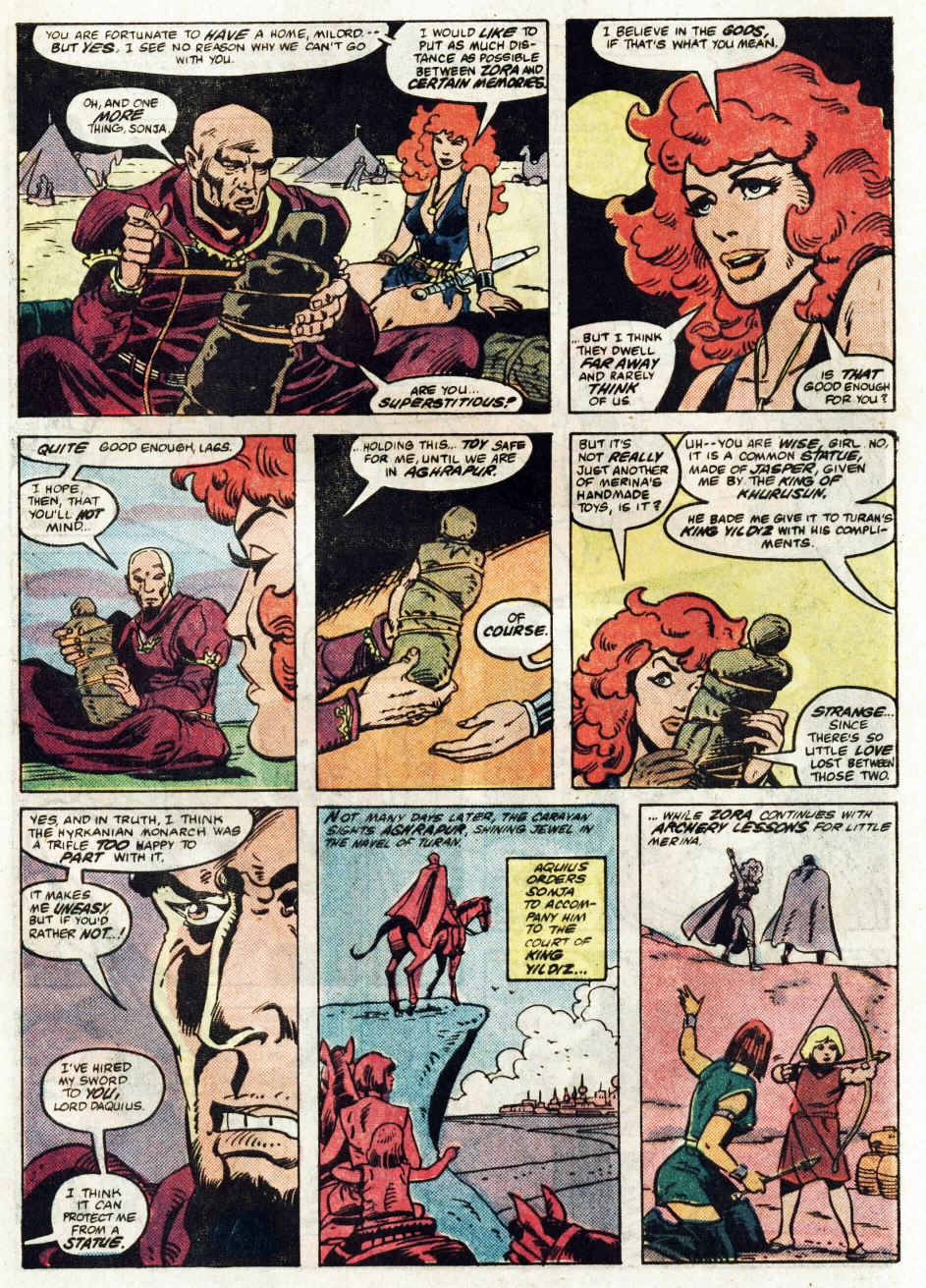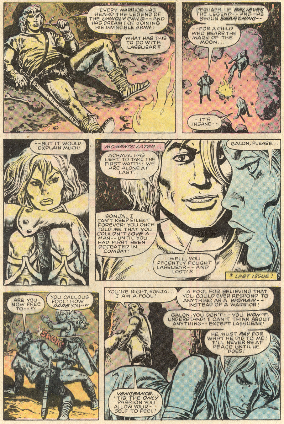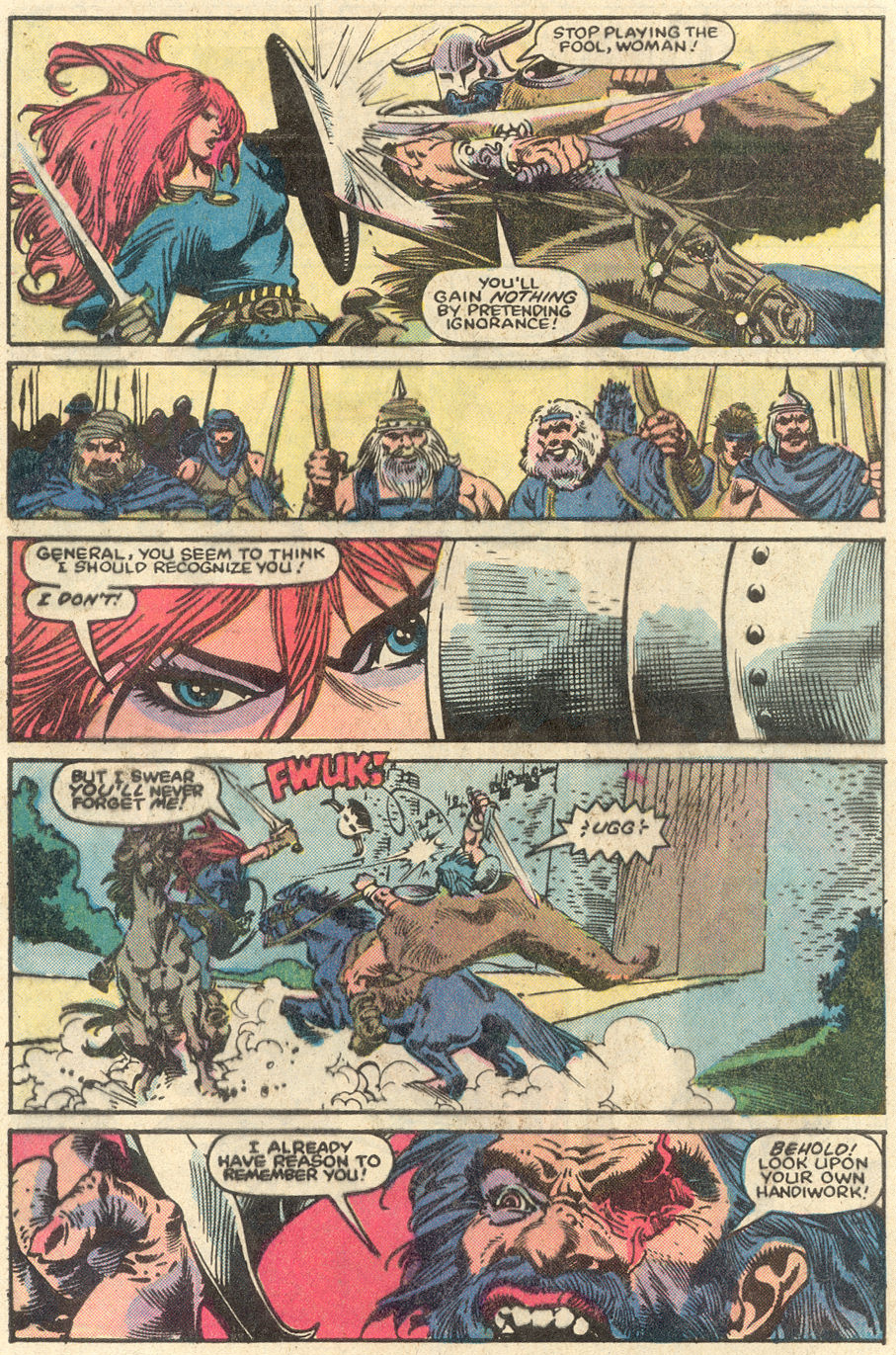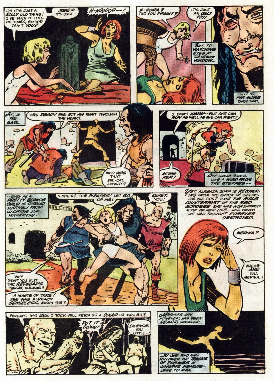 - Marvel Comics Super Special #9, Red Sonja (Volume 2) #1, and Savage Sword of Conan #230 claim she killed her rapist and that he was her first victim, but these claims are blatantly contradicted by the above story. It’s likely the writers confused him for her actual first victim, one of his men.