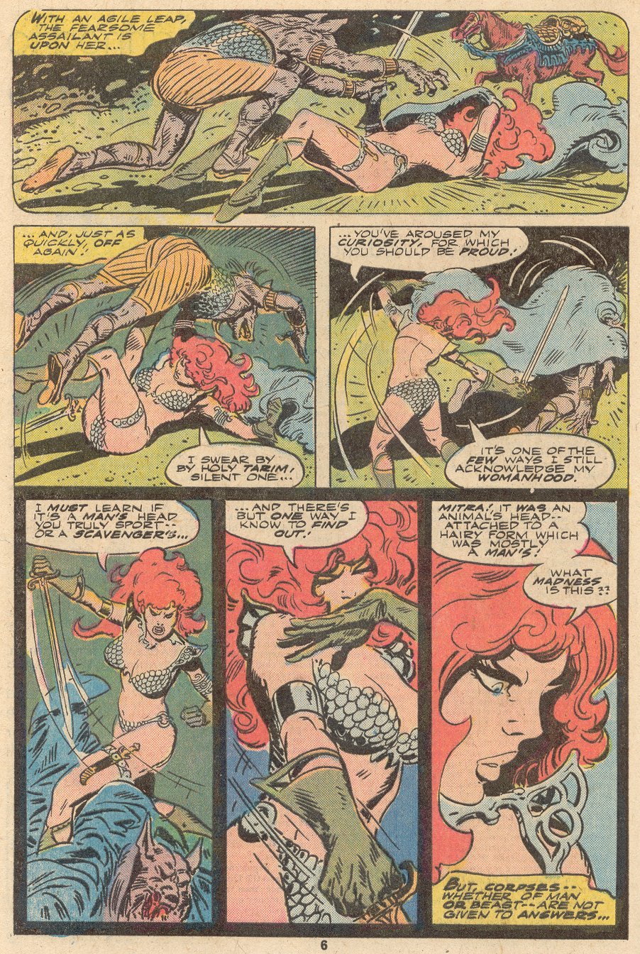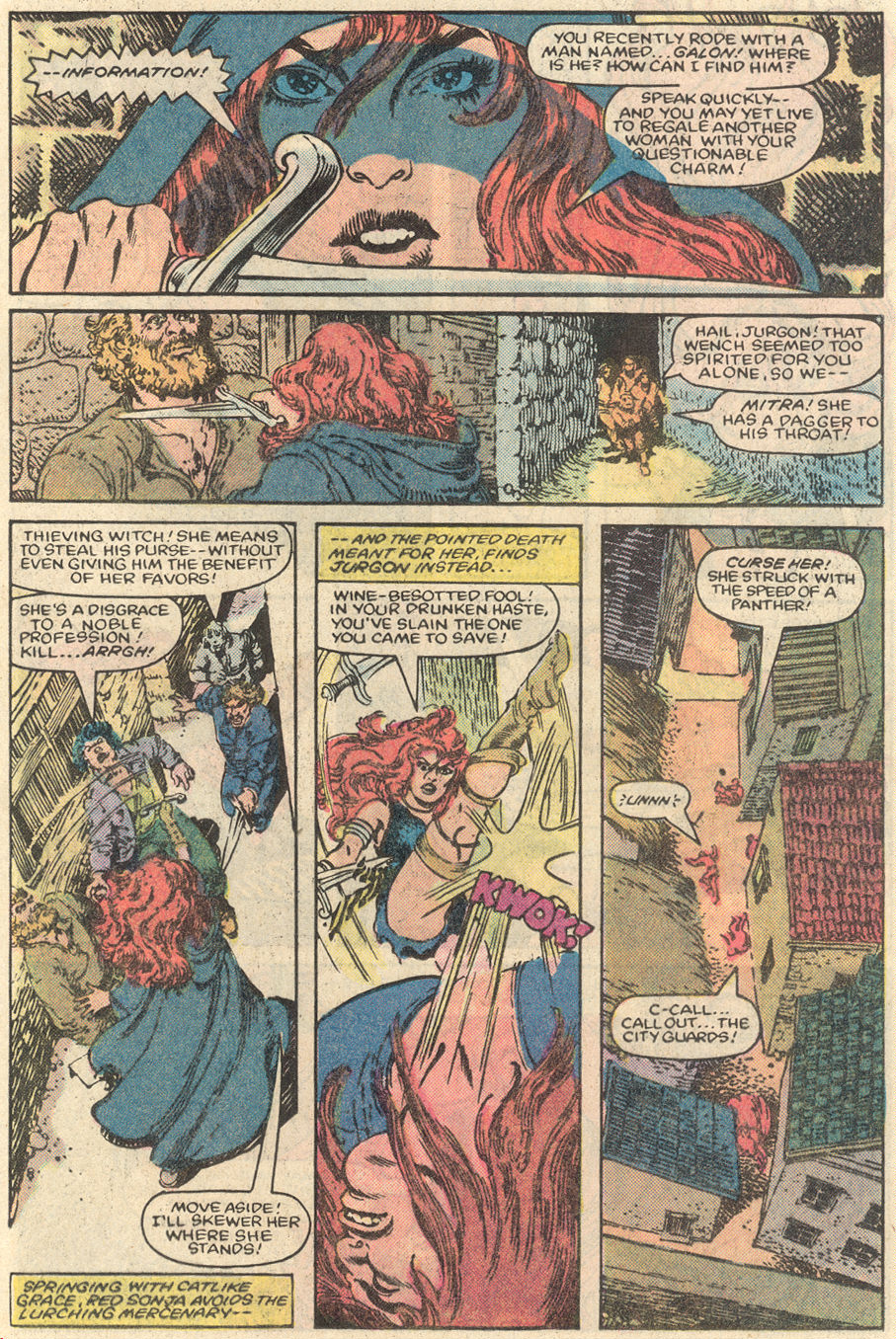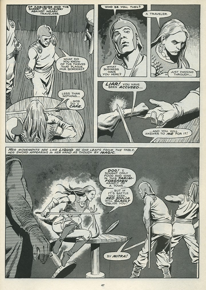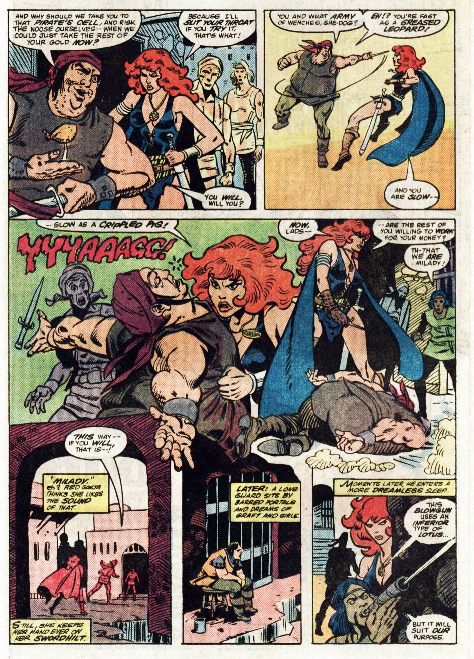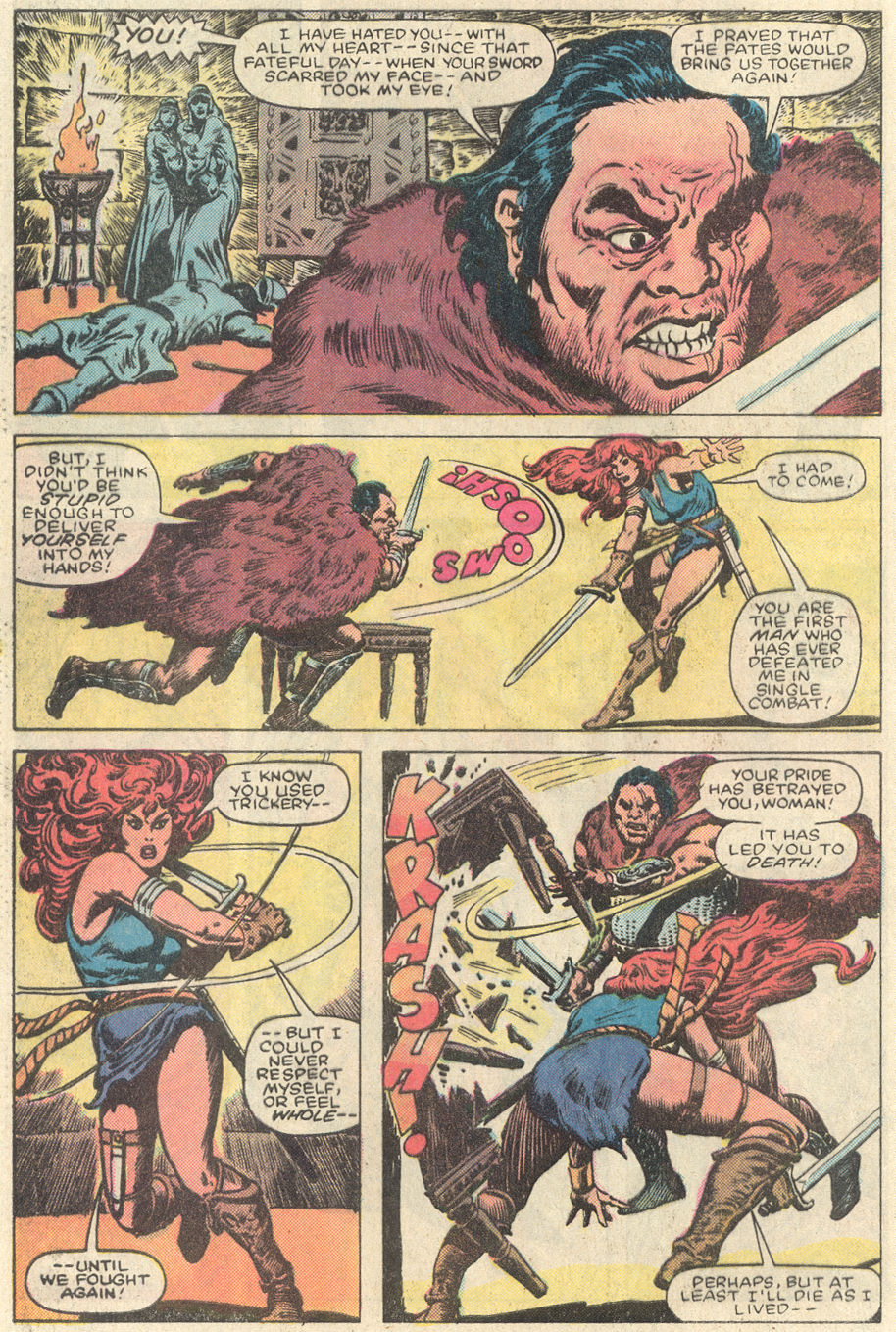 - Marvel Comics Super Special #9, Red Sonja (Volume 2) #1, and Savage Sword of Conan #230 claim she killed her rapist and that he was her first victim, but these claims are blatantly contradicted by the above story. It’s likely the writers confused him for her actual first victim, one of his men.