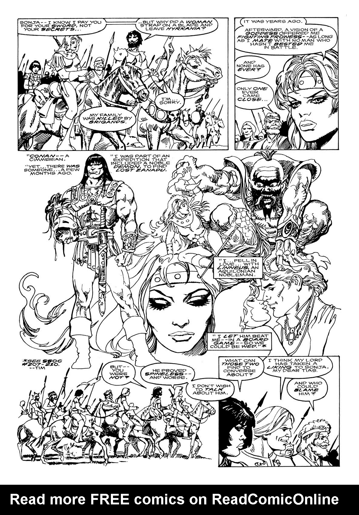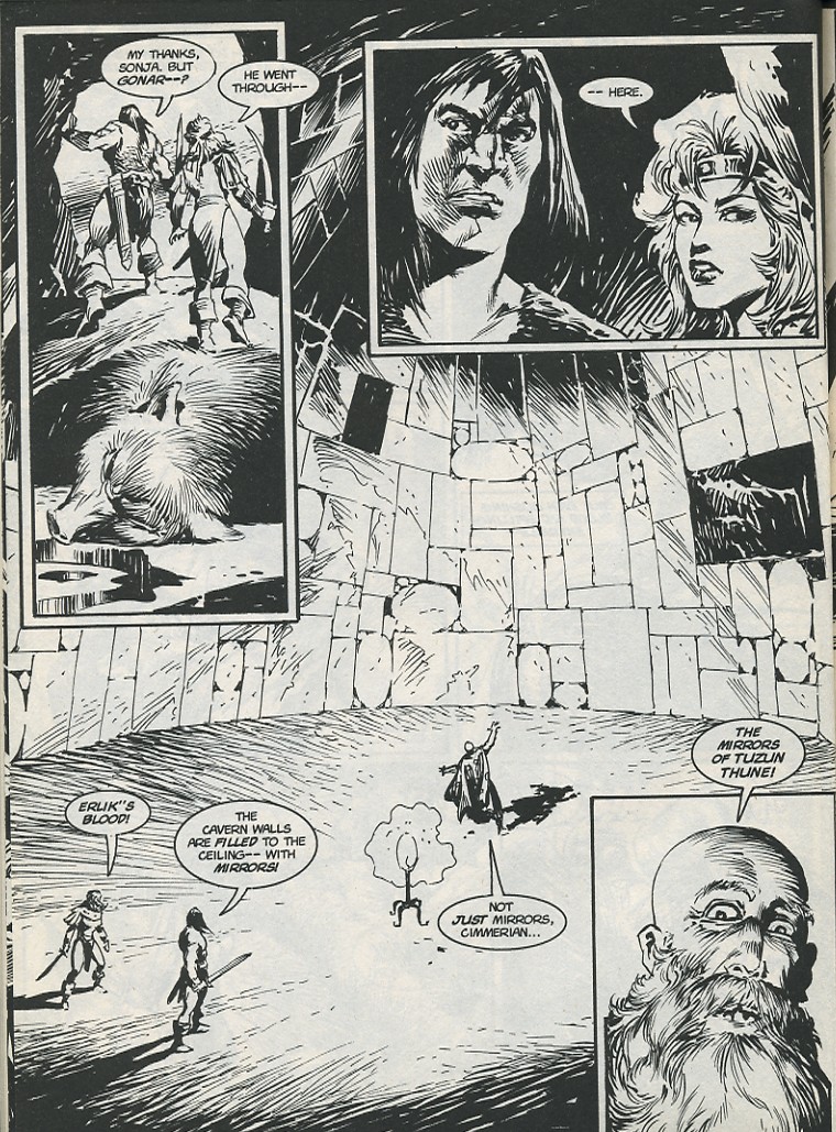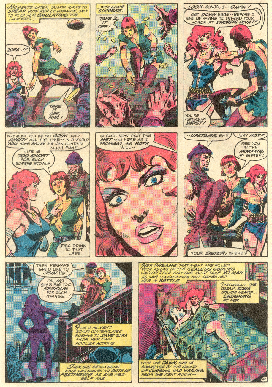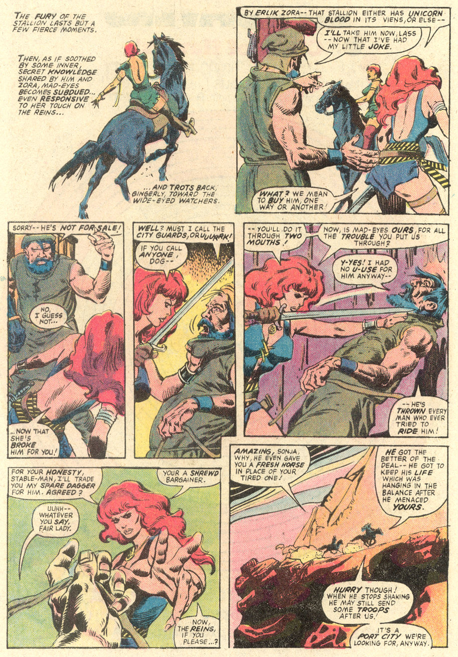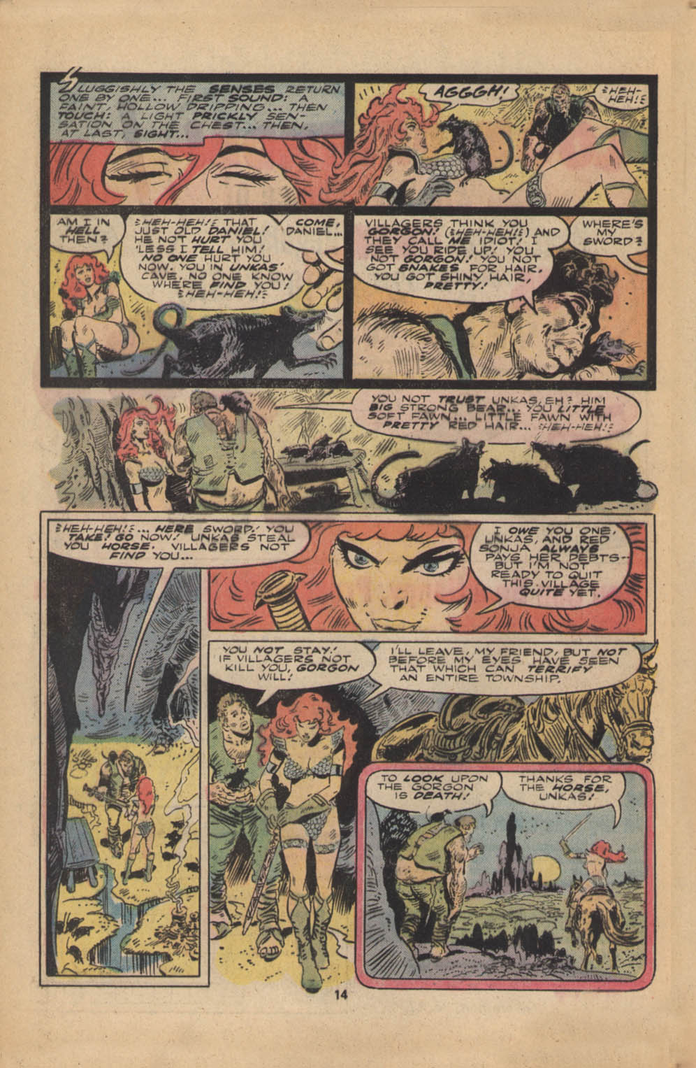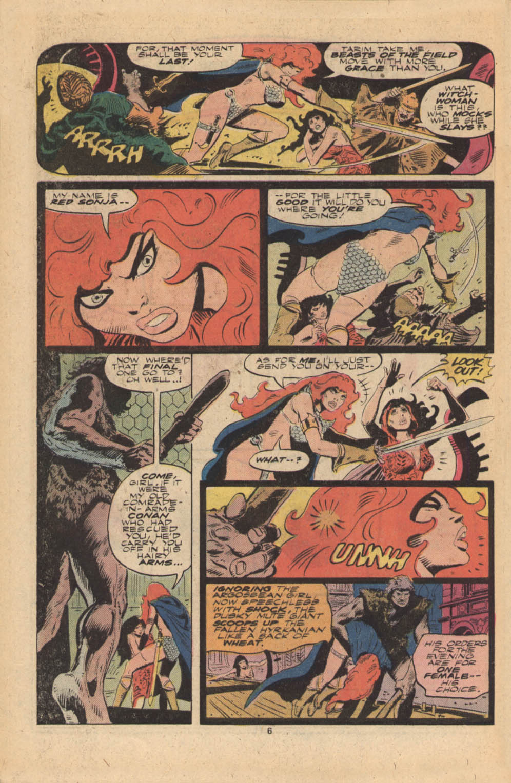 - Marvel Comics Super Special #9, Red Sonja (Volume 2) #1, and Savage Sword of Conan #230 claim she killed her rapist and that he was her first victim, but these claims are blatantly contradicted by the above story. It’s likely the writers confused him for her actual first victim, one of his men.