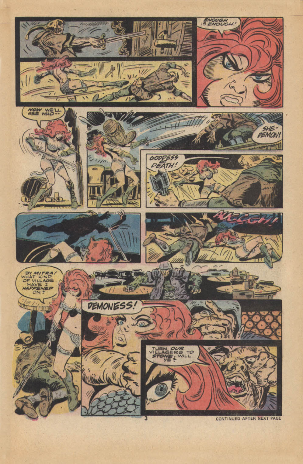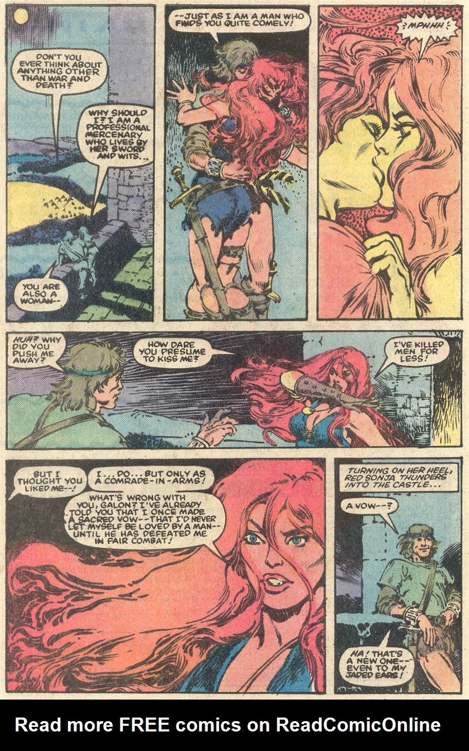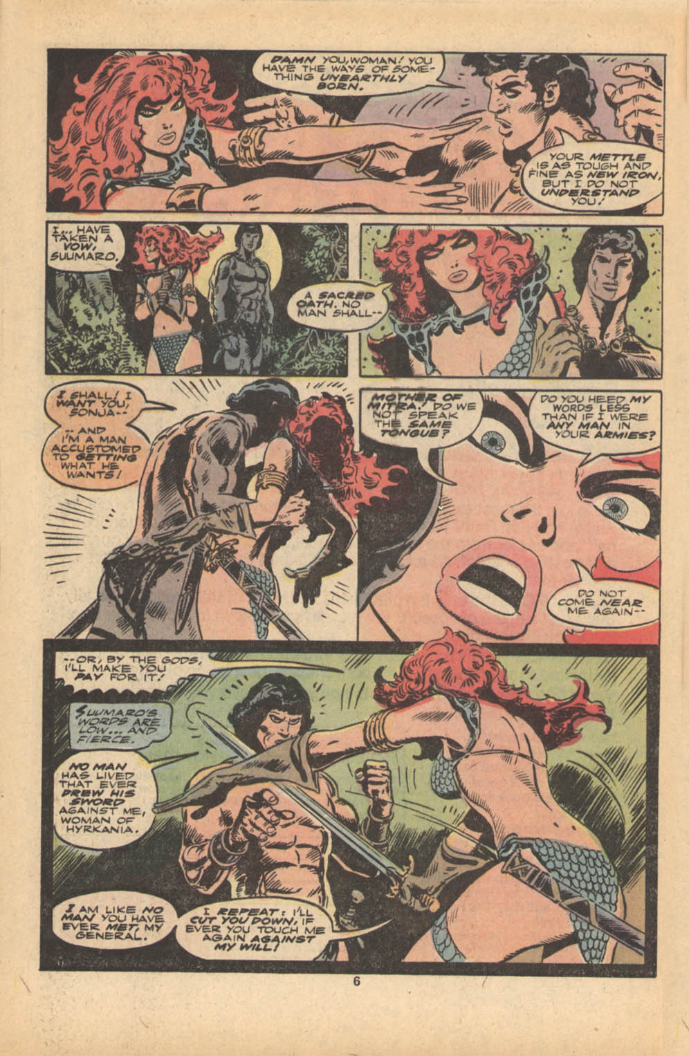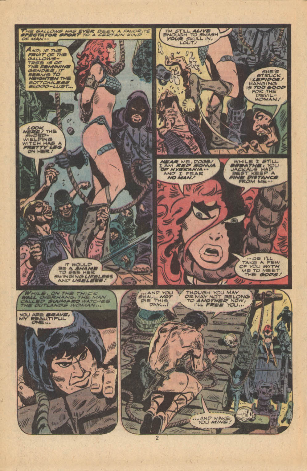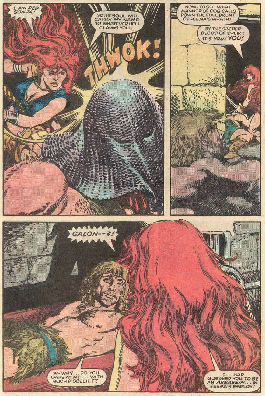 - Marvel Comics Super Special #9, Red Sonja (Volume 2) #1, and Savage Sword of Conan #230 claim she killed her rapist and that he was her first victim, but these claims are blatantly contradicted by the above story. It’s likely the writers confused him for her actual first victim, one of his men.
