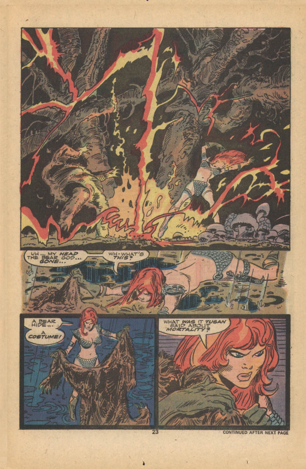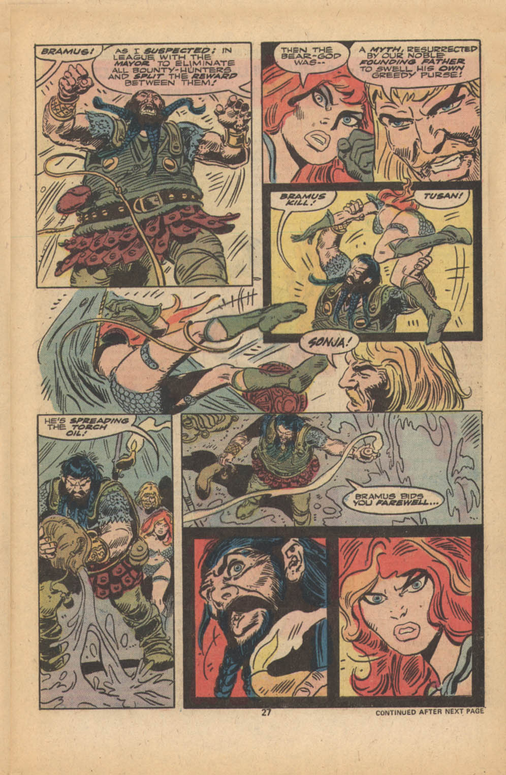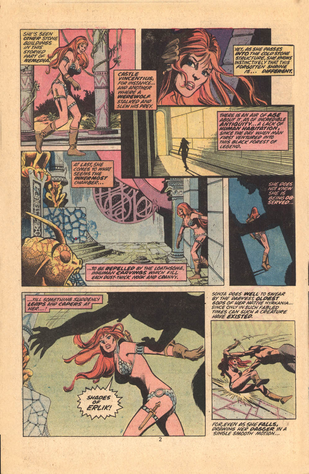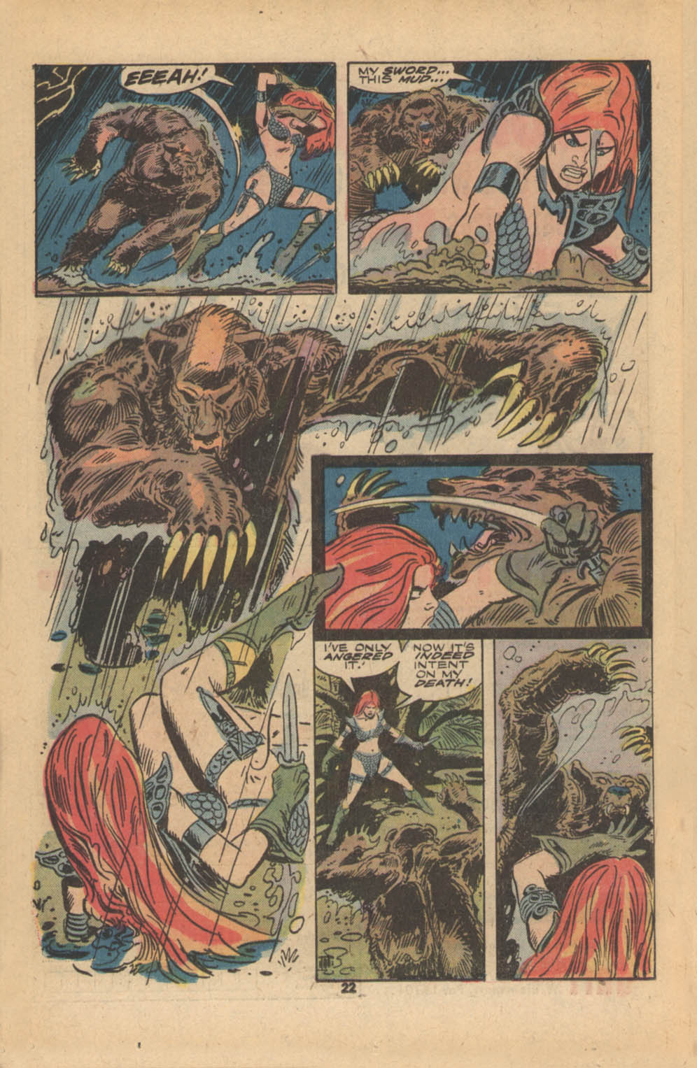 - Marvel Comics Super Special #9, Red Sonja (Volume 2) #1, and Savage Sword of Conan #230 claim she killed her rapist and that he was her first victim, but these claims are blatantly contradicted by the above story. It’s likely the writers confused him for her actual first victim, one of his men.