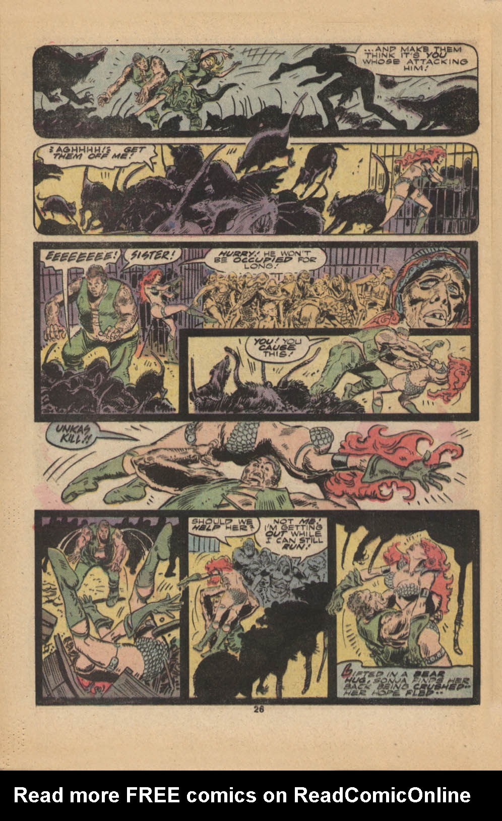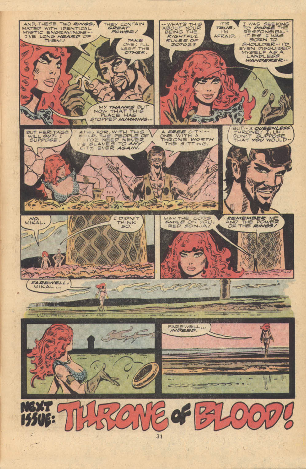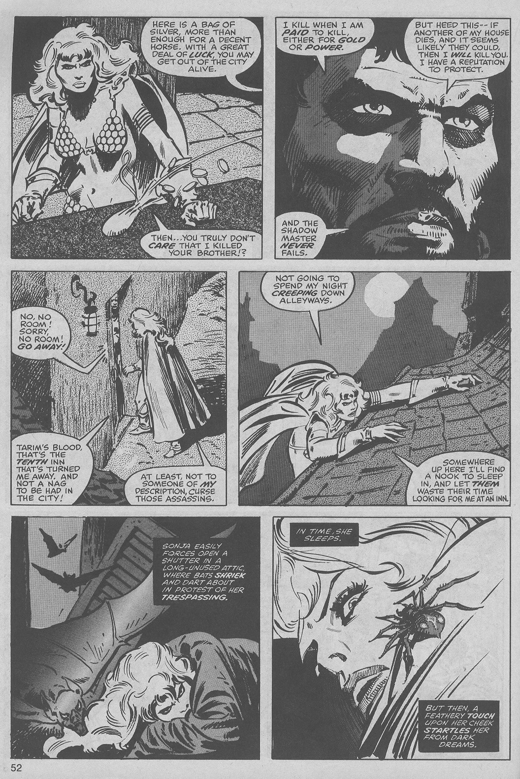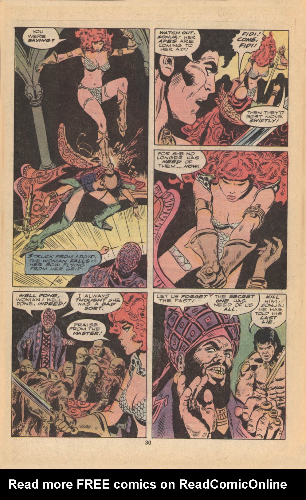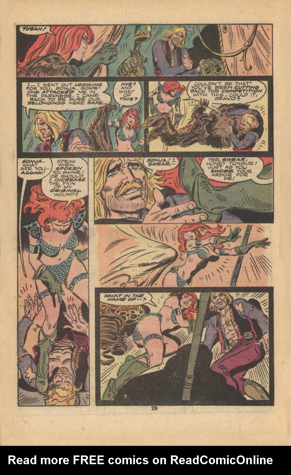 - Marvel Comics Super Special #9, Red Sonja (Volume 2) #1, and Savage Sword of Conan #230 claim she killed her rapist and that he was her first victim, but these claims are blatantly contradicted by the above story. It’s likely the writers confused him for her actual first victim, one of his men.
