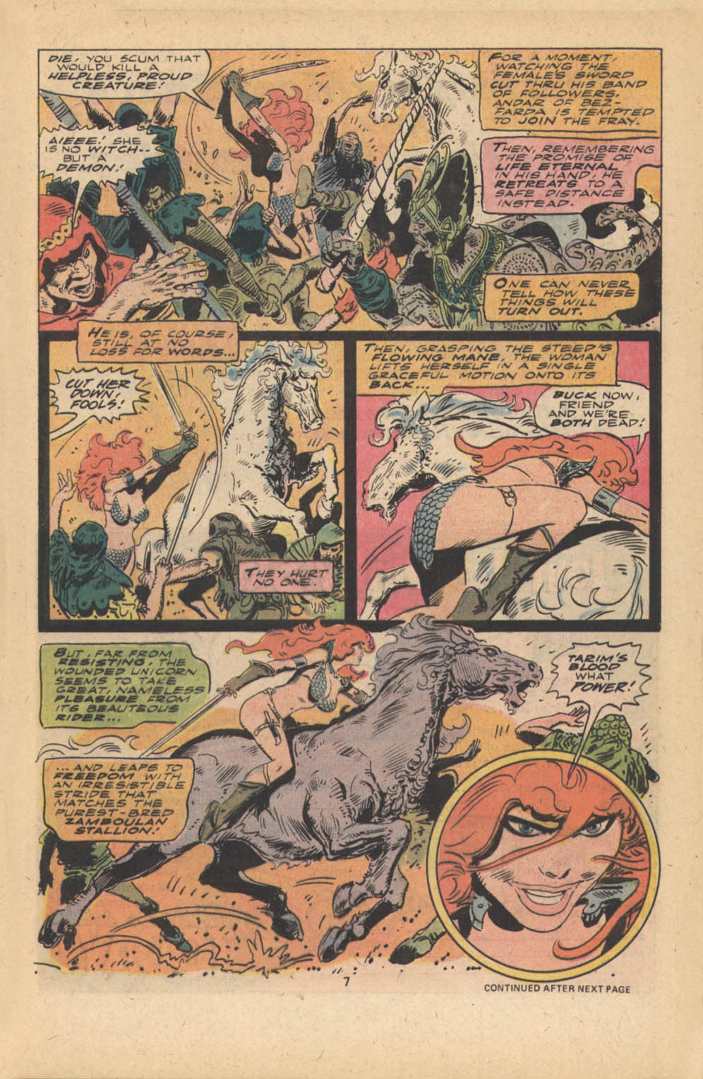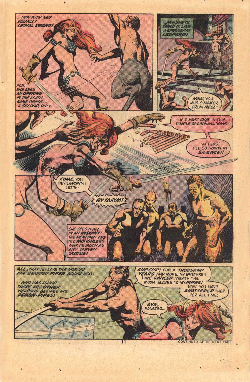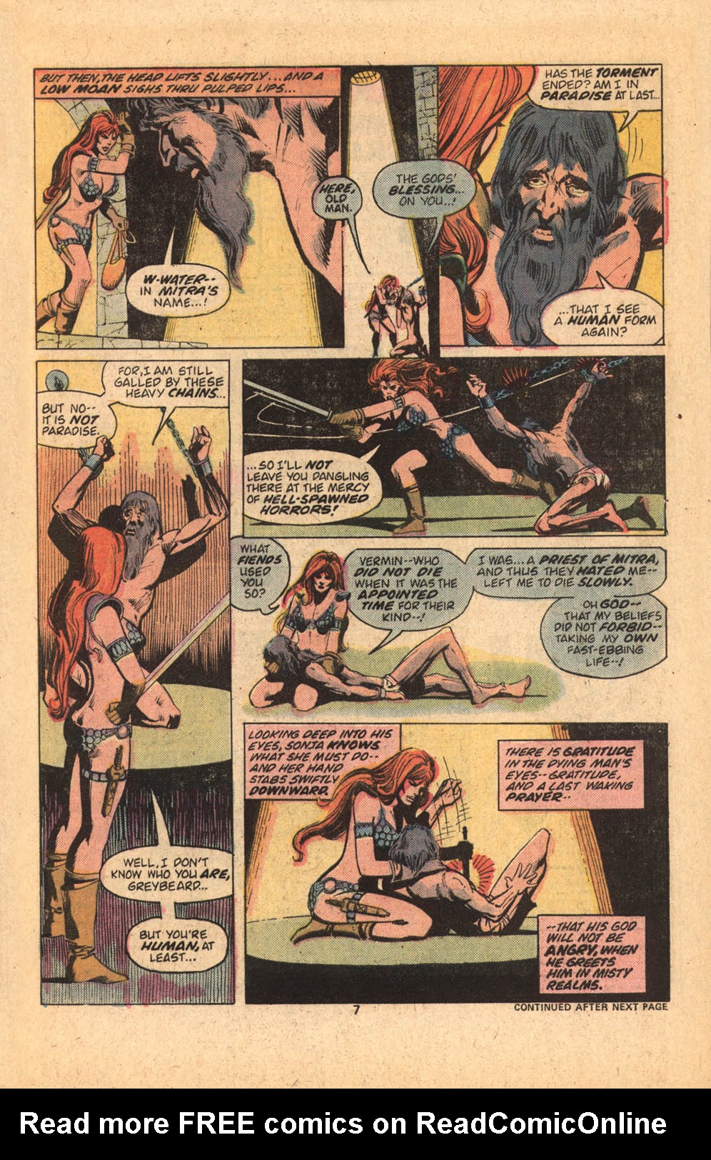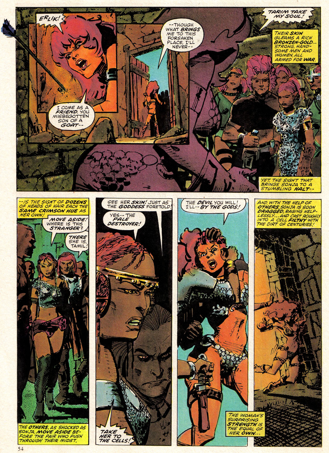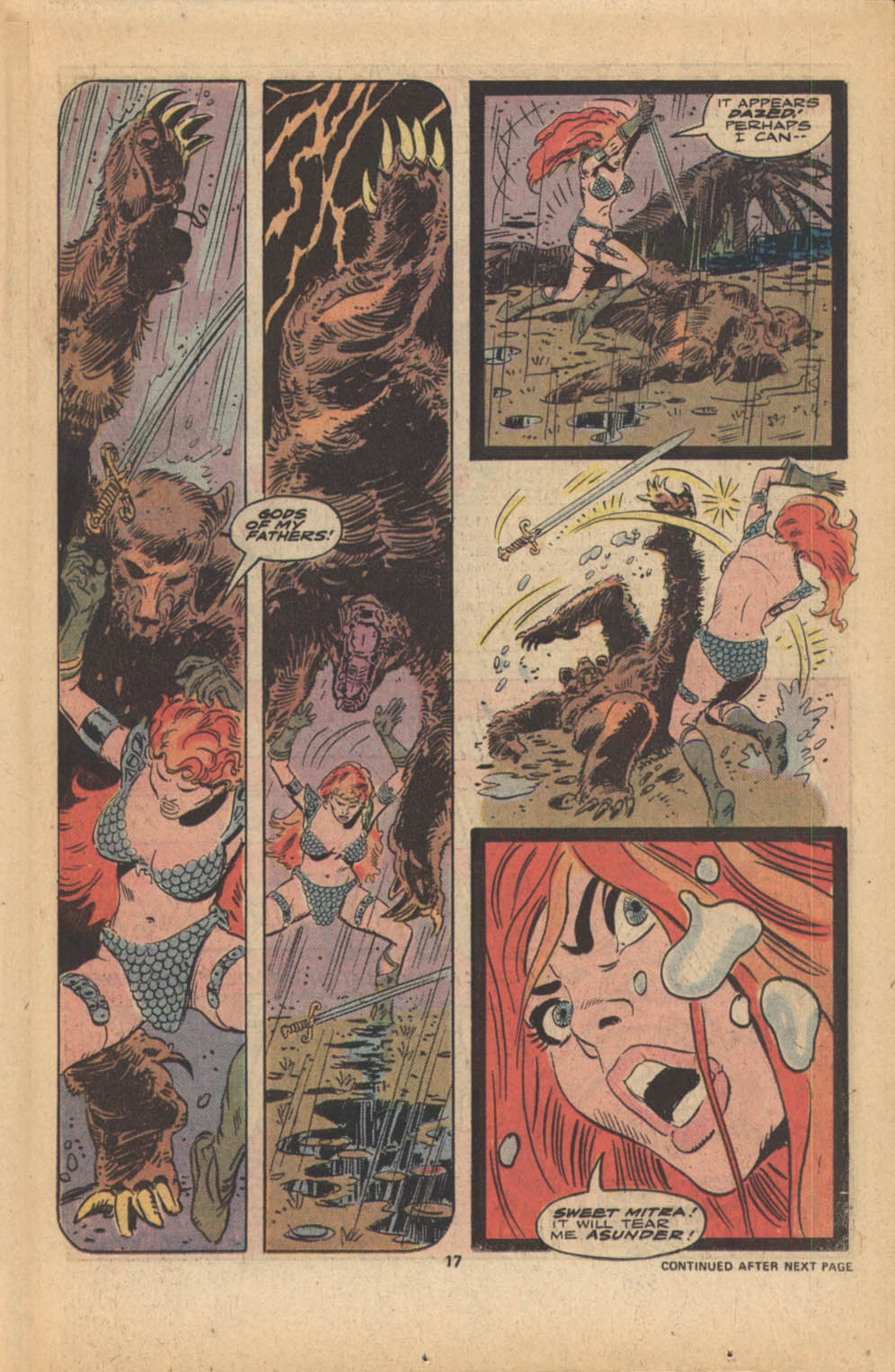 - Marvel Comics Super Special #9, Red Sonja (Volume 2) #1, and Savage Sword of Conan #230 claim she killed her rapist and that he was her first victim, but these claims are blatantly contradicted by the above story. It’s likely the writers confused him for her actual first victim, one of his men.
