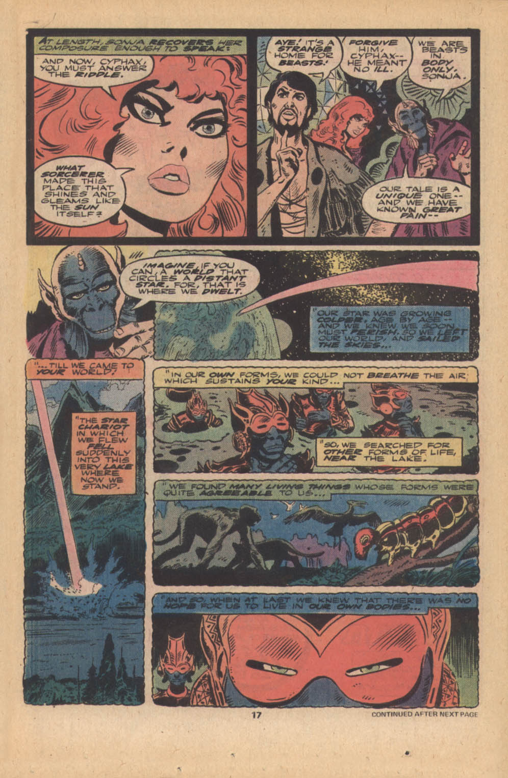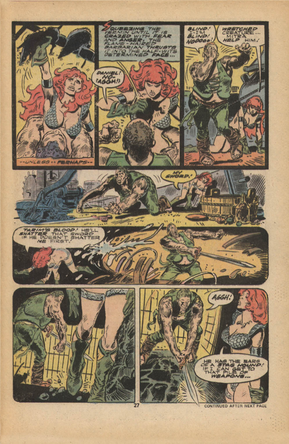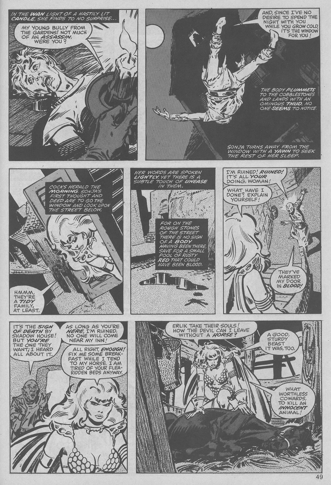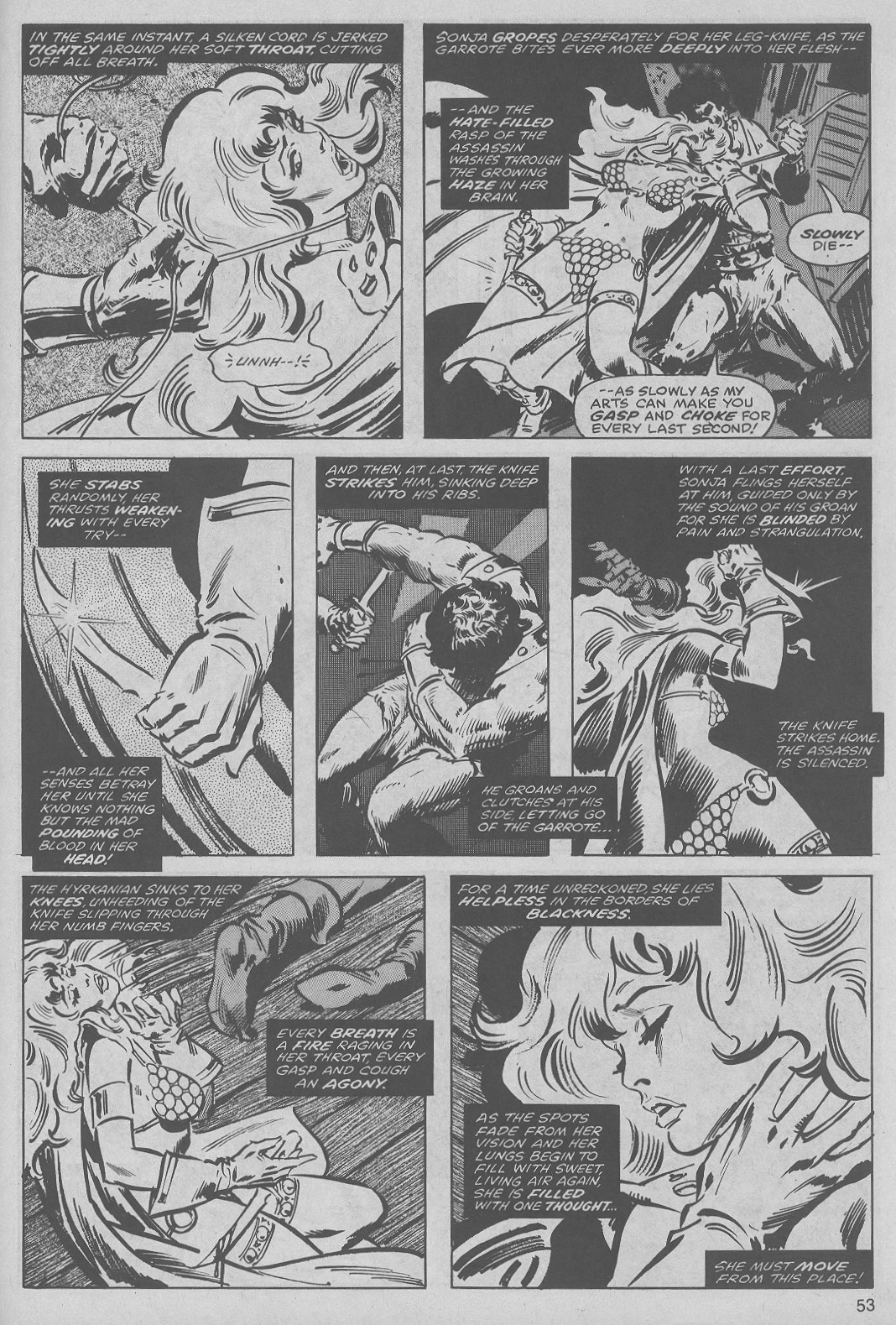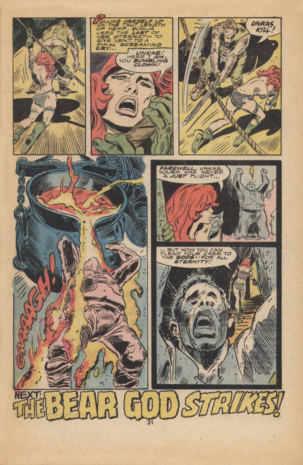 - Marvel Comics Super Special #9, Red Sonja (Volume 2) #1, and Savage Sword of Conan #230 claim she killed her rapist and that he was her first victim, but these claims are blatantly contradicted by the above story. It’s likely the writers confused him for her actual first victim, one of his men.