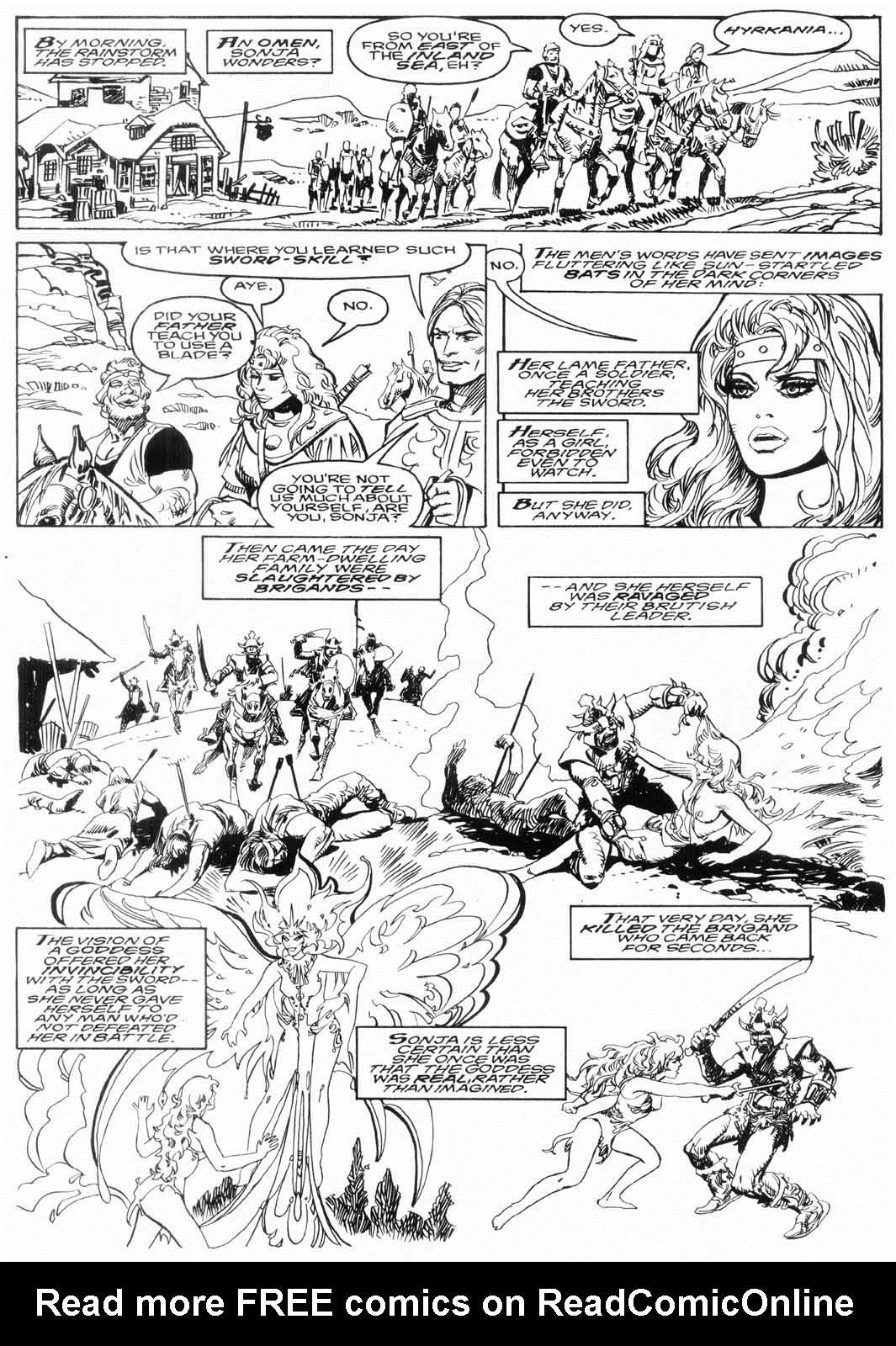 One night, a group of wandering mercenaries happened upon her village, led by her father’s former second in command. The mercenaries slaughtered Sonja’s family before her eyes, and Sonja herself was brutally raped by their leader, who left her to die by setting fire to her house.