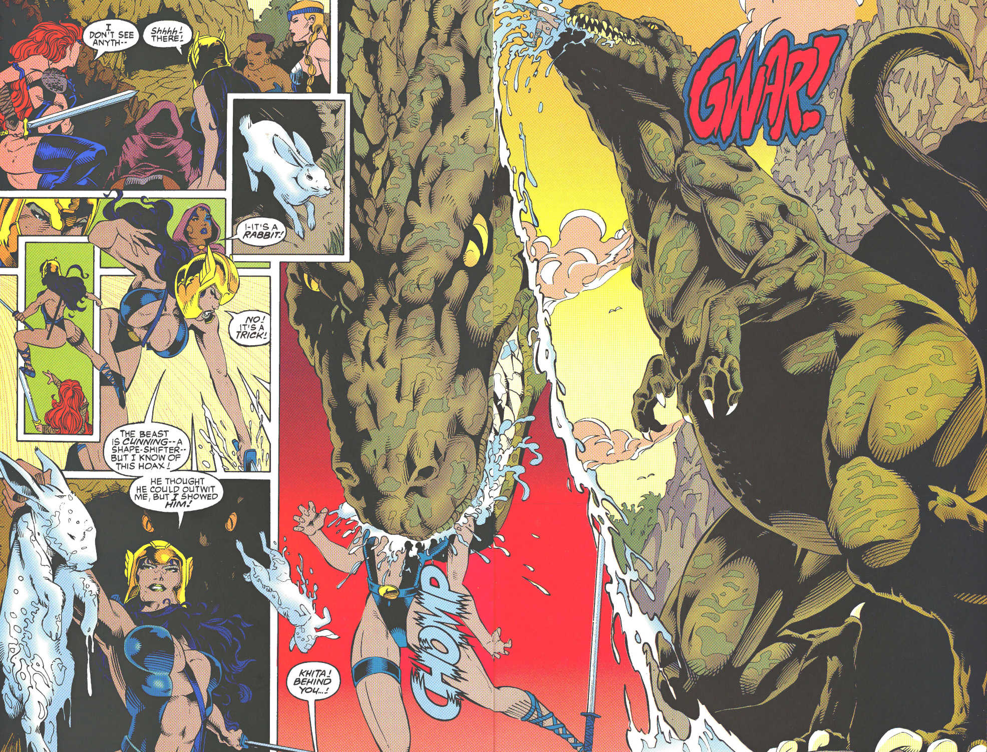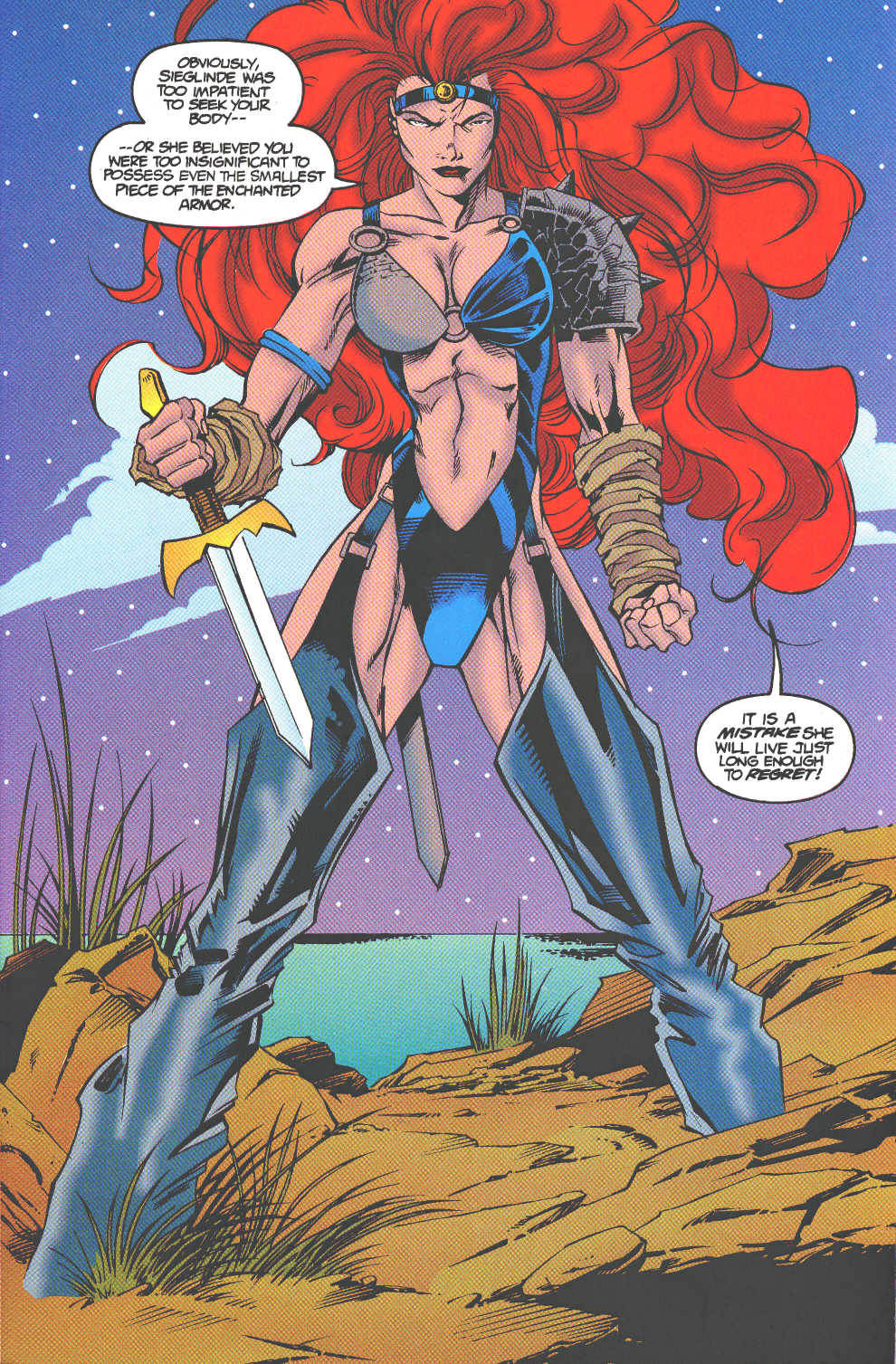 But then there’s Red Sonja: Scavenger Hunt. It’s the final Red Sonja solo published solely under Marvel, and it’s pretty bad! The plot is more barebones than her stories with Zula, Sonja’s redesign reeks of late 90s cliches, and the supporting cast is so forgettable that their abrupt deaths feel like a joke! To top it all off, the story’s ending is extremely rushed and abrupt, and Sonja starts acting really out of character for the final act. She blames the hastily introduced villain (Analee, who’s a spirit resurrected against her will) for what’s happening, calls her a harlot for not respecting her husband, and leaves Sieglinde to suffer in the villain’s rotting corpse.