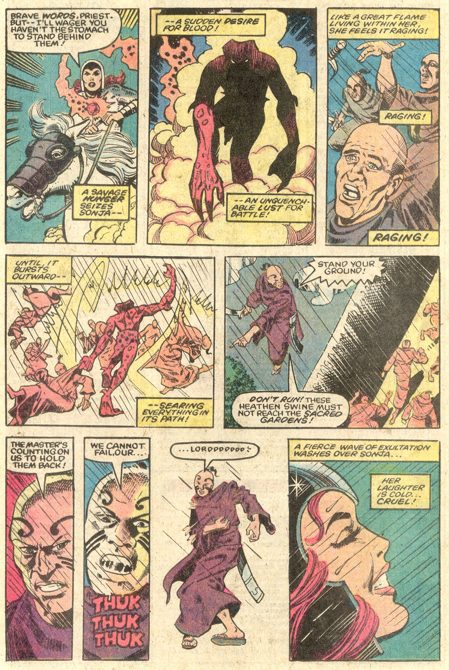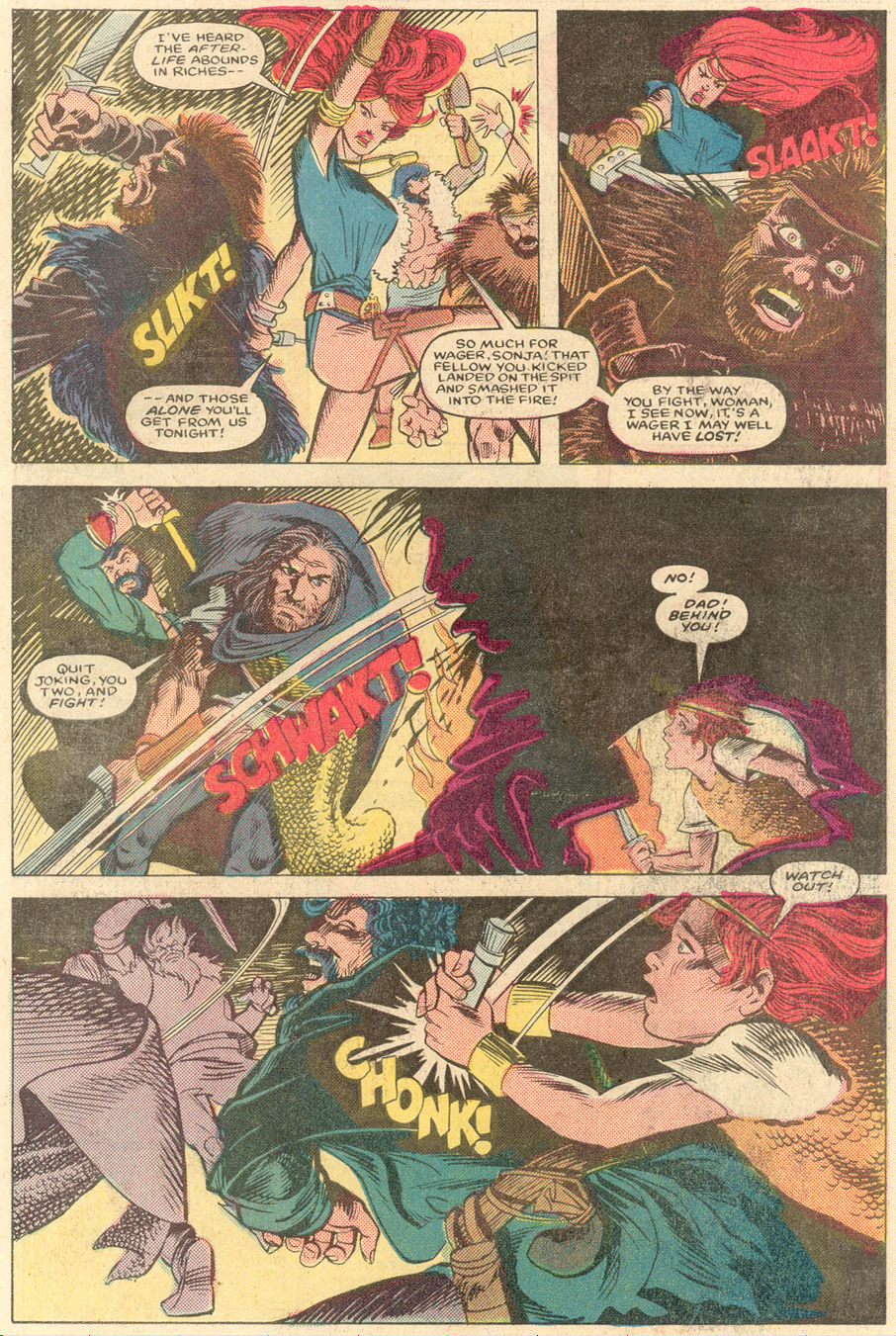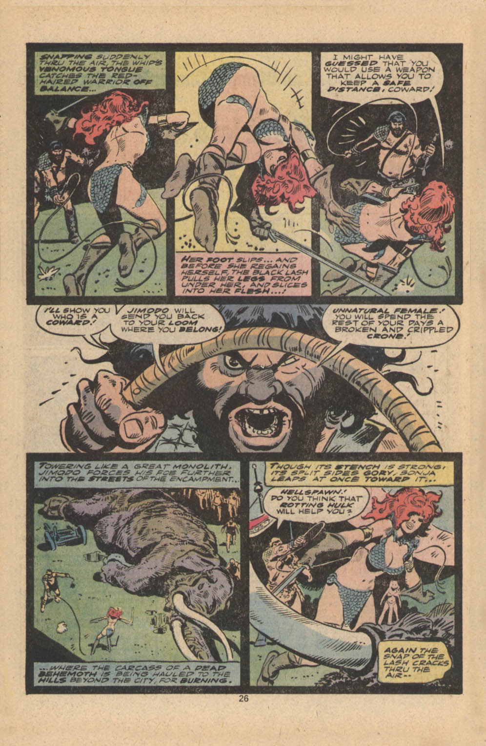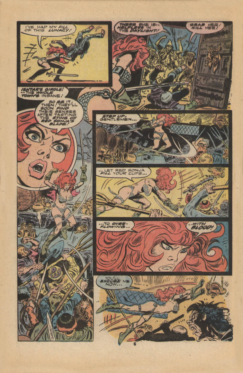 - “Ho, you lice-ridden raiders! Turn from terrorizing children and violating their helpless mothers! Turn from slaying farmers armed only with their rusty scythes! Turn and face Red Sonja- she who has earned the name… She-Devil with a Sword!”