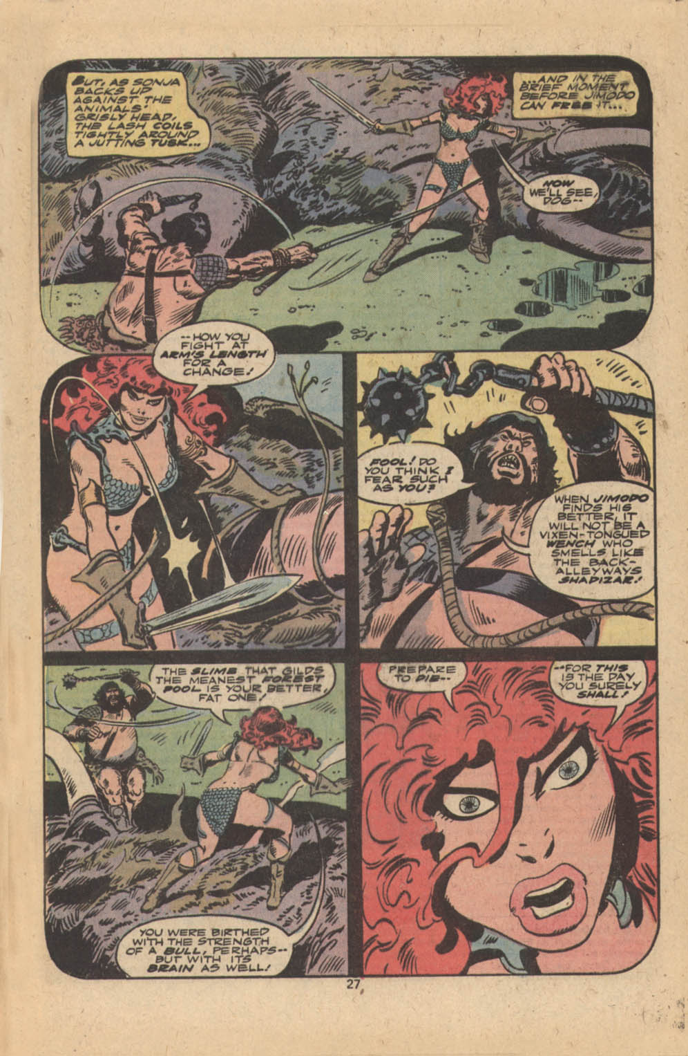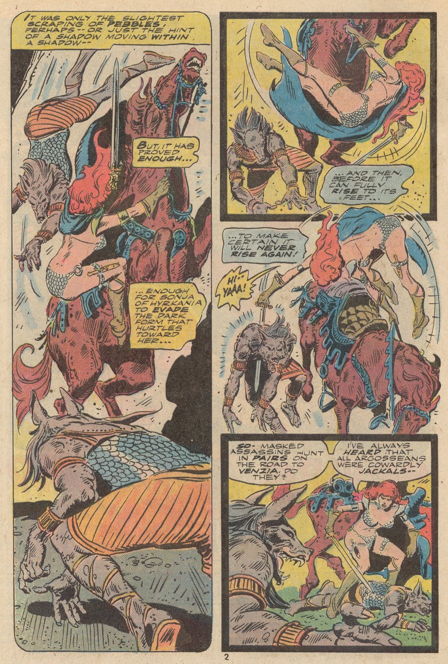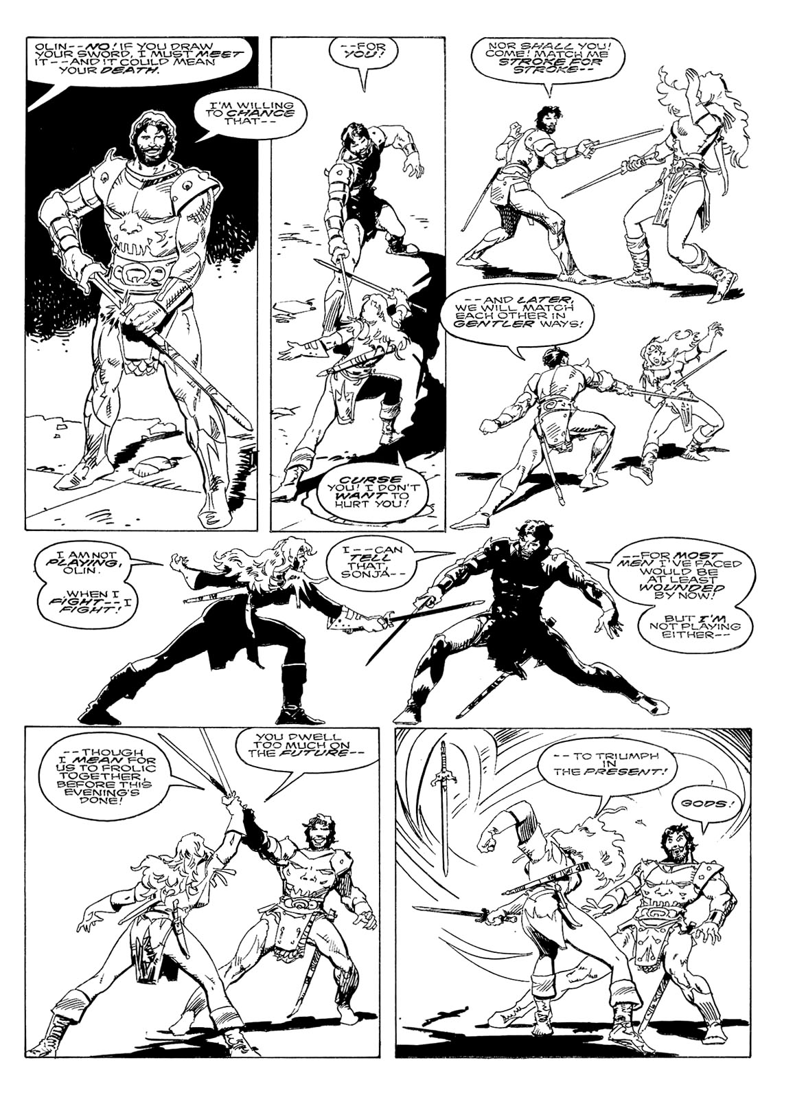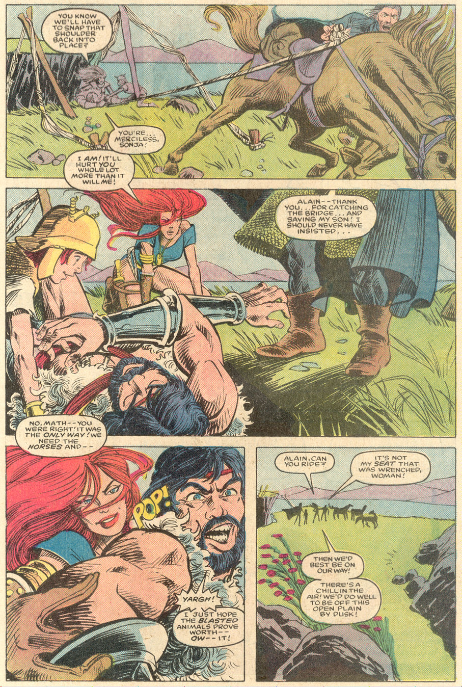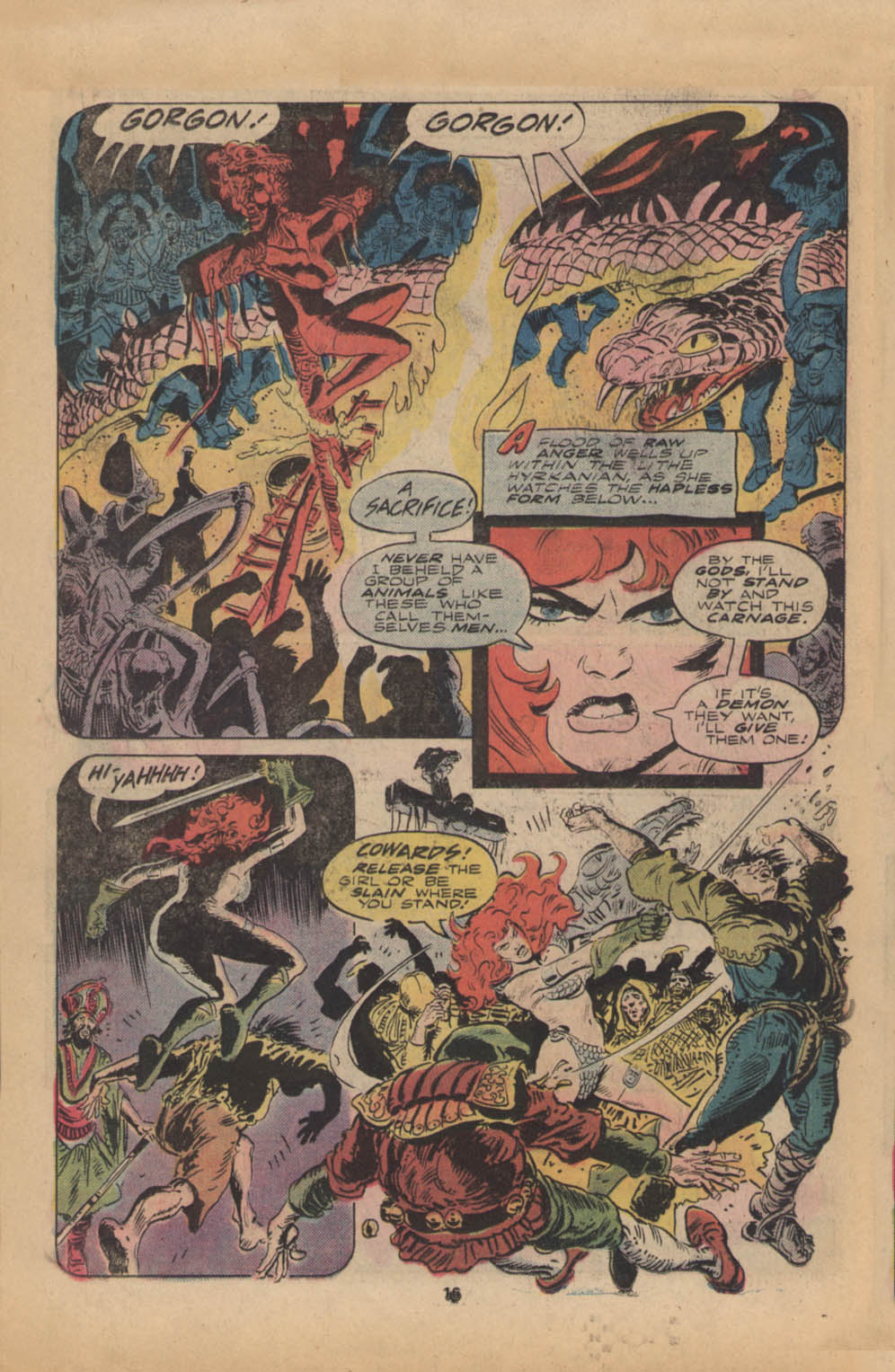 - “Ho, you lice-ridden raiders! Turn from terrorizing children and violating their helpless mothers! Turn from slaying farmers armed only with their rusty scythes! Turn and face Red Sonja- she who has earned the name… She-Devil with a Sword!”