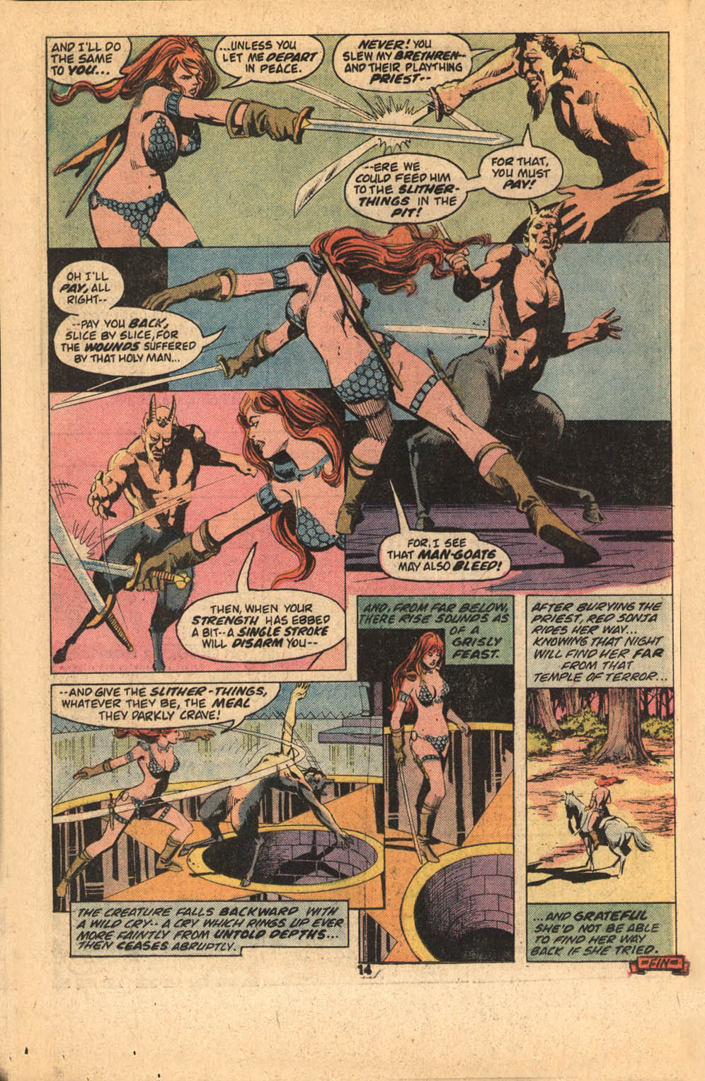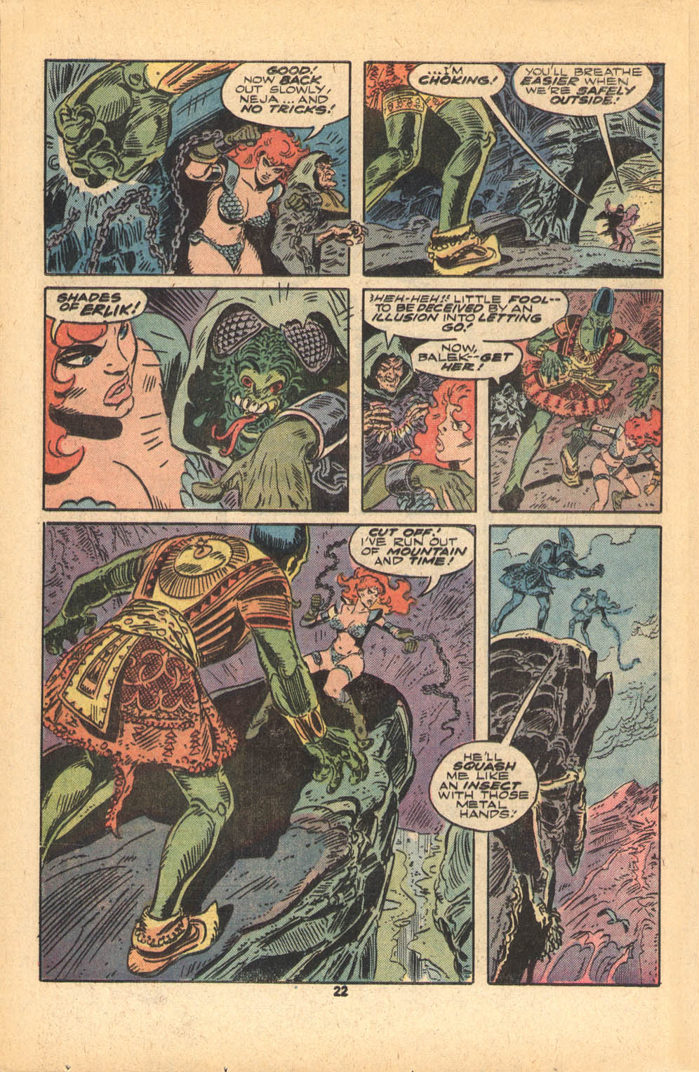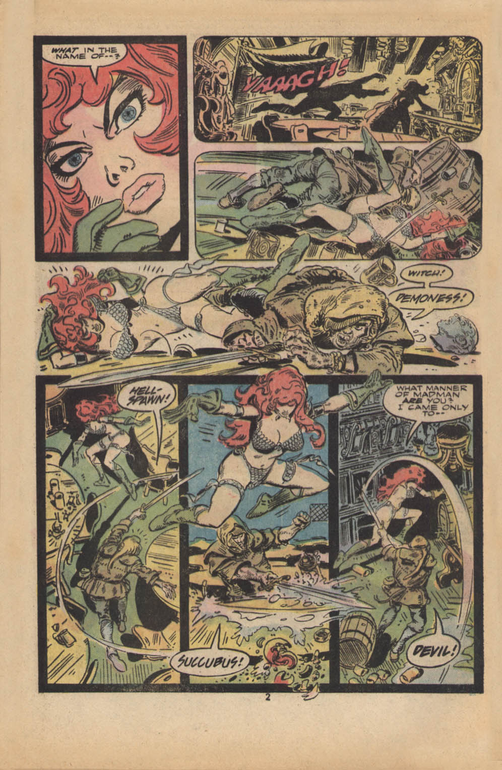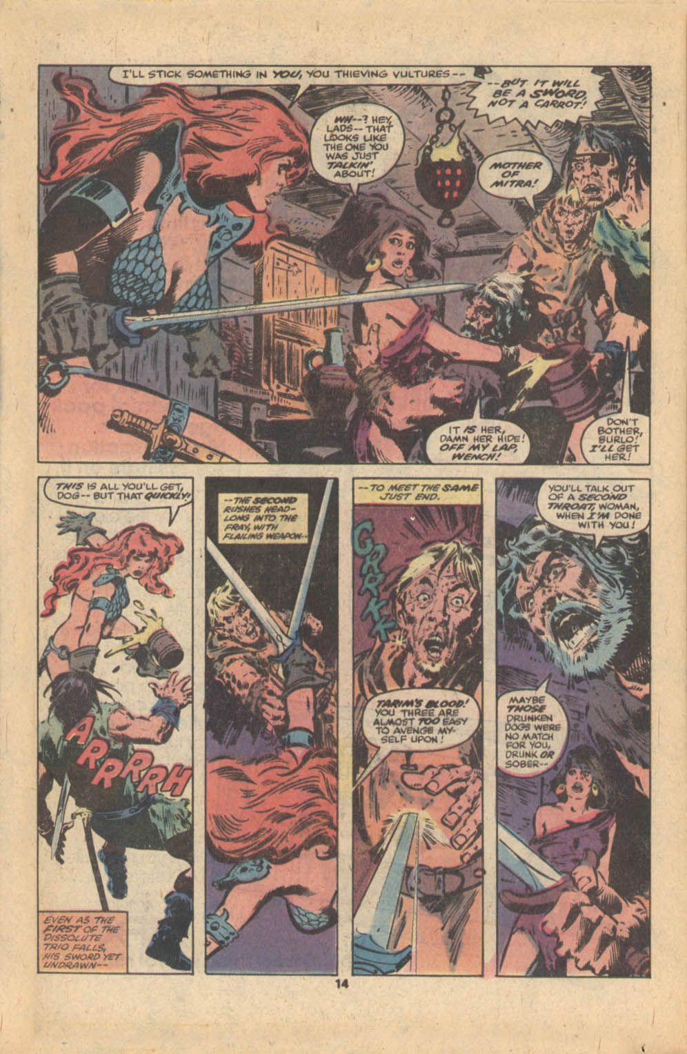 - “Ho, you lice-ridden raiders! Turn from terrorizing children and violating their helpless mothers! Turn from slaying farmers armed only with their rusty scythes! Turn and face Red Sonja- she who has earned the name… She-Devil with a Sword!”