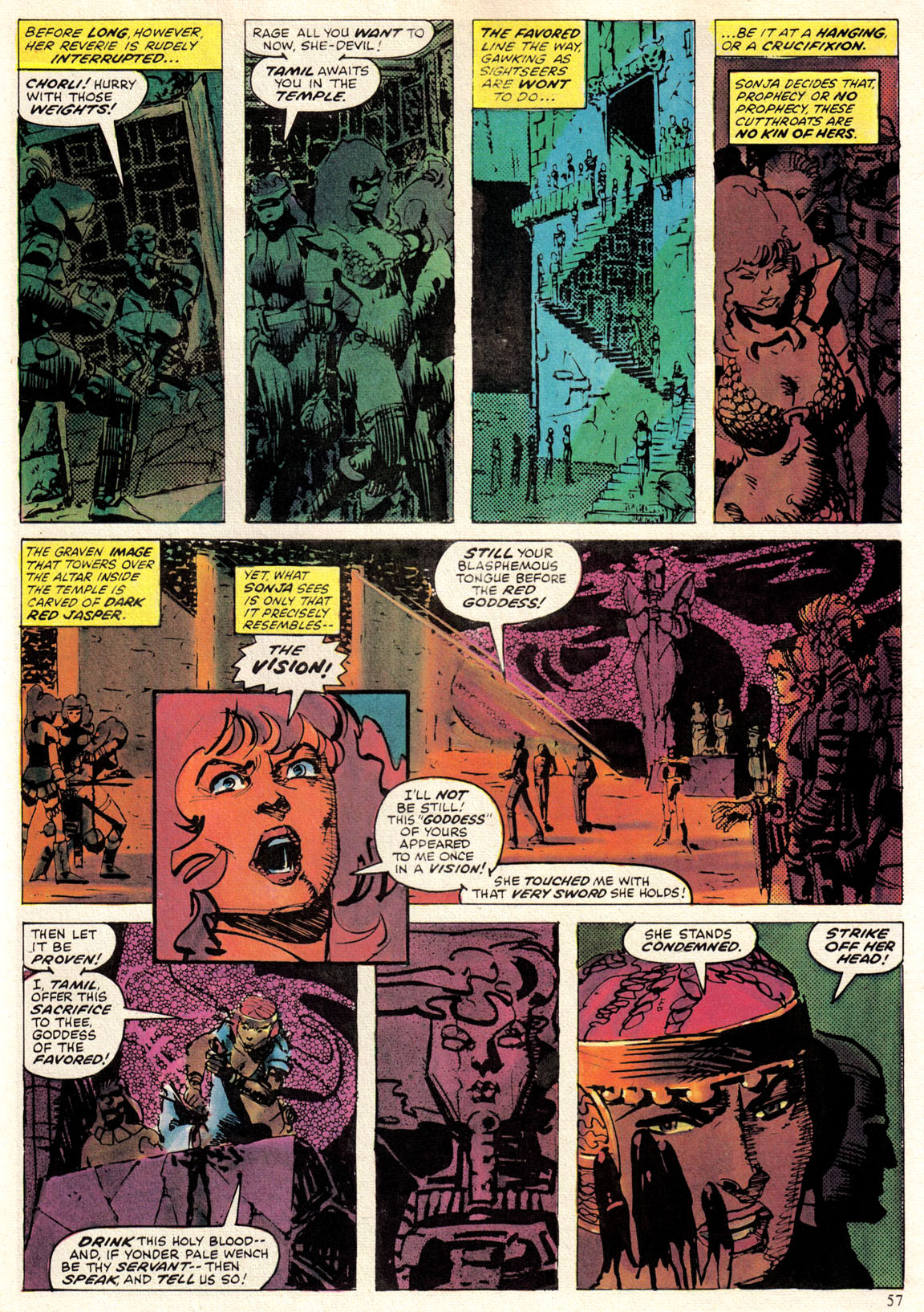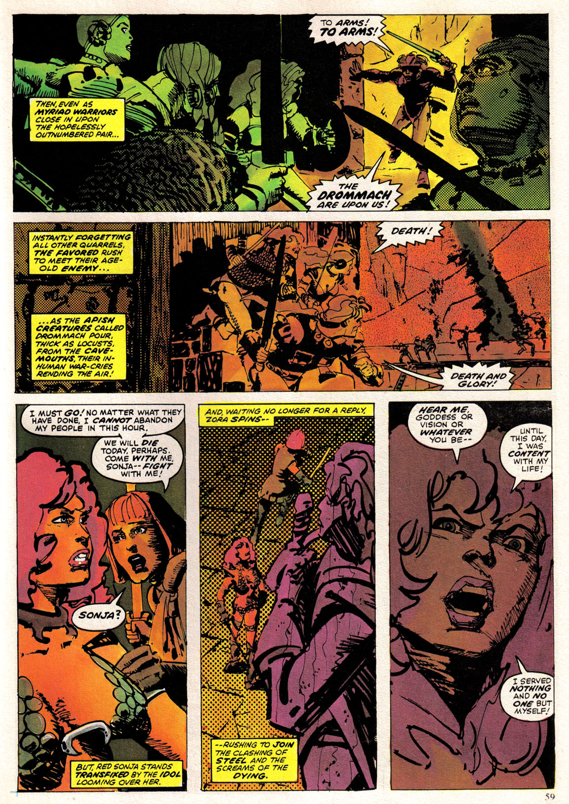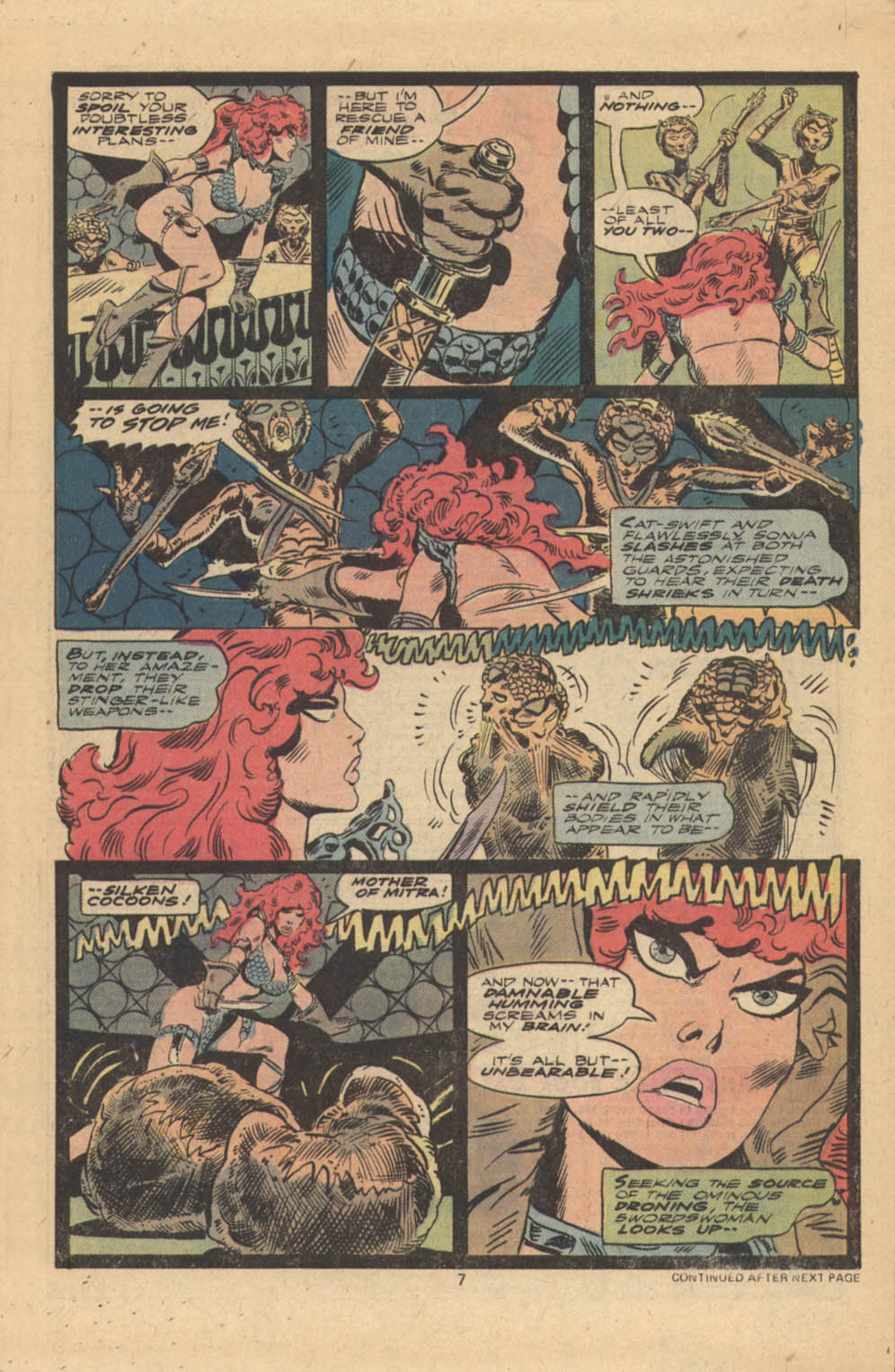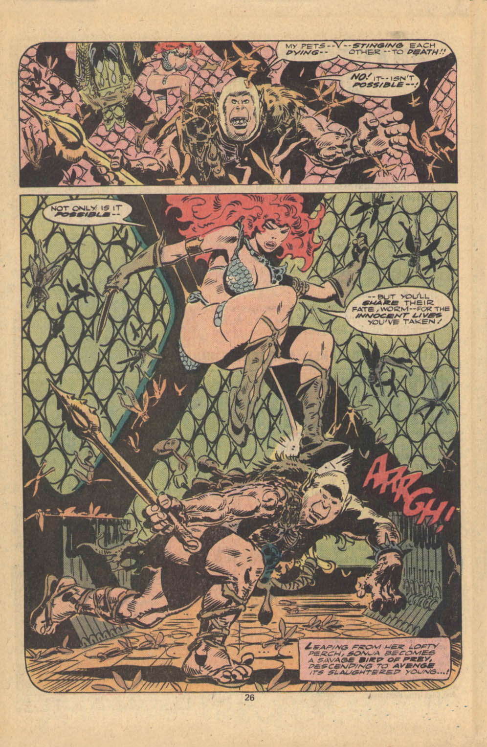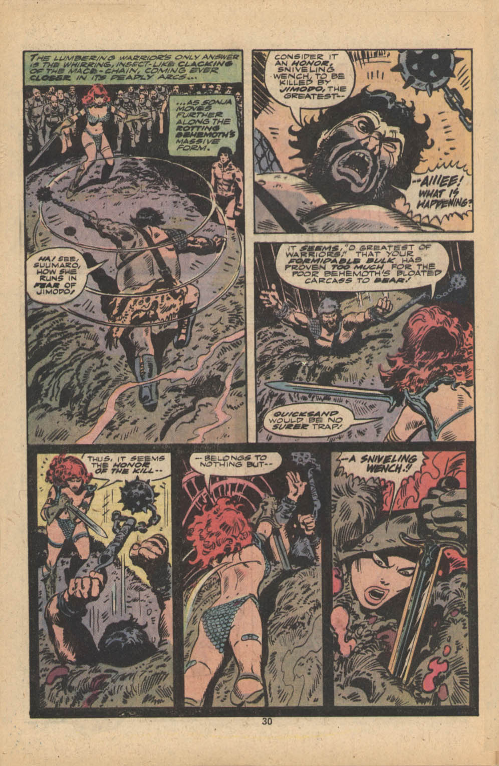 - “Ho, you lice-ridden raiders! Turn from terrorizing children and violating their helpless mothers! Turn from slaying farmers armed only with their rusty scythes! Turn and face Red Sonja- she who has earned the name… She-Devil with a Sword!”
