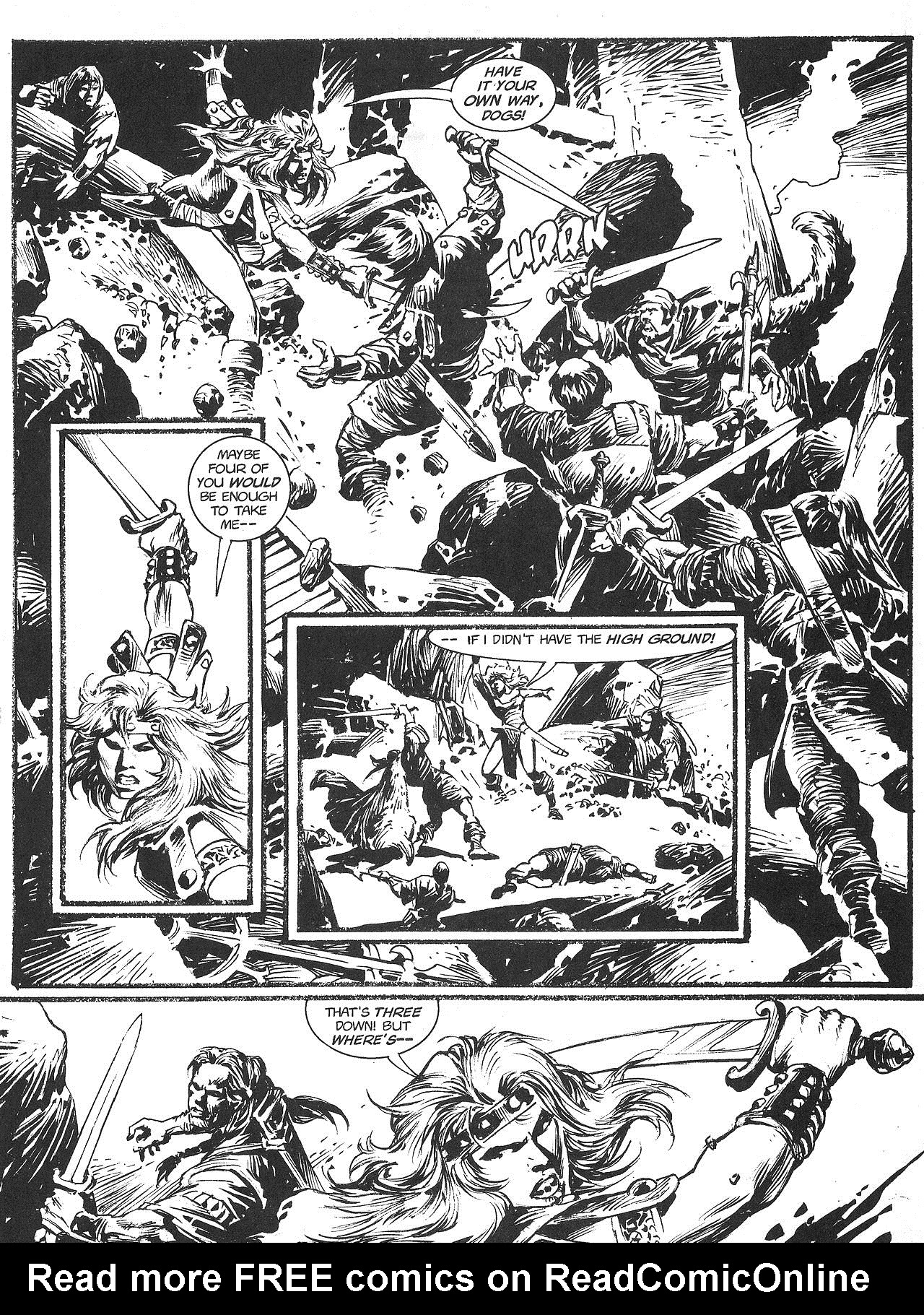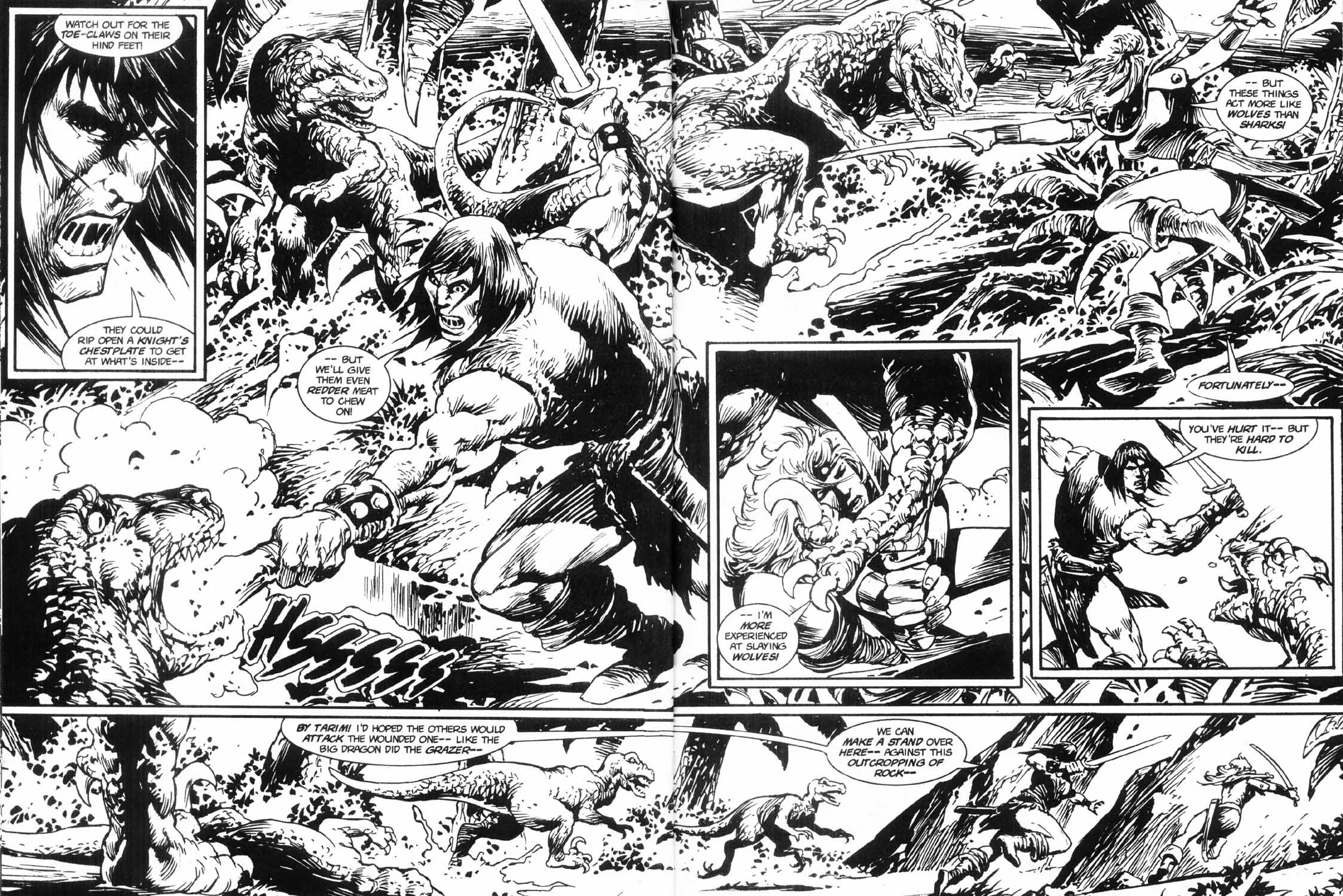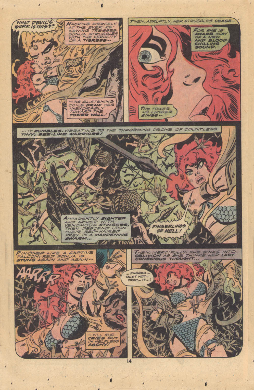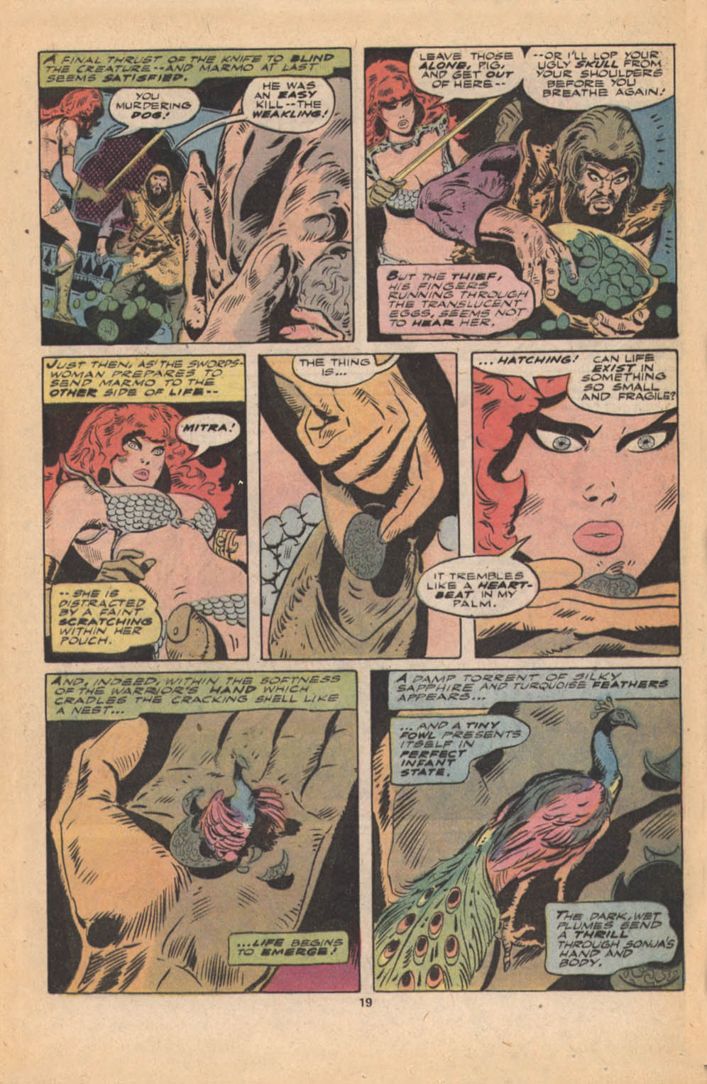 - “Ho, you lice-ridden raiders! Turn from terrorizing children and violating their helpless mothers! Turn from slaying farmers armed only with their rusty scythes! Turn and face Red Sonja- she who has earned the name… She-Devil with a Sword!”
