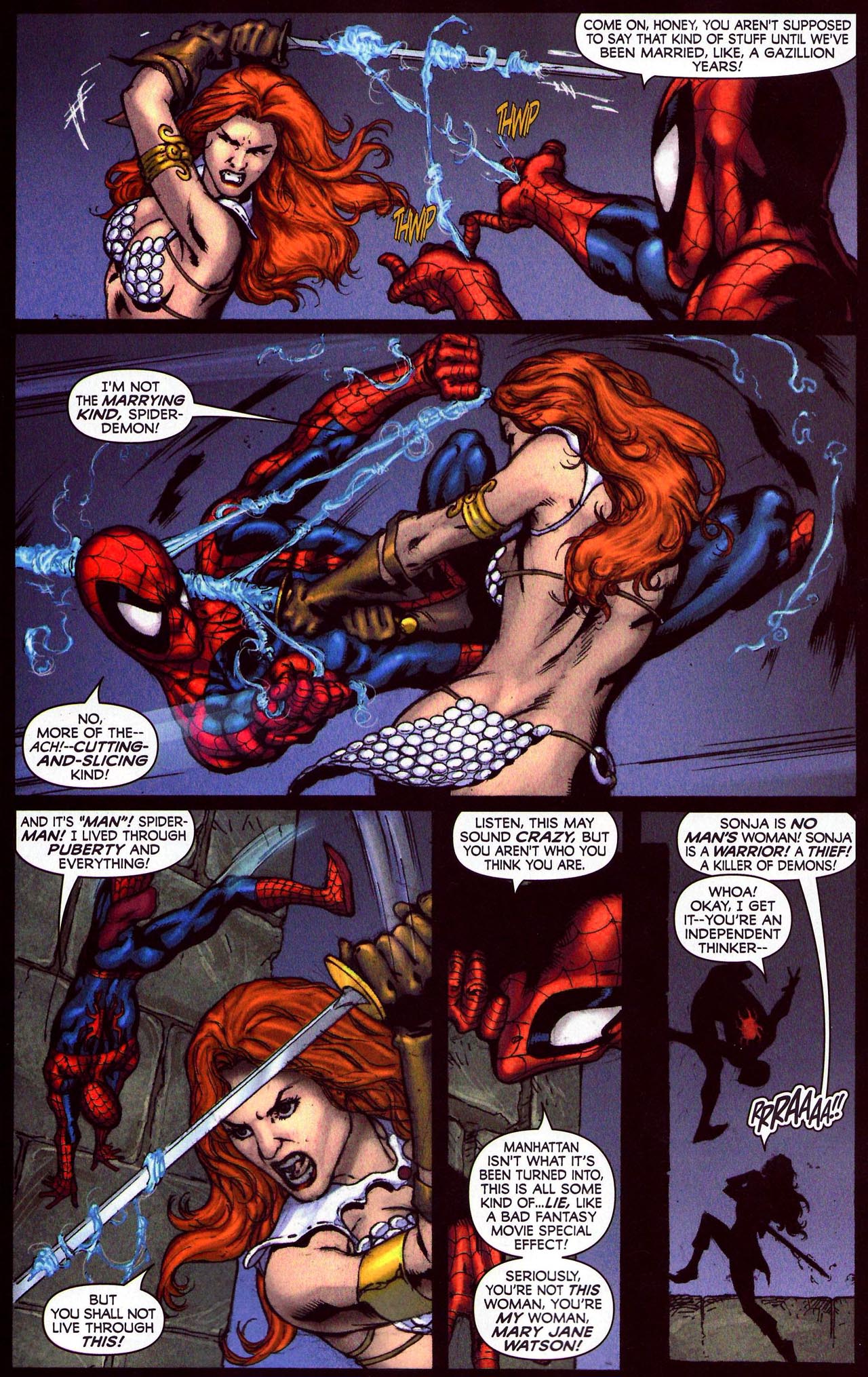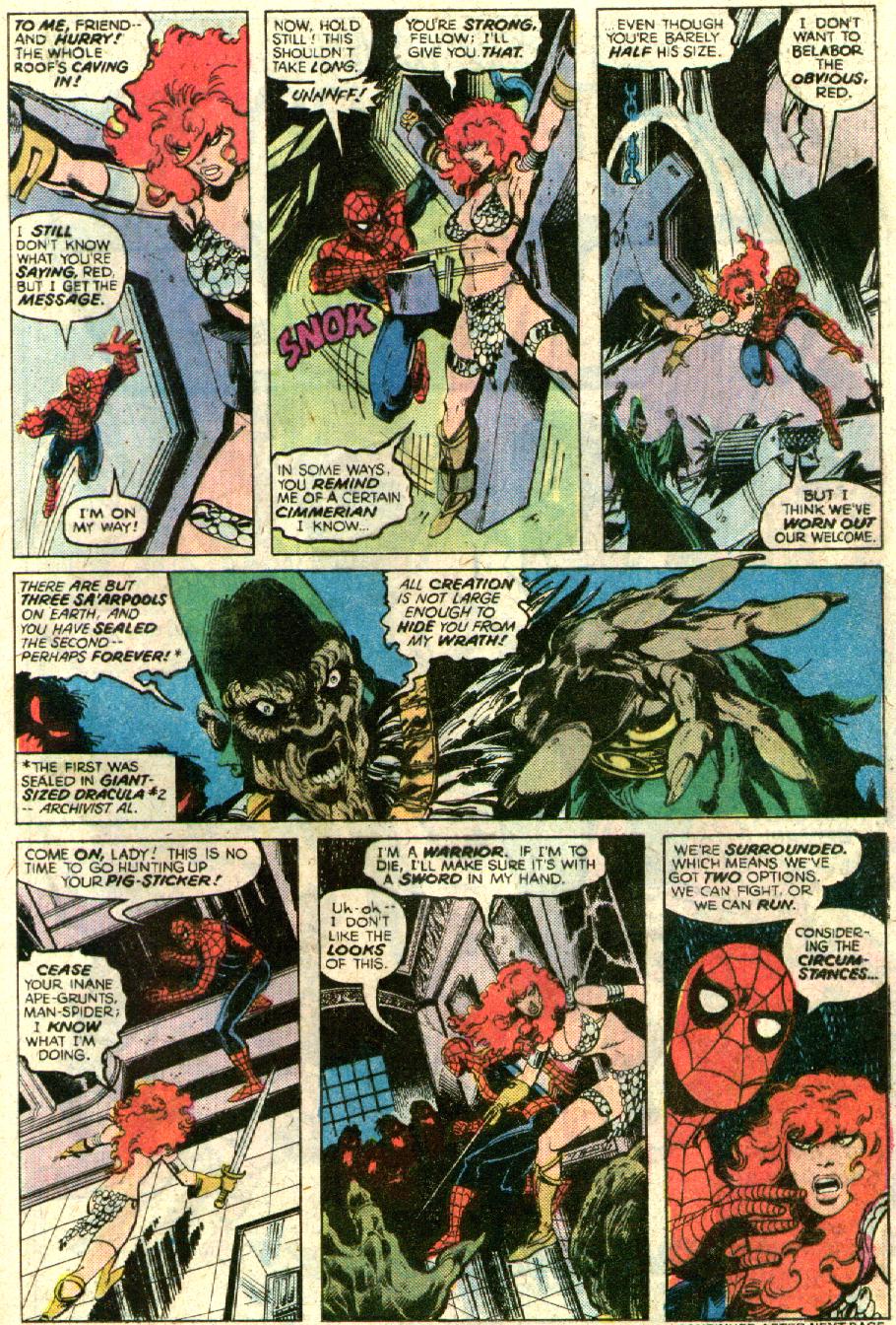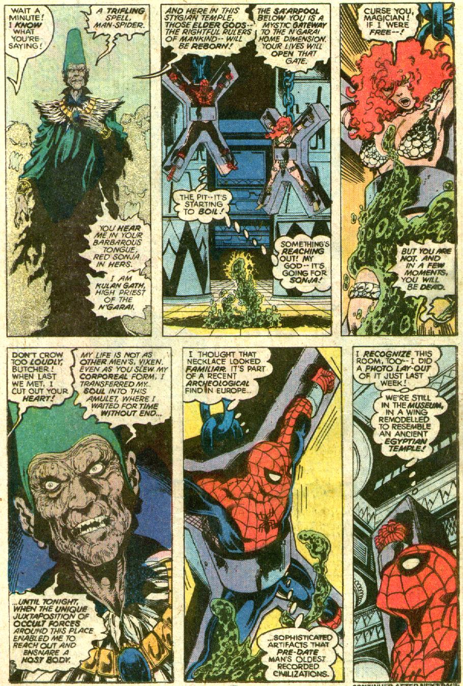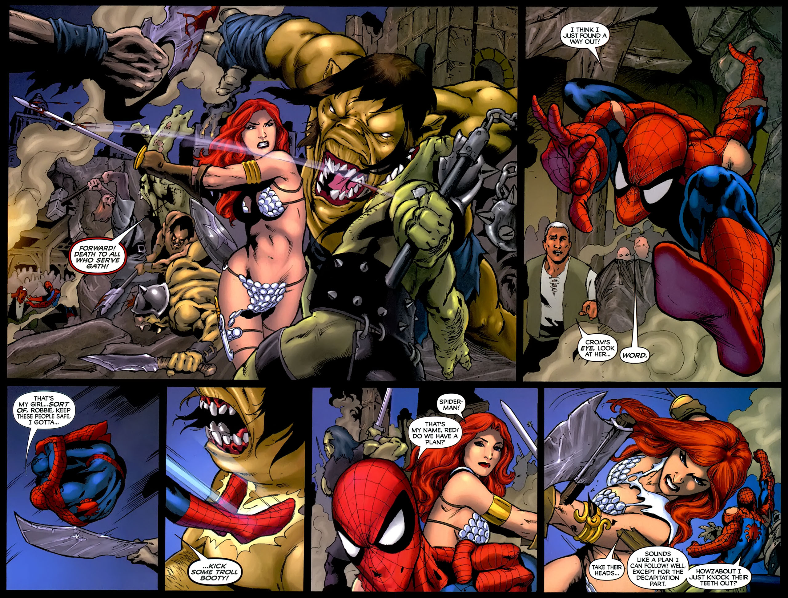 - Spider-Man/Red Sonja claims the men that killed her family and burned her home were sent by Kulan Gath, but this is never stated or implied in any of the flashbacks or recaps of her origin. This claim is more in line with Sonja’s backstory under Dynamite Entertainment, but the miniseries explicitly references Sonja’s previous crossover with Spider-Man, implying this is supposed to be Marvel’s version of Red Sonja.