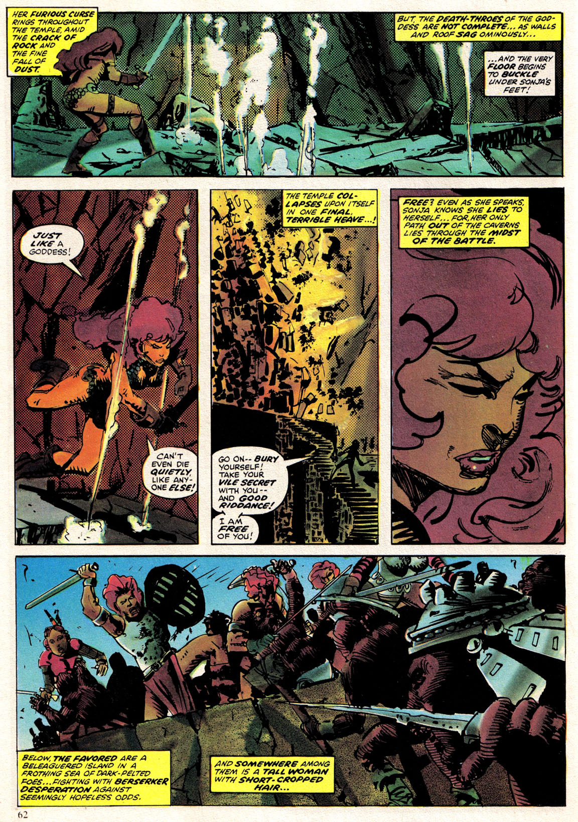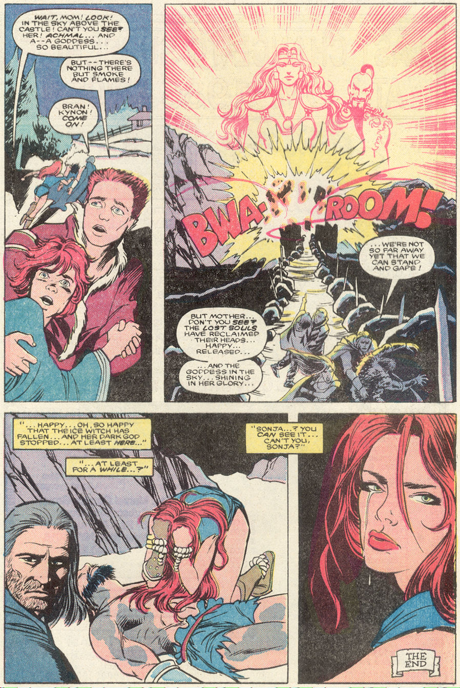 Her next major appearances in Conan 195 to 200 had a great story, but at the cost of some really bad writing for Red Sonja. Issue 198 has her get raped offscreen by an irrelevant minion, and the follow-up in Conan Annual 12 writes her as a crying damsel because she lost her powers (which is heavily out of character, even if those stipulations were brought up in prior stories). The only good thing I can say is at least she goes back to normal as soon as her powers return.
