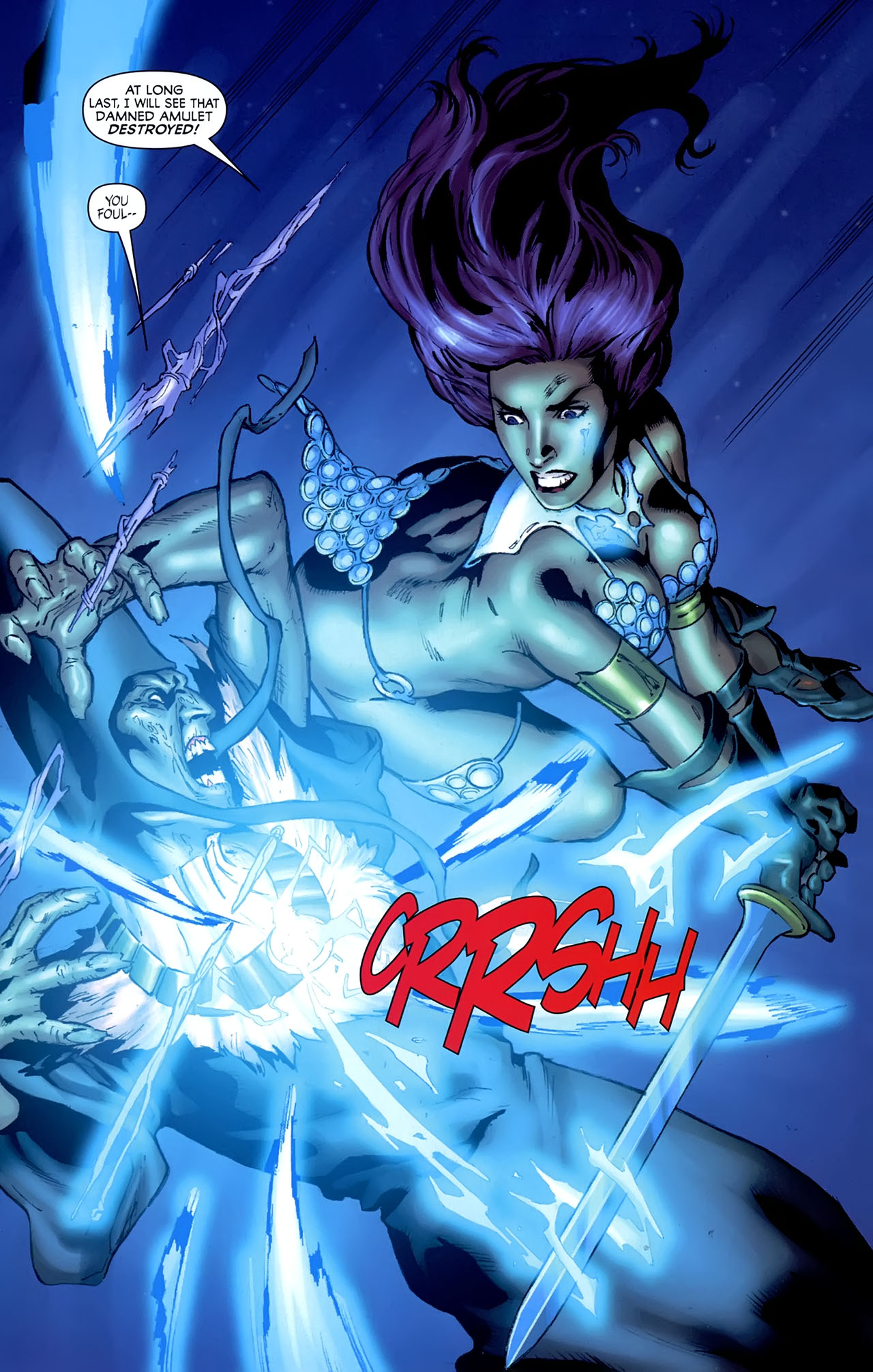 Wanting to prevent the prophecy from passing, the Favored’s leader Tamil attempted to sacrifice Sonja to Scathach, but her efforts were rendered futile when Sonja’s jailer (and supposed sister) Zora took pity on her. In a strange twist of fate, the Drommach invaded their cave at the same time, and as her own people were slain, Sonja confronted Scathach, who revealed that her ties to Sonja’s past ran deeper than expected.