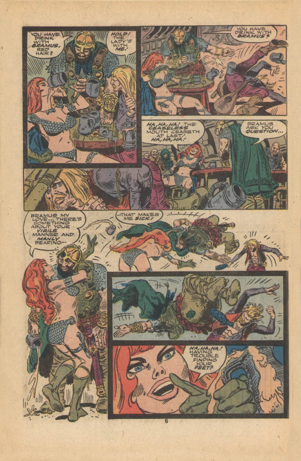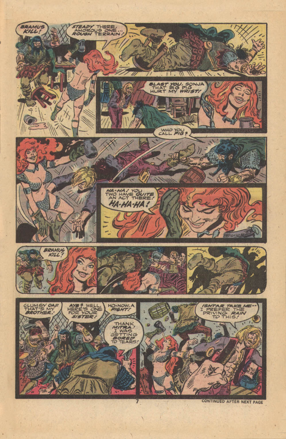 - “Ho, you lice-ridden raiders! Turn from terrorizing children and violating their helpless mothers! Turn from slaying farmers armed only with their rusty scythes! Turn and face Red Sonja- she who has earned the name… She-Devil with a Sword!”