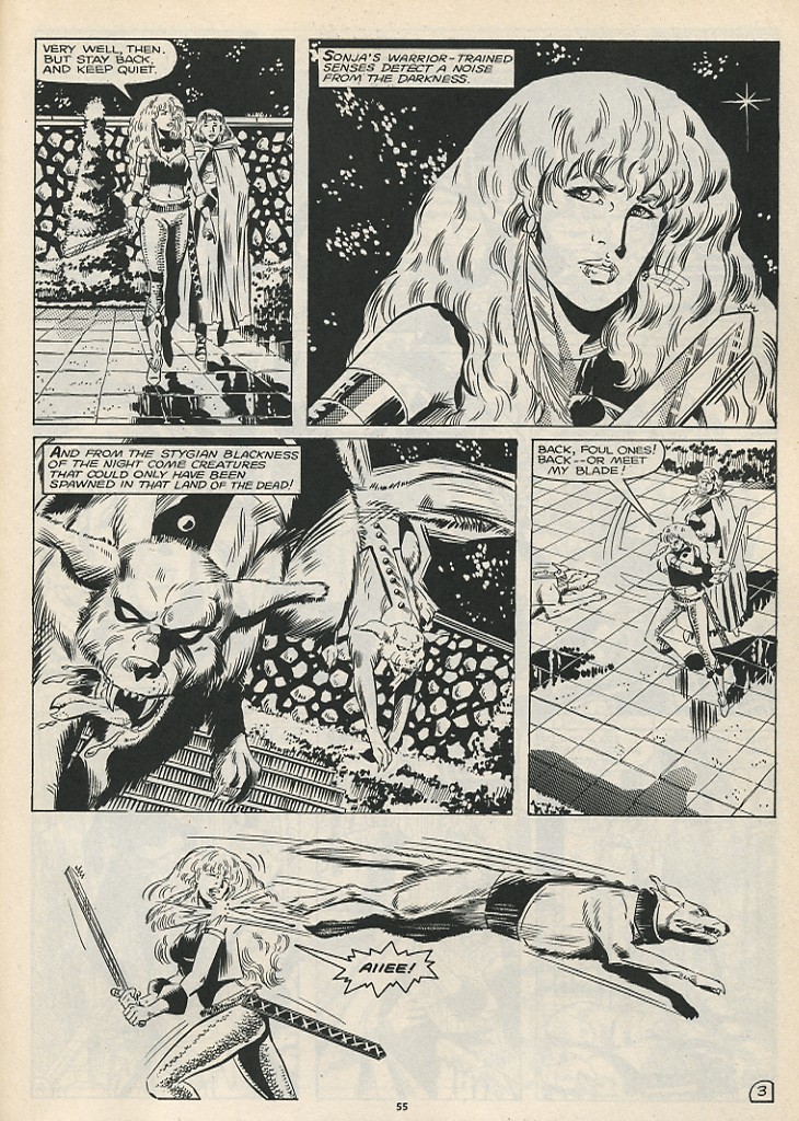 - Marvel Comics Super Special #9, Red Sonja (Volume 2) #1, and Savage Sword of Conan #230 claim she killed her rapist and that he was her first victim, but these claims are blatantly contradicted by the above story. It’s likely the writers confused him for her actual first victim, one of his men.