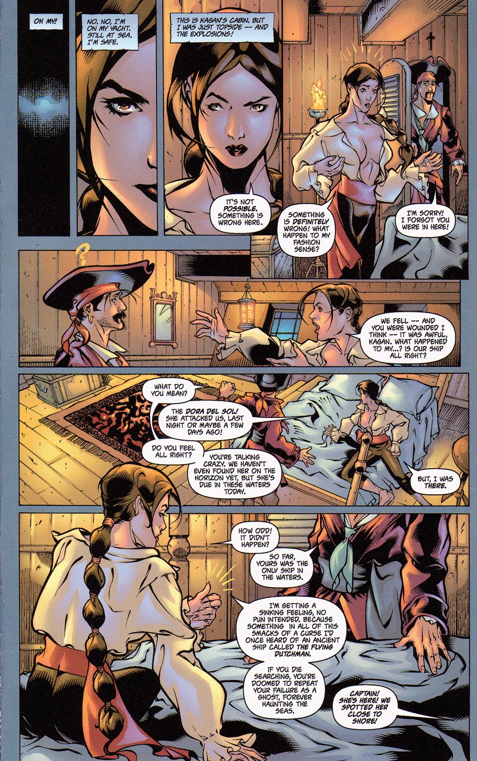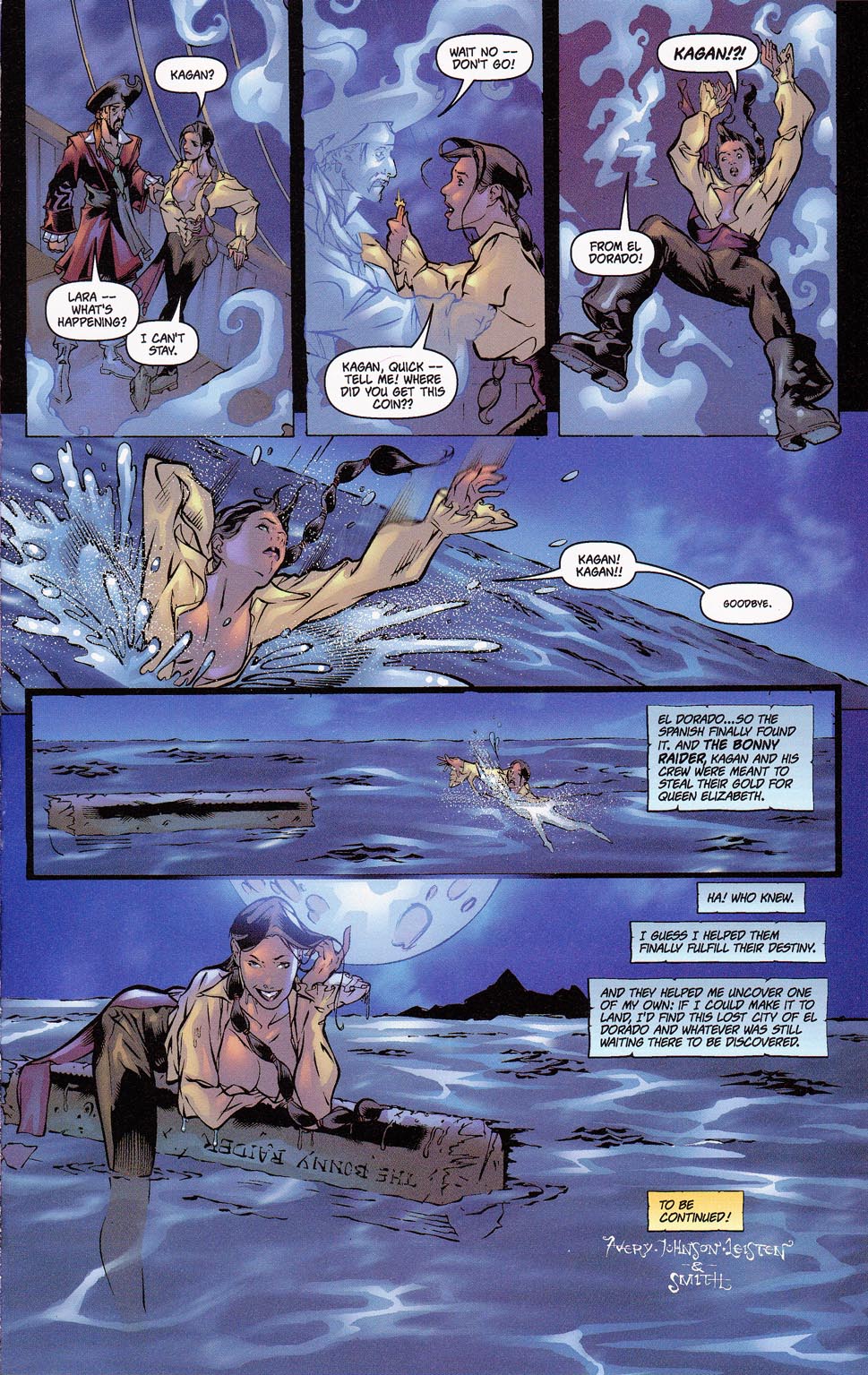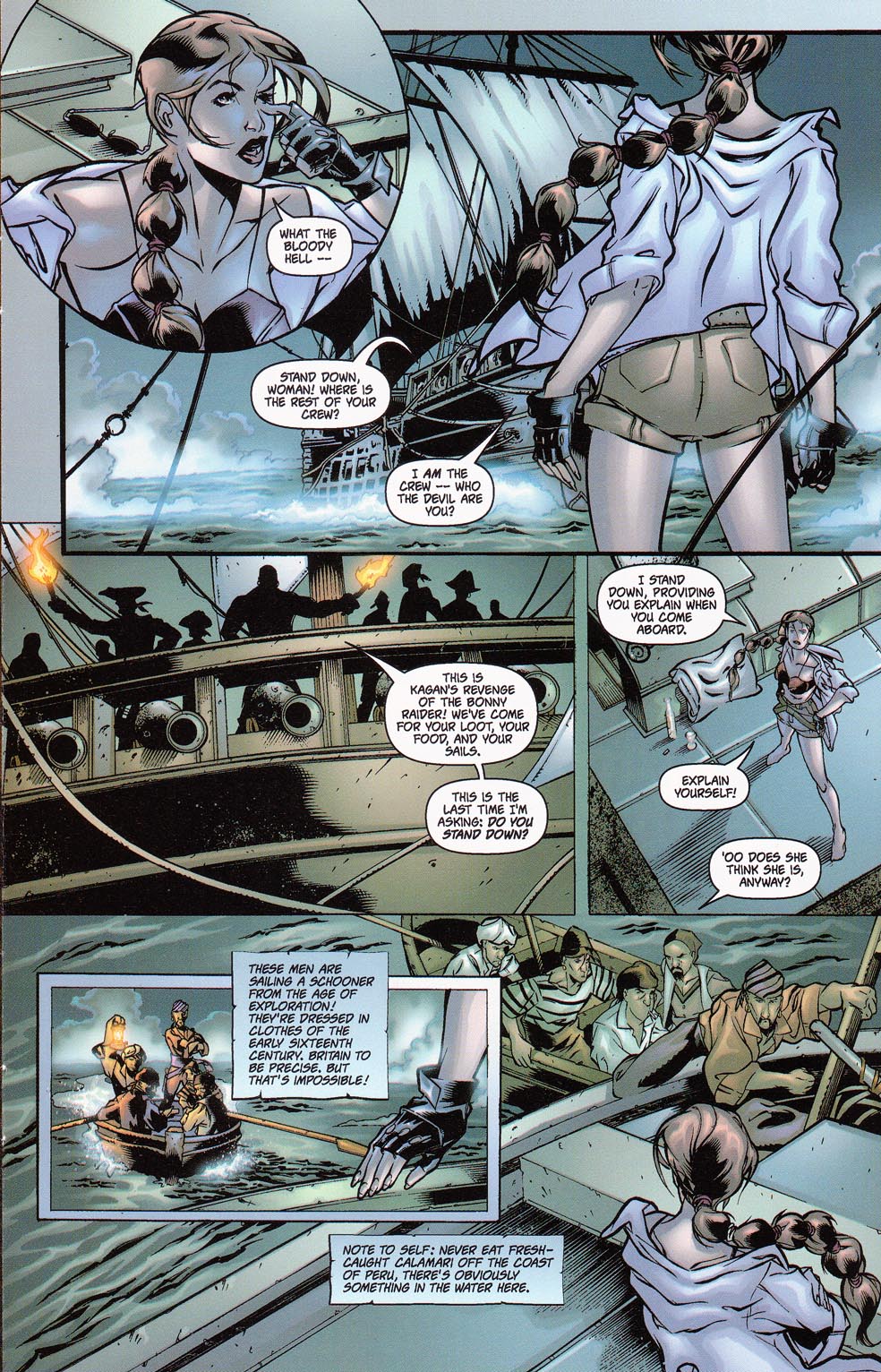 Several years later, during a cruise across the seas, Lara encountered a pirate ship filled with 16th century pirates. Intrigued by her advanced technology, Captain Jonathan Kagan offered her an ultimatum: she could join his crew, or he could turn his ship’s cannons on her. Left with no other choice, Lara agreed, and during her time with the ship, she soon realized it was cursed, seemingly doomed to repeat the same failed raid over and over again. Upon recognizing this, Lara took charge and ensured the raid was successful, causing the heretofore unknown ghost ship to finally pass on from its doomed voyage from El Dorado.