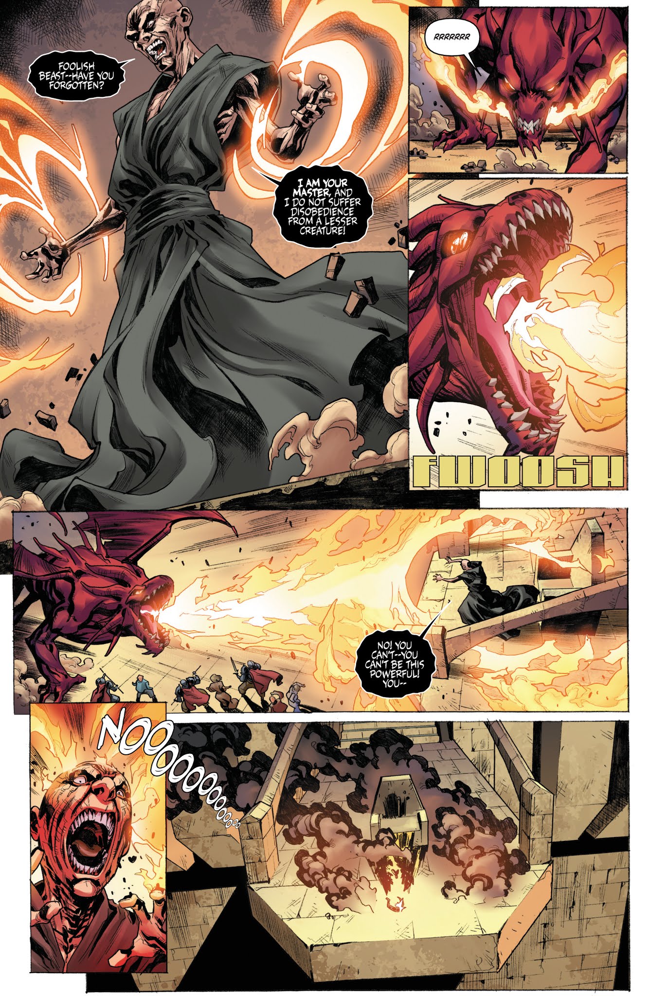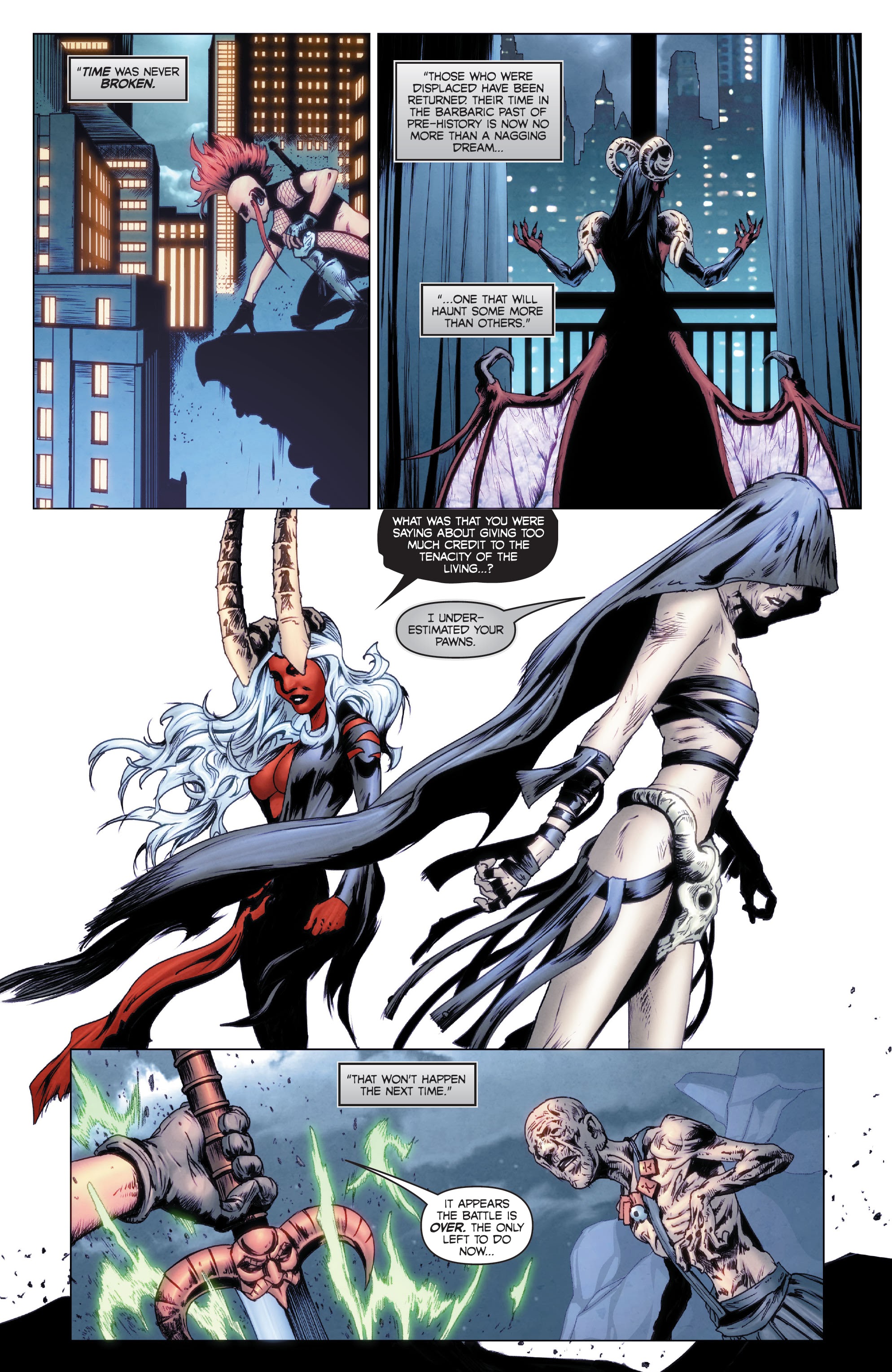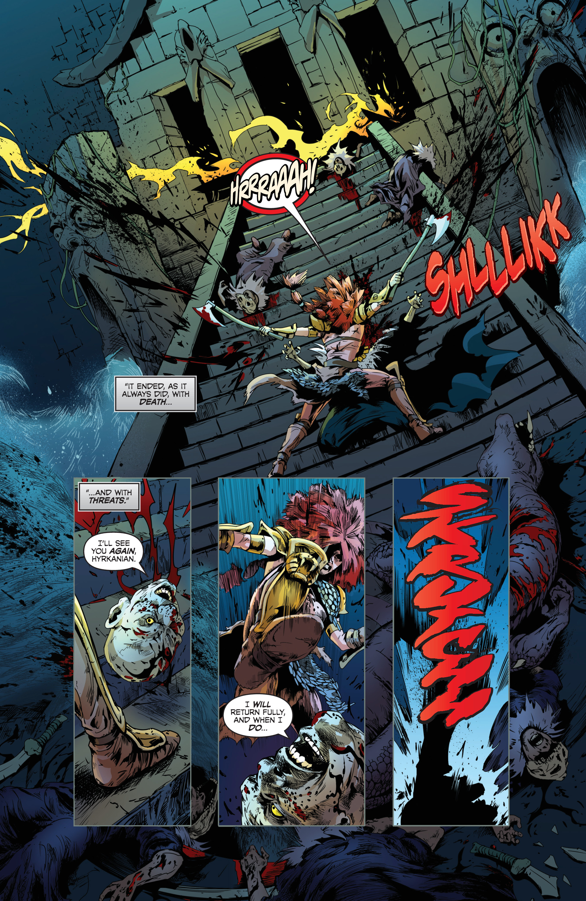 With Gath’s magic corrupting the portal’s location, the displaced Hyborians were sent to Hell, but quickly crossed the River Styx back to the land of the living. After meeting Max’s partners Taya and Lera, Sonja made her way to Gath’s fortress and seemingly killed her duplicate that Gath swayed to his side. Sonja’s group then engaged in a final battle against Kulan’s army, joined by a reformed Beast of Khauran, which incinerated its former master.