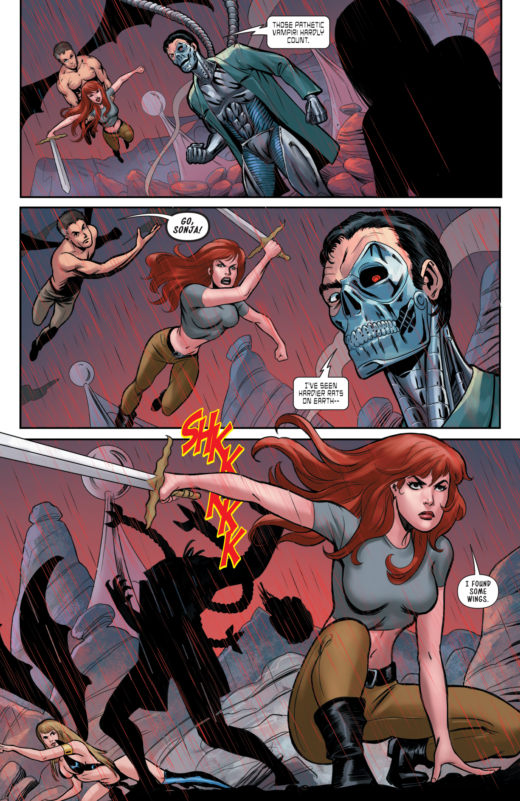 - Shapeshifting: Sonja can turn into a bat and fly, and earlier Vampirella had grown wings and turned into a bat, complete with echolocation.