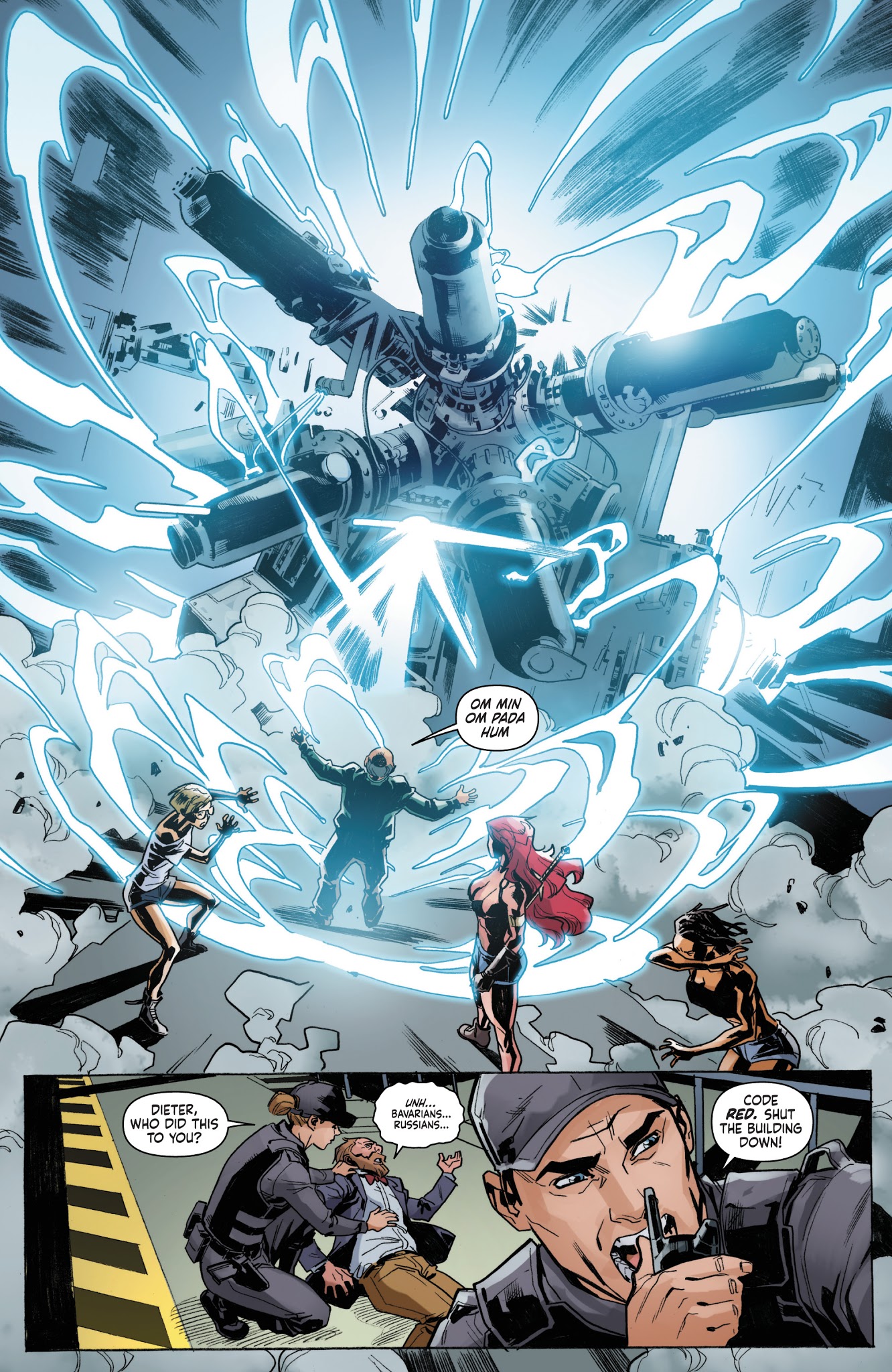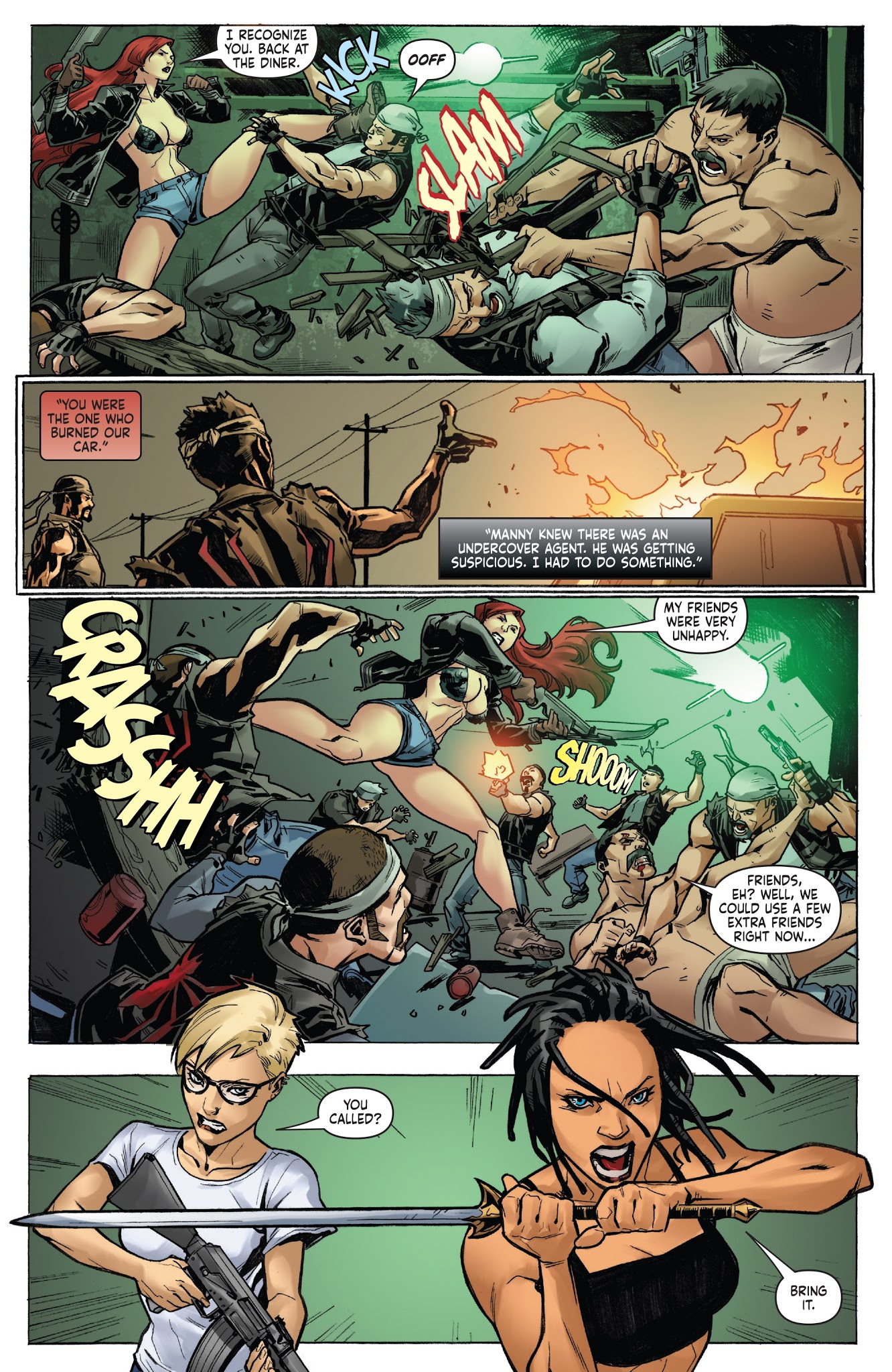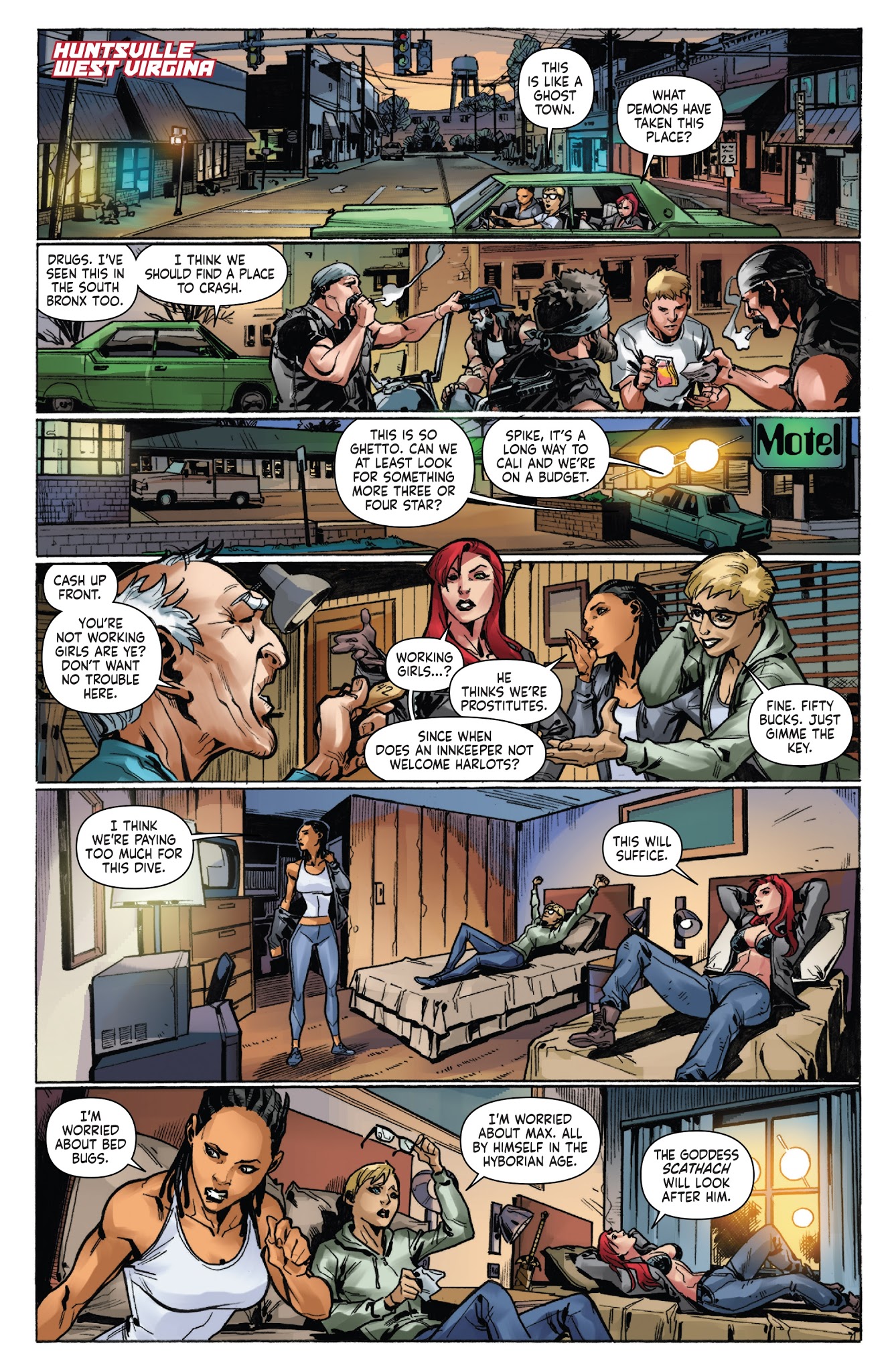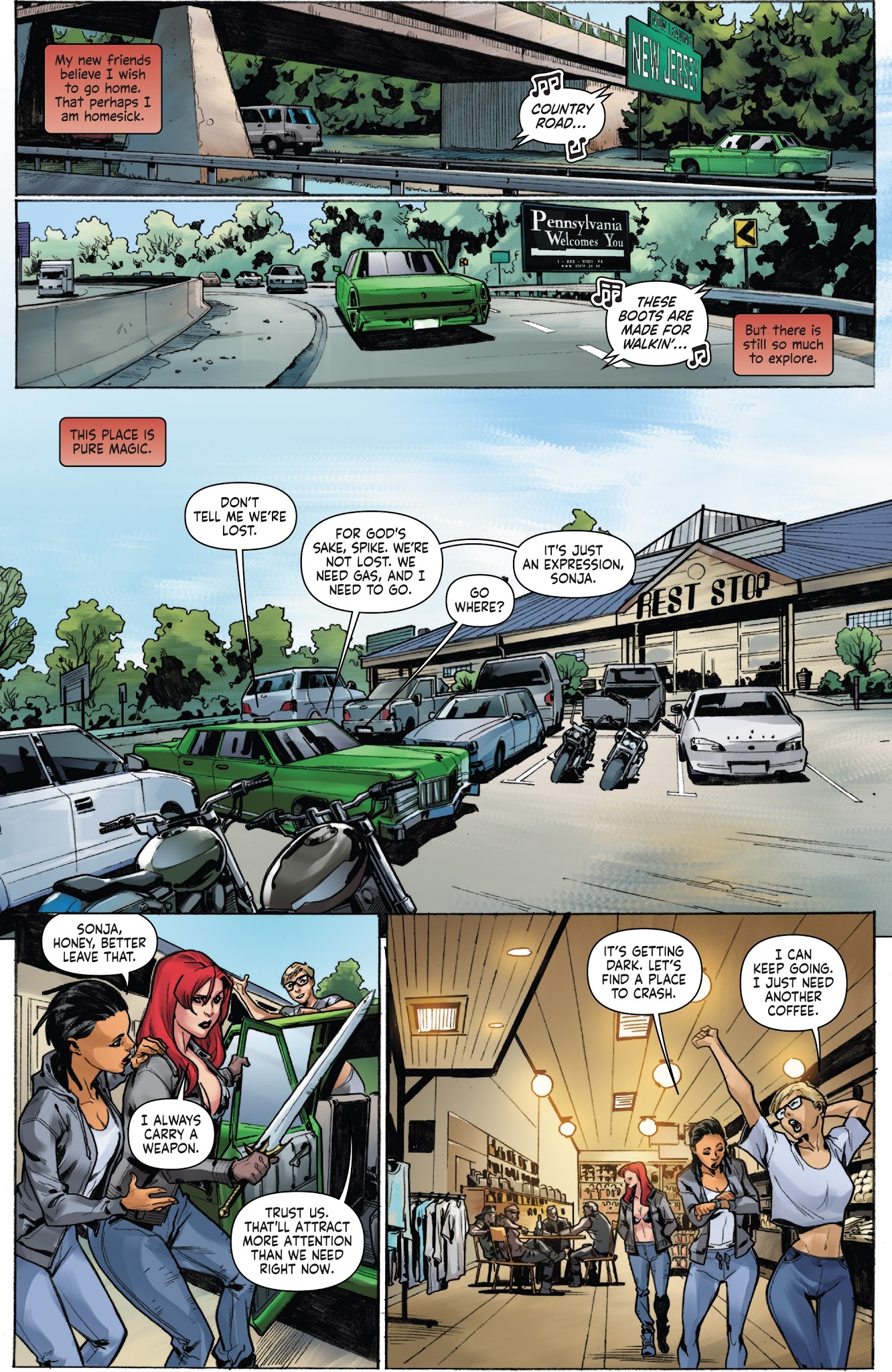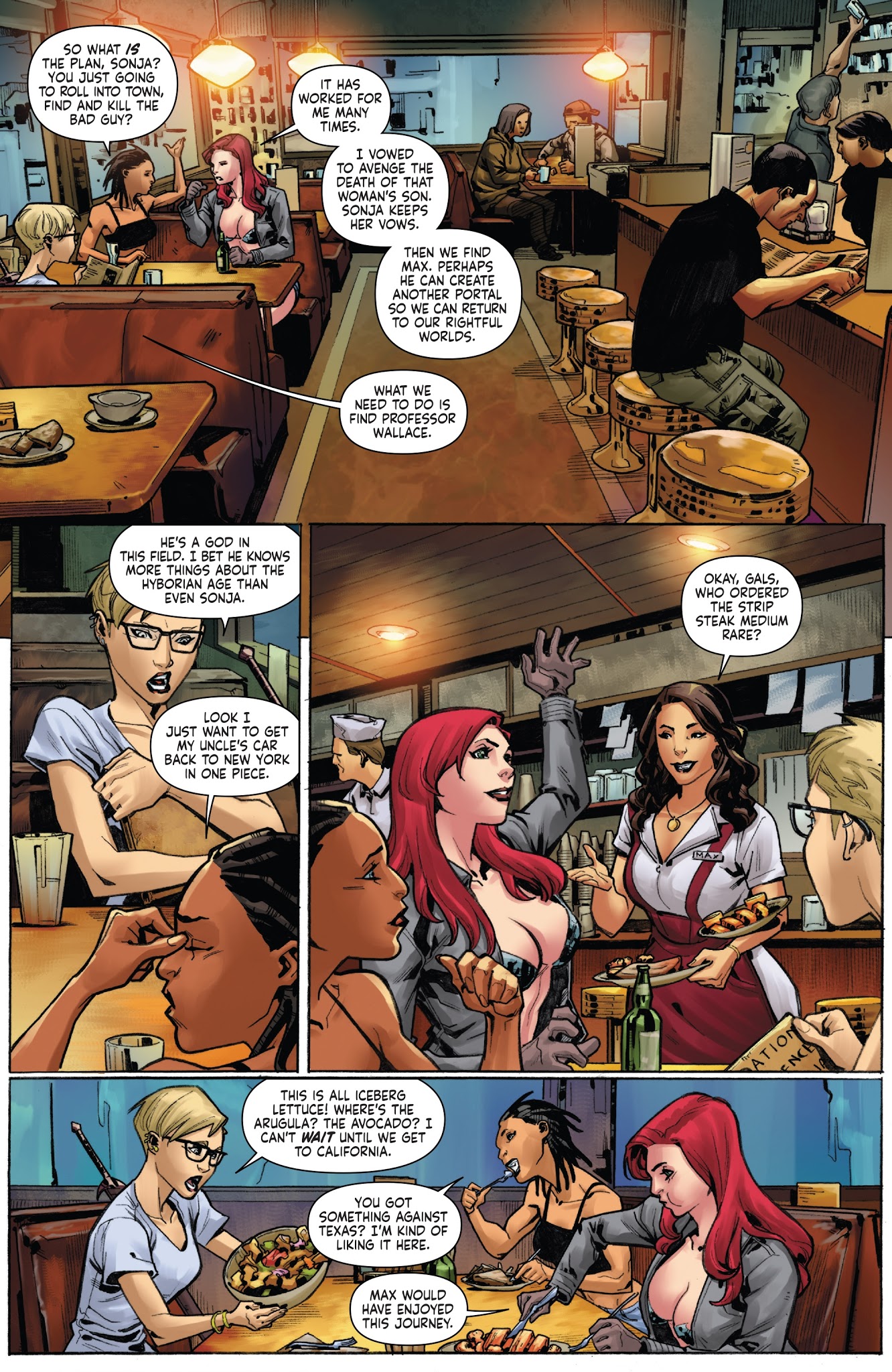 Hoping to get him back, Spike, Holly, and Max’s partner Jay helped Sonja on a cross country trip to Livermore Labs, a research facility funded by Gault industries and the source of Max’s last flickering phone signal. On her way there she’d wind up killing a member of a high profile gang to avenge a bartender’s son. This death quickly reached the ears of the FBI, who began a manhunt investigating Sonja and her partners. Around this same time Sonja’s party discovered the head of one of the gang’s shell corporations and found an ally in Hyrkanian historian and mage Professor Wallace, who was the one that sent them Max’s phone signal. Unfortunately, his attempt to power the machine that would create a portal to Hyboria was instead used by Gath to send his forces through. After tearing through several of his followers, Sonja and Wallace- or rather, duplicates of them created by Wallace’s spell- would end up tackling Gath back into their original time, with the real Sonja following through.