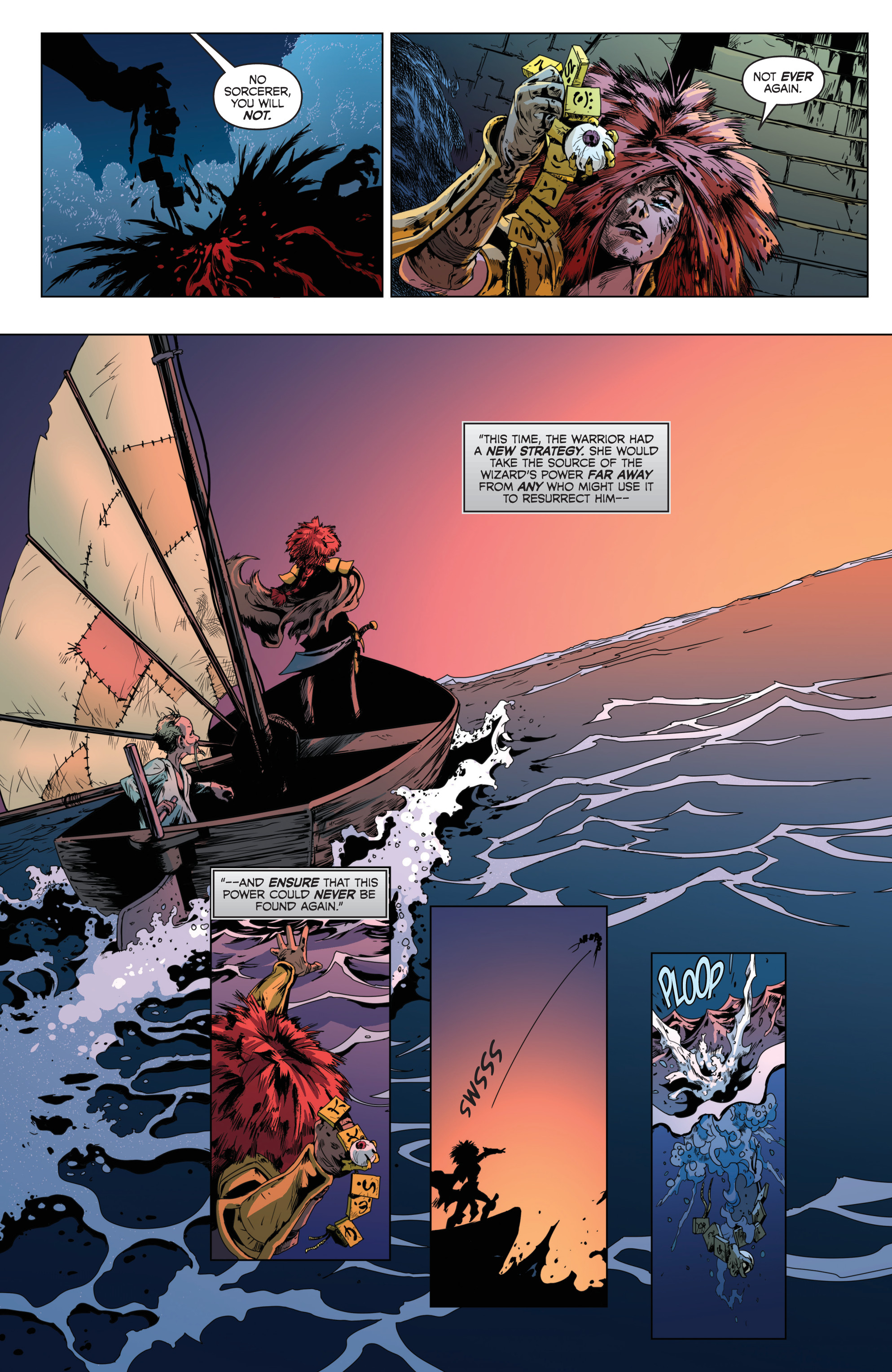 Though they initially struggled against Gath, Ernie was able to transfer the last of his power to Sonja’s sword, allowing her to injure Gath enough for Purgatori to reclaim control of her body. However, Gath would still be revived when Sonja placed his amulet on a nearby corpse, leaving him weaker than ever and restoring the timeline. But this time, rather than kill him, Sonja allowed Gath to leave on foot, challenging him to regain his full power if he managed to survive the desert. Then she would kill him.