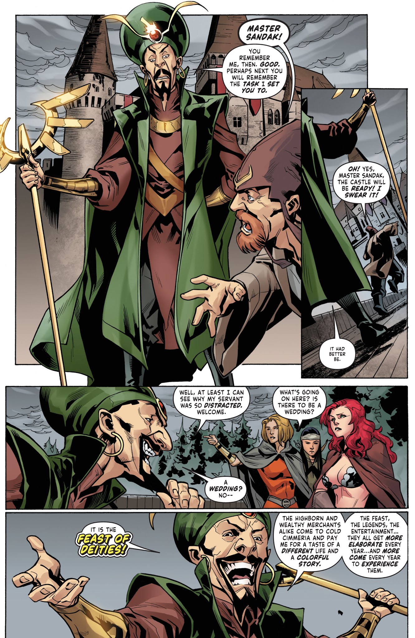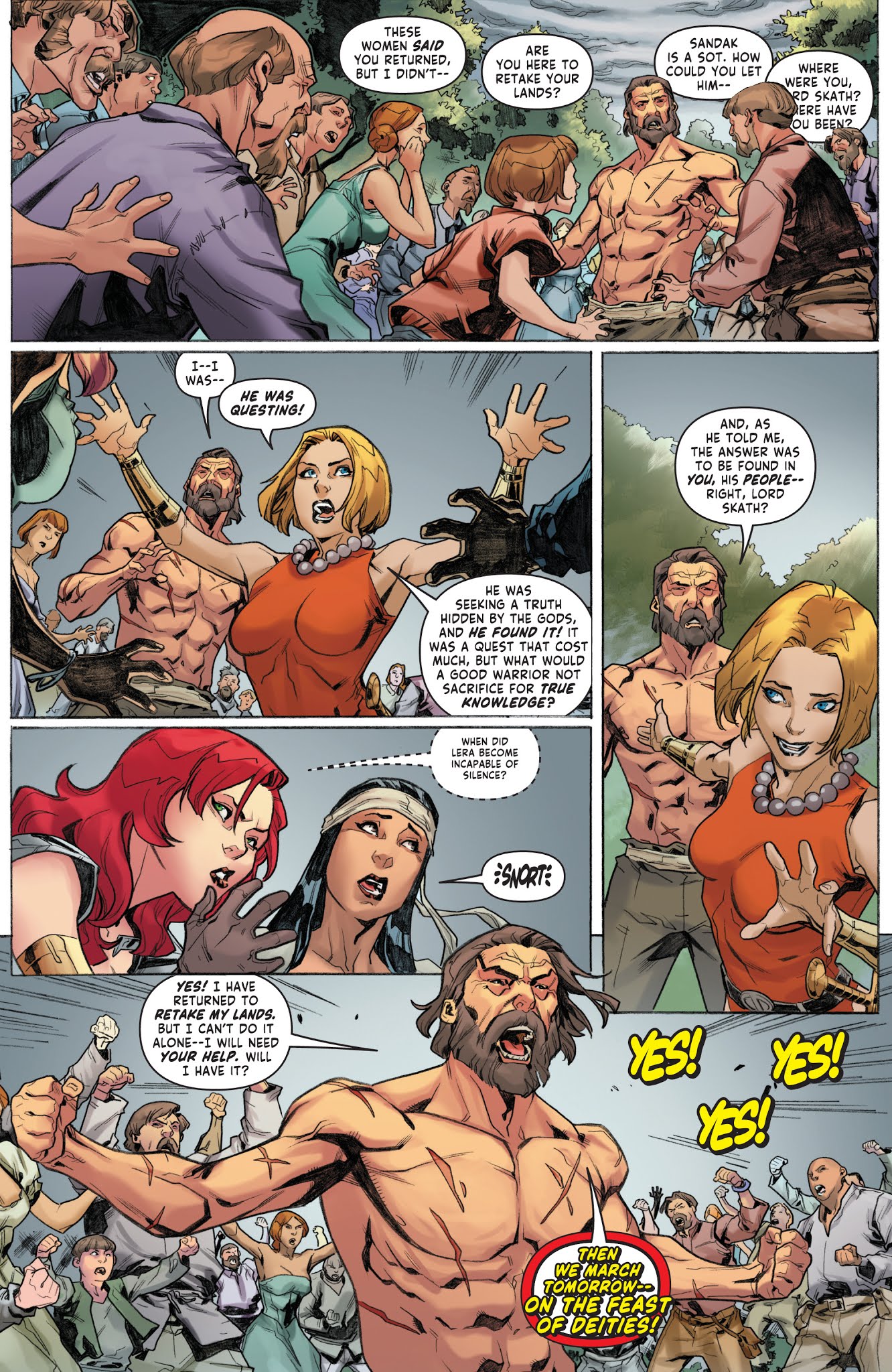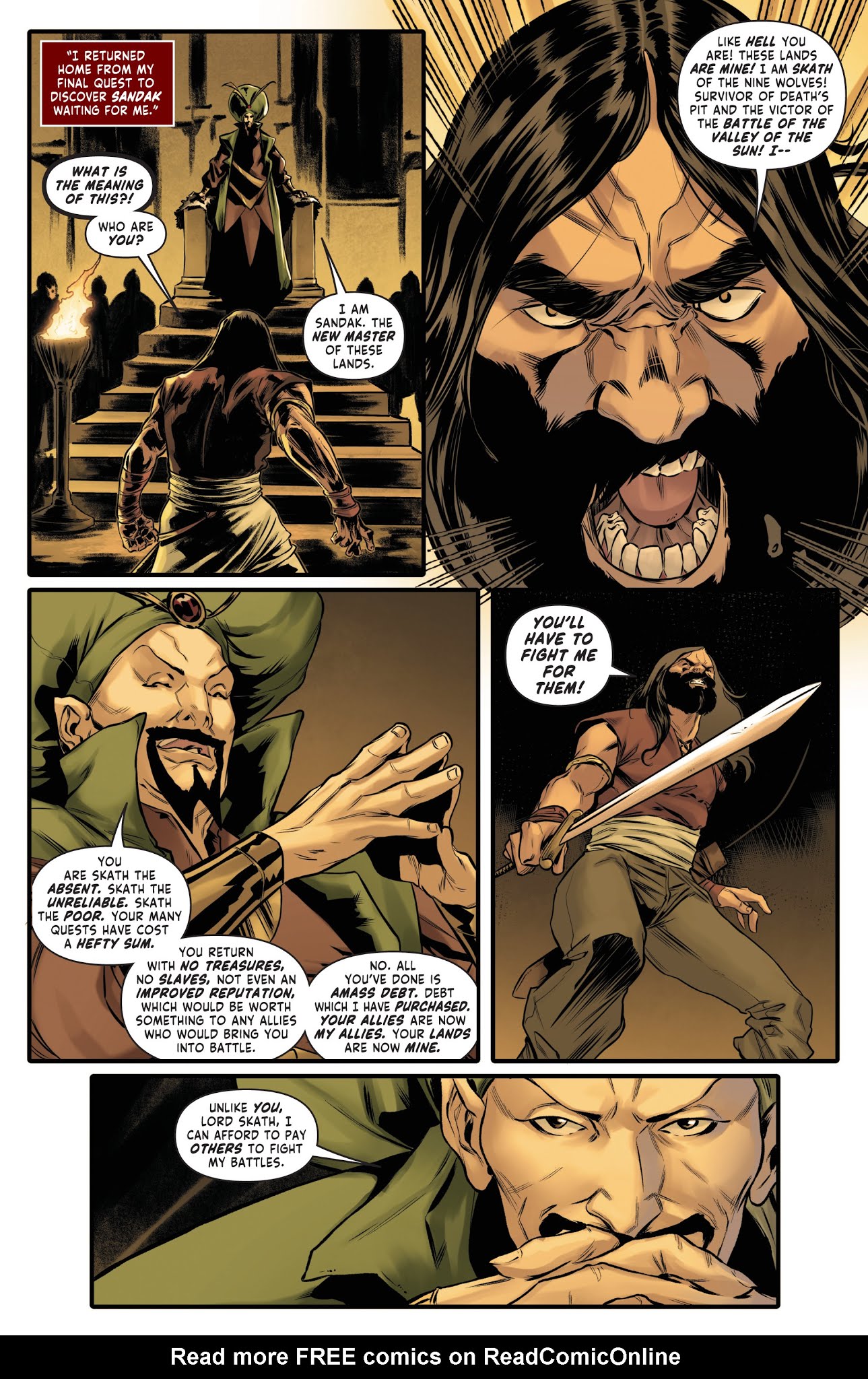 Thanks to Lera’s impromptu inspirational speeches, Skath united his former subjects into a loyal battalion ready to help him reclaim his throne… but when he was found drunk and unconscious, Sonja led the battle instead. Skath joined in soon after and directly challenged Sandak to a duel and quickly defeated him. His kingship restored, Skath gave Sonja his blessing to carry his sword, but this joyous occasion was interrupted by Sonja’s duplicate, who exposed Lera’s possession of Kulan Gath’s amulet. The two Sonjas battled once again, with the original tricking her clone into falling to her death. Unfortunately, the knowledge of Lera’s betrayal caused Sonja to abandon their group, swearing that from this point on she’d work alone.