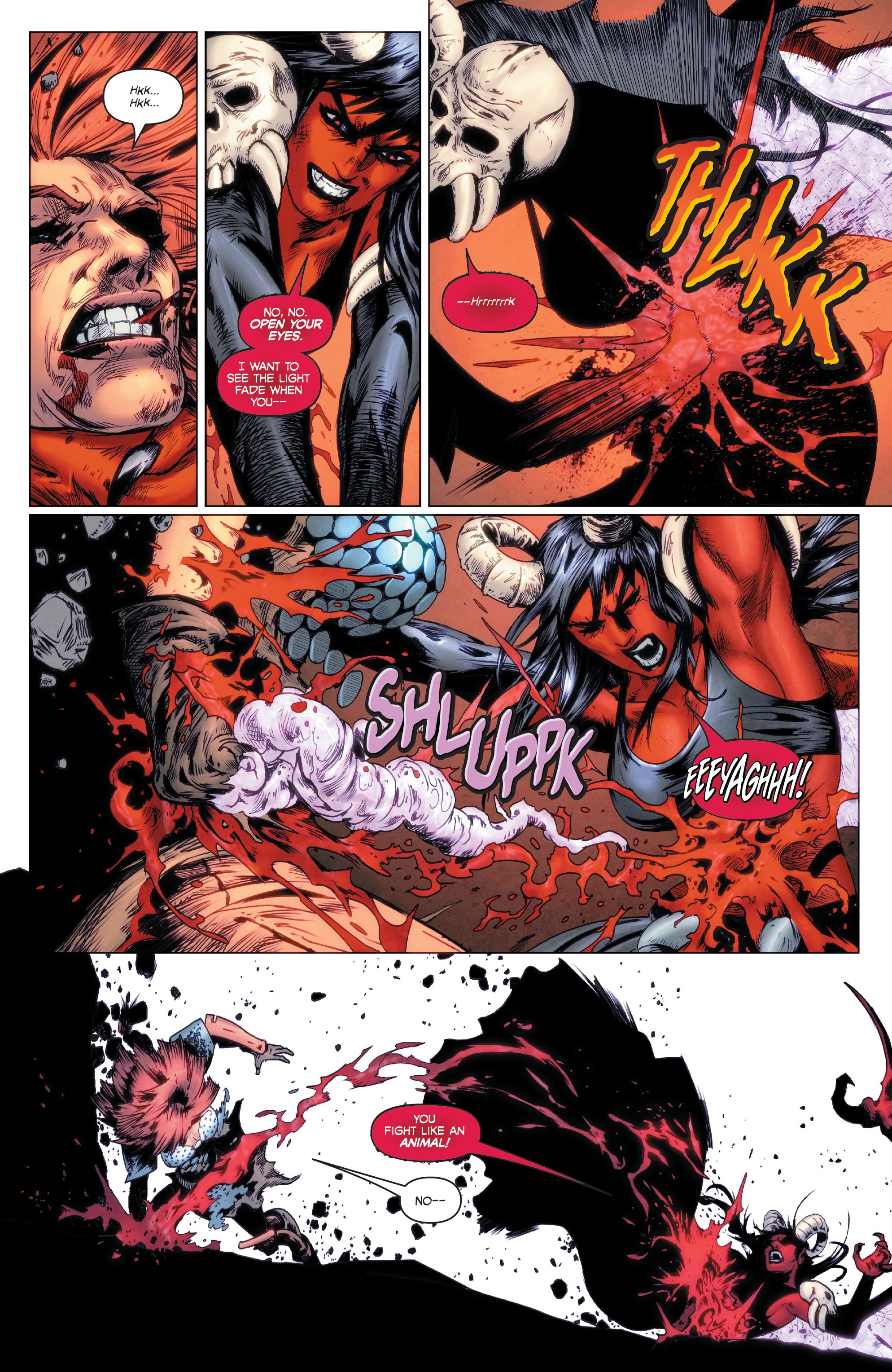 She’s willing to do anything to win in battle, even blinding enemies or ripping a demoness’s guts out.