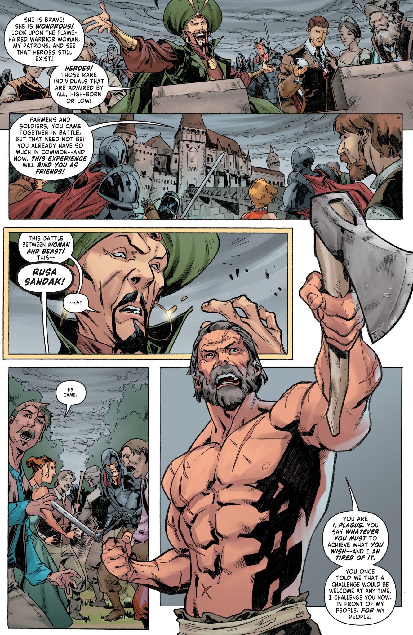 With the battle won, Wallace and Max returned to New York, and Sonja continued her life of adventure in Hyboria alongside Taya and Lera. During a journey to return the legendary Blade of Skath to its rightful place in Cimmeria, the trio would accidentally wind up hired by its current ruler, Rusa Sandak, to clear out a nearby village so he could have more space for an upcoming festival. Her time in the village eventually led her to Skath, now a vagrant after he’d been usurped during a quest. Still eager for revenge, the disgraced lord teamed up with Sonja’s party to right the wrongs done to him.