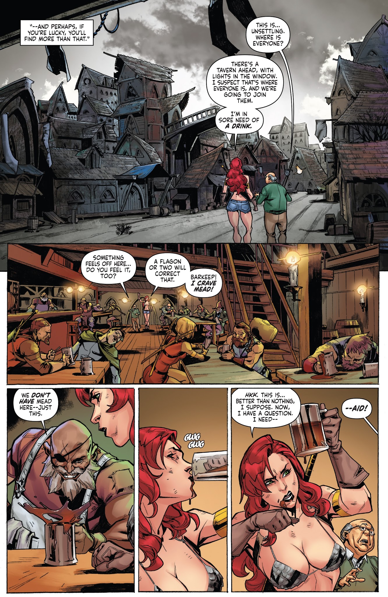 Sonja is a fierce warrior whose thirst for battle is only matched by her love of ale, to the point where a tavern is usually her first stop when entering a town. She can drink enough to rack up an $837 bill, downed a strong moonshine with no issue, and her price for slaying a giant demon was a lot of ale and a Shamballan dagger.