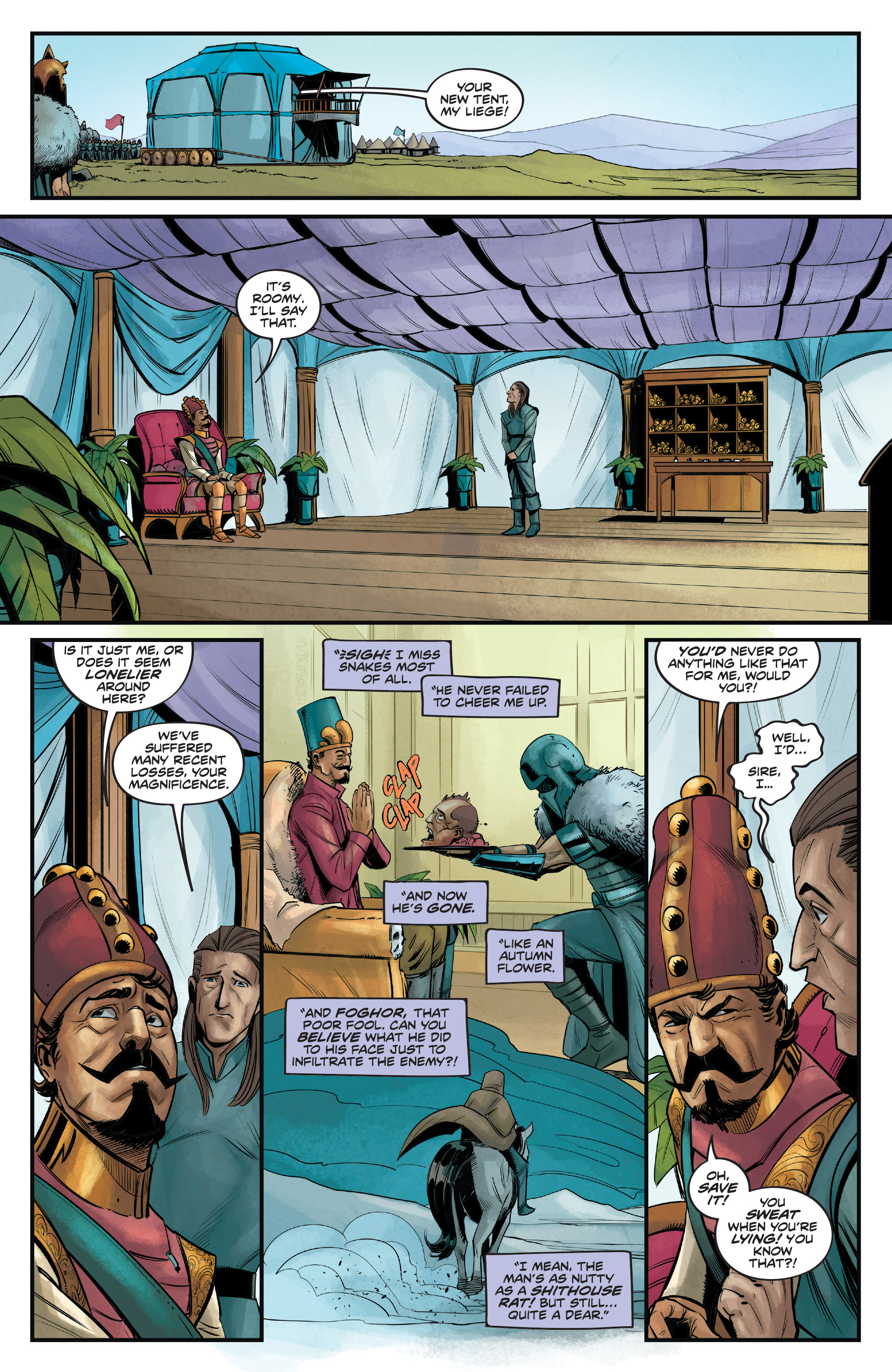 While the story immediately hooked me in, my previous knowledge of Conan and Sonja stories had me a bit skeptical about some of the locations. Hyrkania’s usually a massive country of flourishing city-states and fierce warriors. Here it’s a backwater village of cowardly farmers who can’t even cook their meat properly. Zamora’s a city of distrustful, greedy thieves, but this series has them as a thriving empire of able-bodied soldiers. And the depictions of Koth and Kush are seemingly reversed from what they’re usually like.Some of the dialogue felt weird for some reason, and I can’t pin down why. These scenes stuck out as the most obvious examples while reading, and Isolde’s use of “fuck” in issue 24 had me do a double take. The last time I remember that kind of language in a Sonja book was this, but at least that had the excuse of being a pissed off copyeditor trying to sabotage the book. This is just putting in some anachronistic swearing that feels really at odds with the setting.