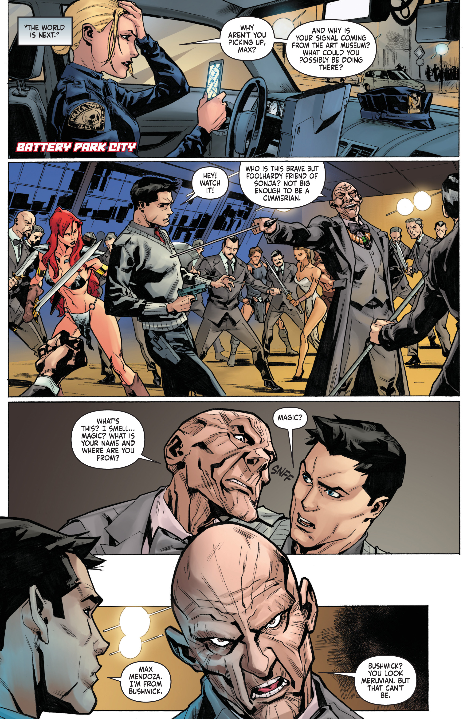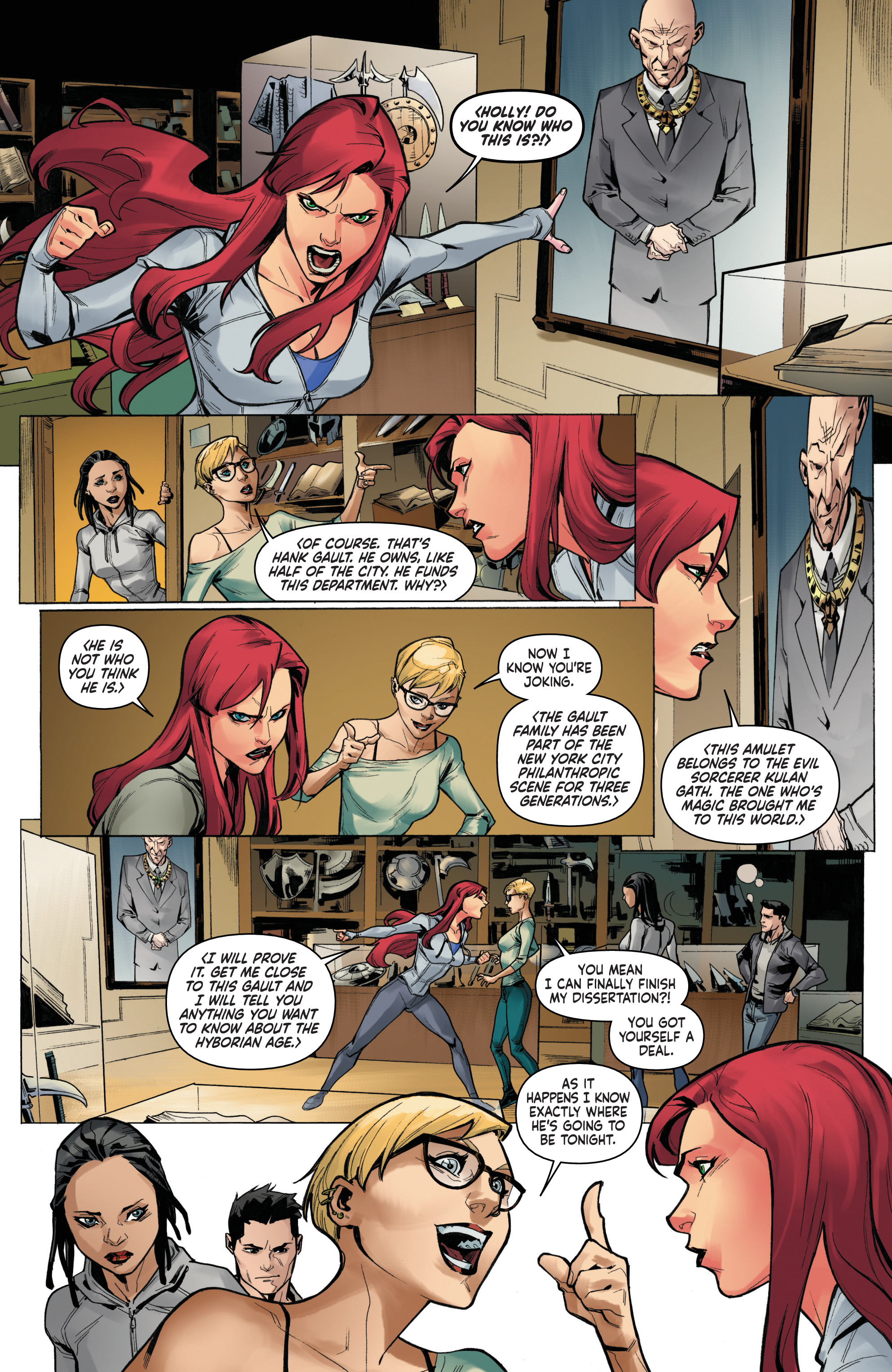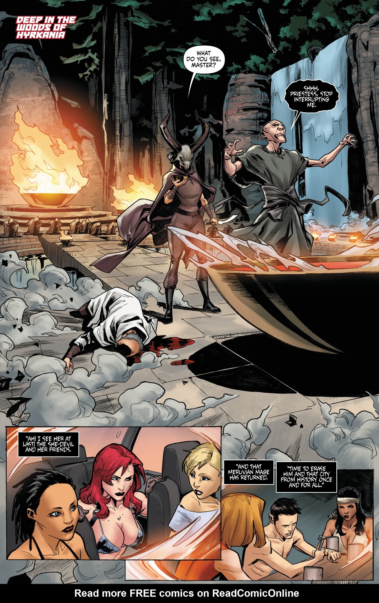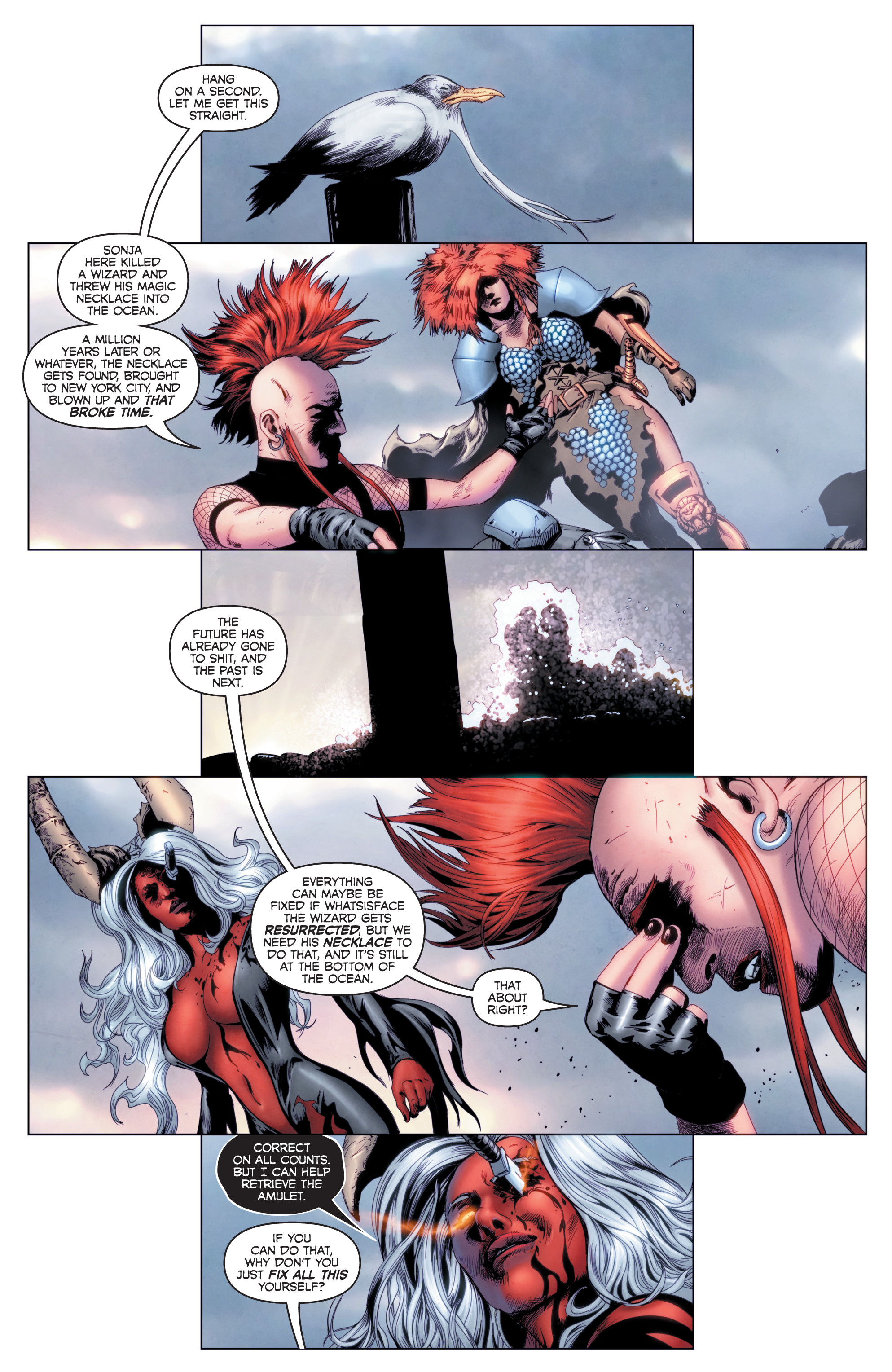 In the first arc of Red Sonja volume 4, Gath kicked off the plot by using his magic to send himself, Sonja, and Max into the future, though they all wound up in different time periods because “Time is relative, not precise.”