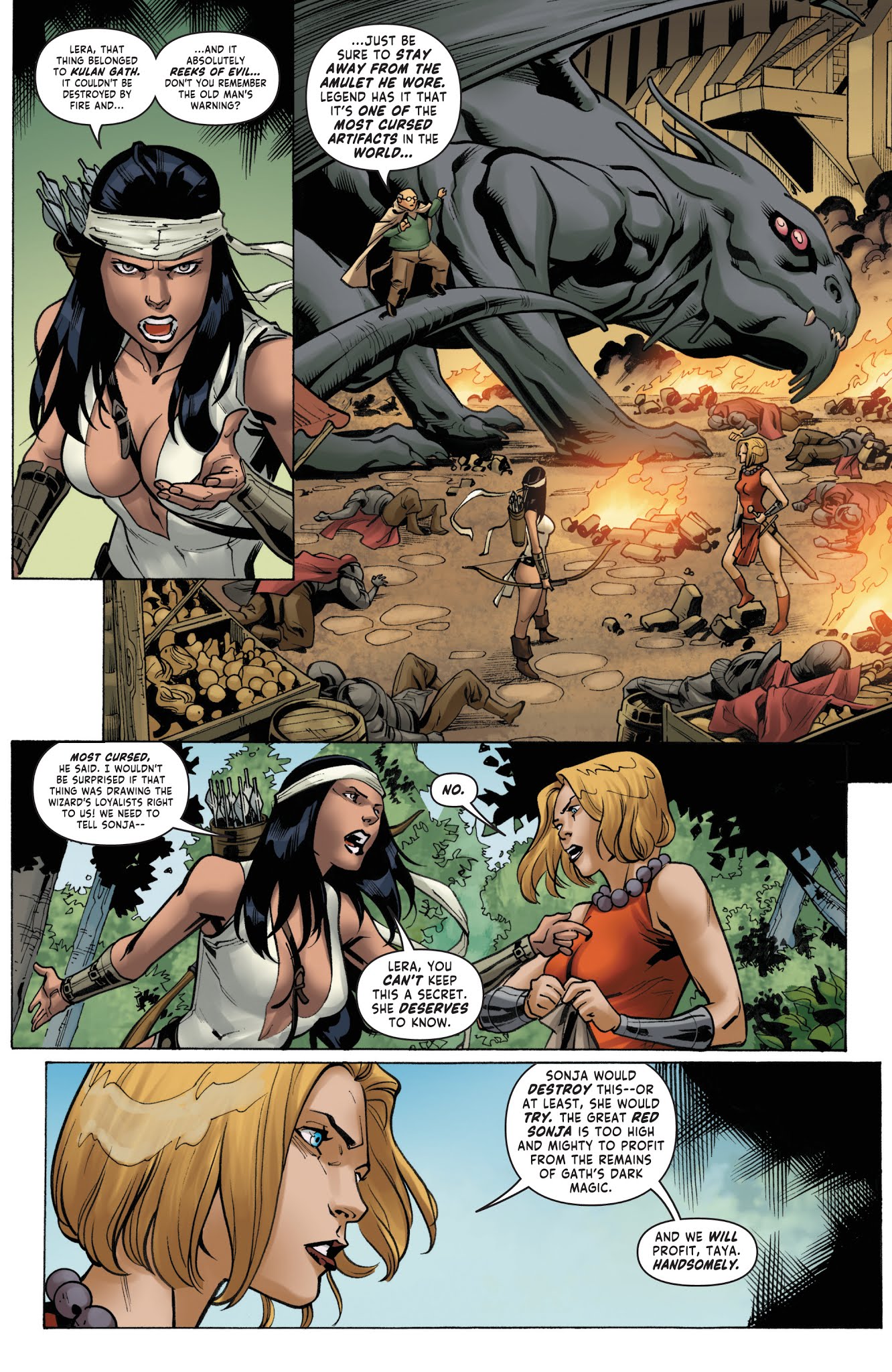 Meanwhile, Gath resumed his power hungry ways by taking over Shamballah and having it rebuilt in his image. With Max’s unwilling aid, Kulan was able to usurp the seven cities and absorb their magic for himself, then coerced Sonja’s duplicate into joining him with the promise of giving her a real life. But when the real Sonja into the fortress, everything went downhill. Aided by Wallace and a reformed Beast of Khauran, Sonja ended Gath’s reign once more, with the sorcerer being incinerated by the fiery breath of his former servant. However, his amulet would be secretly taken up by Lera, who hoped to sell it while traveling with Sonja. When this betrayal was discovered, Sonja and her copy battled once again, with the original using Gath’s amulet to bait the clone into falling to its death.