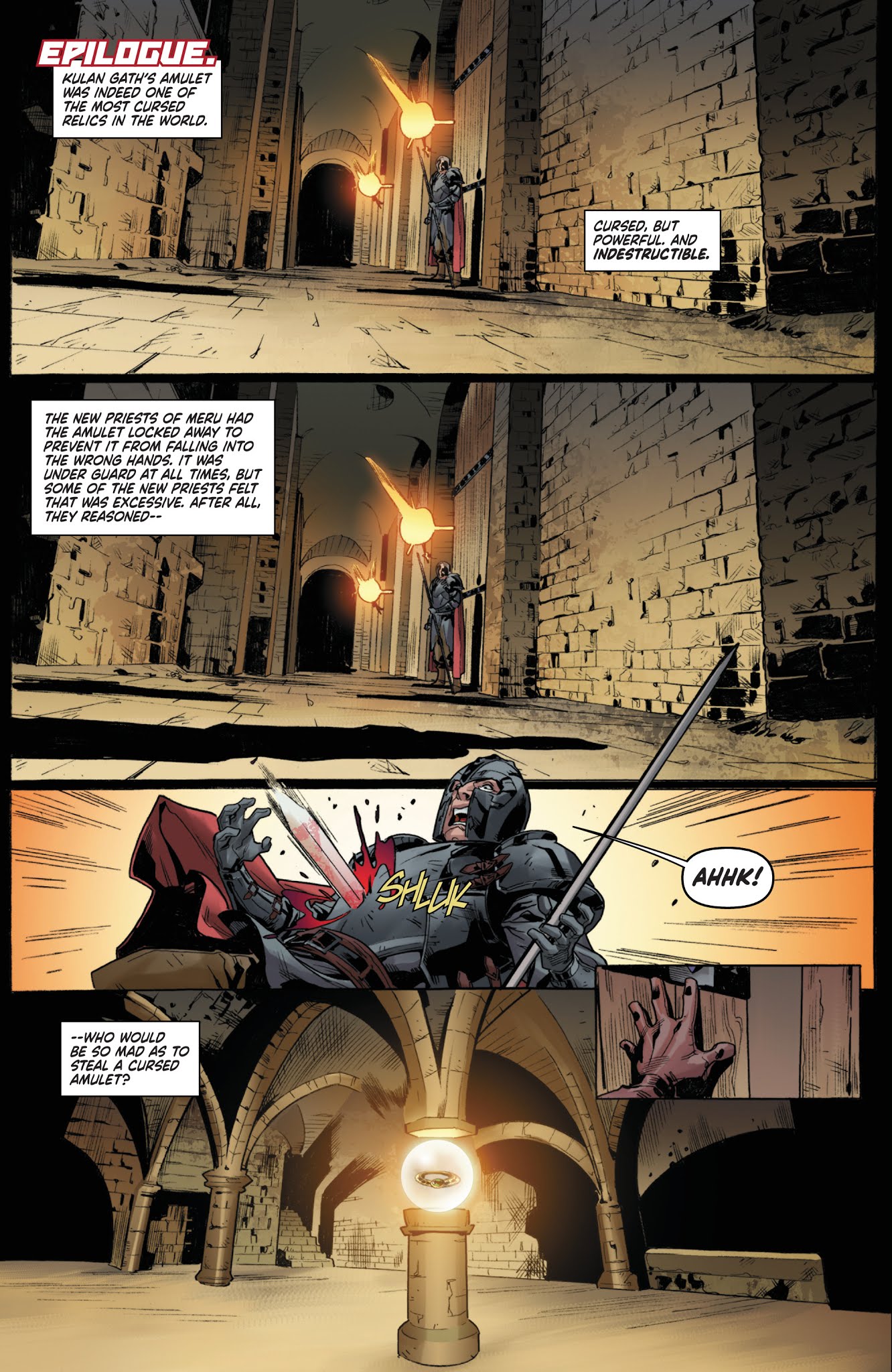As his ex-wife planted the seeds for his downfall, Gath, now taking the title of Kulan, grew in power, but everywhere he went, Sonja continued to hound him. During one of these encounters, his amulet was split in two, sending him to 632 AD, where he tricked the Mayans into believing he was a god. Though Sonja managed to follow him, he successfully empowered his sacrificial knife through an unwitting accomplice, giving him the power to travel to the end of the world. Despite Sonja trailing him once again, Gath held her and her new companions off with his arcane summons. Unfortunately, his plans for world domination would be undone when Sonja- now a vampire- used his magically-empowered knife to stab him to death.
