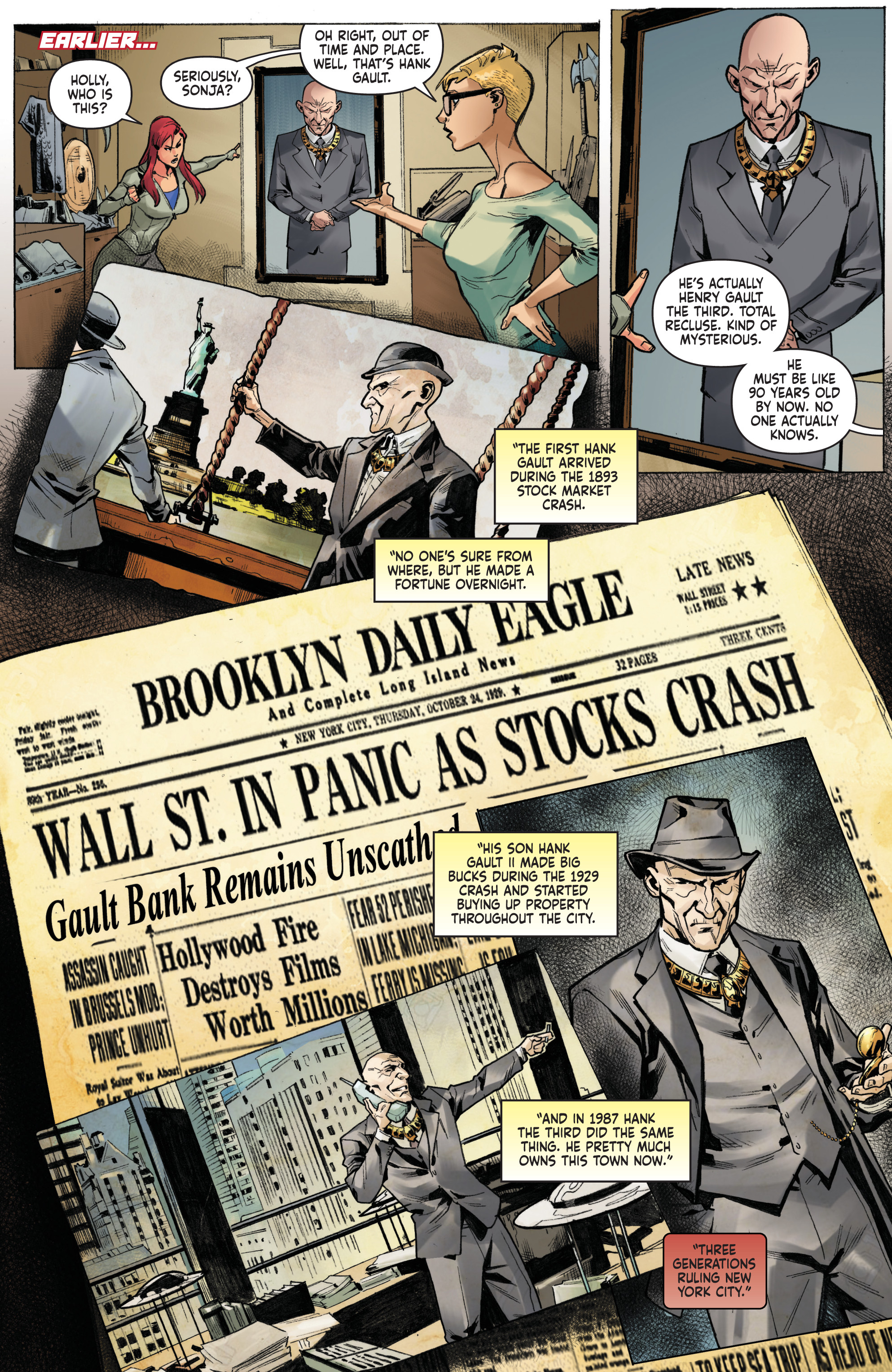 Even after his soul was condemned into the River Styx, Gath managed to escape from the underworld and battle Sonja’s latest incarnation, using his magic to scatter himself and Sonja across time. Landing in 1893, he adopted the identity of businessman and philanthropist Hank Gault and established a successful industry, slowly purchasing property in New York until he practically ran the town. But after three generations of climbing the corporate ladder, “Hank Gault III” would meet his end when Sonja was deposited into New York on January 2017. After a failed attempt to kill them with the Beast of Khauran and being abandoned by it, “Hank” took matters into his own hands and challenged Sonja and her partner Max. This confrontation would end with Gath being decapitated and his “immortal” body being tackled by Max back into ancient Hyrkania. But thanks to his devoted followers, Gath was soon revived and began plotting revenge, eventually sending his forces through the portal that was meant to send Sonja home. However, Sonja and Wallace- or rather, duplicates of them created by Wallace’s spell- would end up tackling him back into their original time, with the real Sonja following through. While Gath’s magic corrupted the location they wound up in, the displaced Hyborians wasted no time in tracking him down.