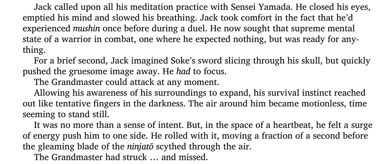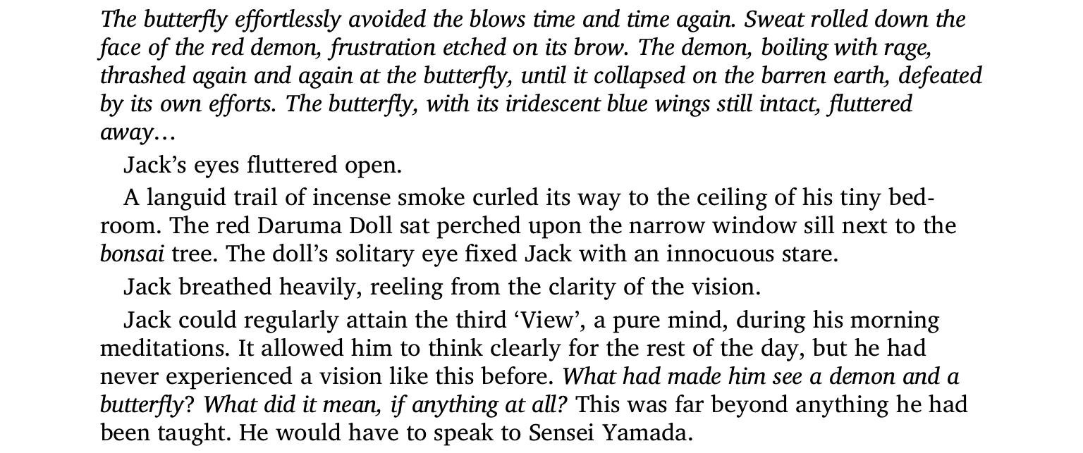 Yet in spite of all of this, Jack would become one of the few lucky candidates picked to train under Masamoto and learn the Two Heavens, a technique to simultaneously wield a katana and wakizashi. To prove their worth, Jack and the others underwent the Circle of Three, a set of challenges that tested the body, mind, and spirit. The odds were stacked against him, yet Jack’s resilience and determination allowed him to pass.