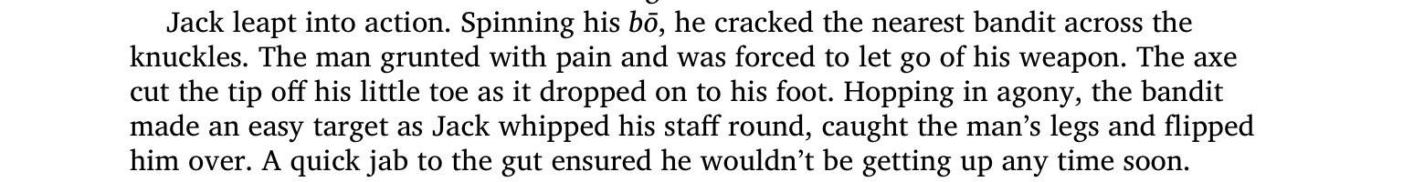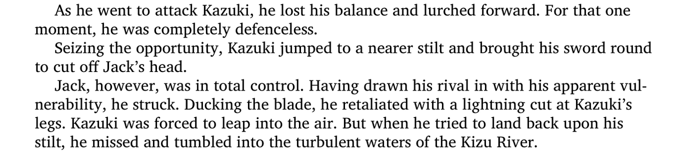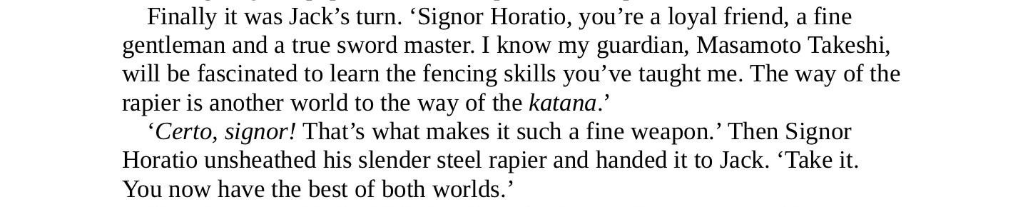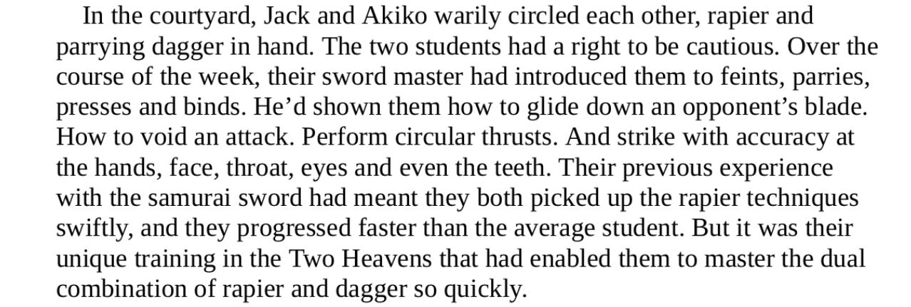 Upon returning to England, Jack was trained by the fencing master Horatio Palavicino, and within a week they’d progressed faster than the average student, learning feints, parries, presses and binds. “He’d shown them how to glide down an opponent’s blade.How to void an attack. Perform circular thrusts. And strike with accuracy at the hands, face, throat, eyes and even the teeth.” In the same timeframe, he was able to defeat Toby Nashe, a skilled fencer, in a one-on-one match.