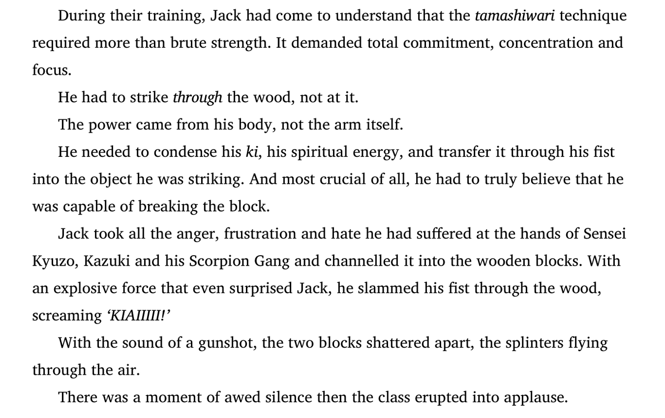 Despite only being rigorously trained in the basics of taijutsu, his skill was complimented by Masamoto, calling them inventive and effective, and has praised Jack as surpassing his expectations. Late into the series, it was shown he could instinctively use it to put Neko in a painful wrist lock.