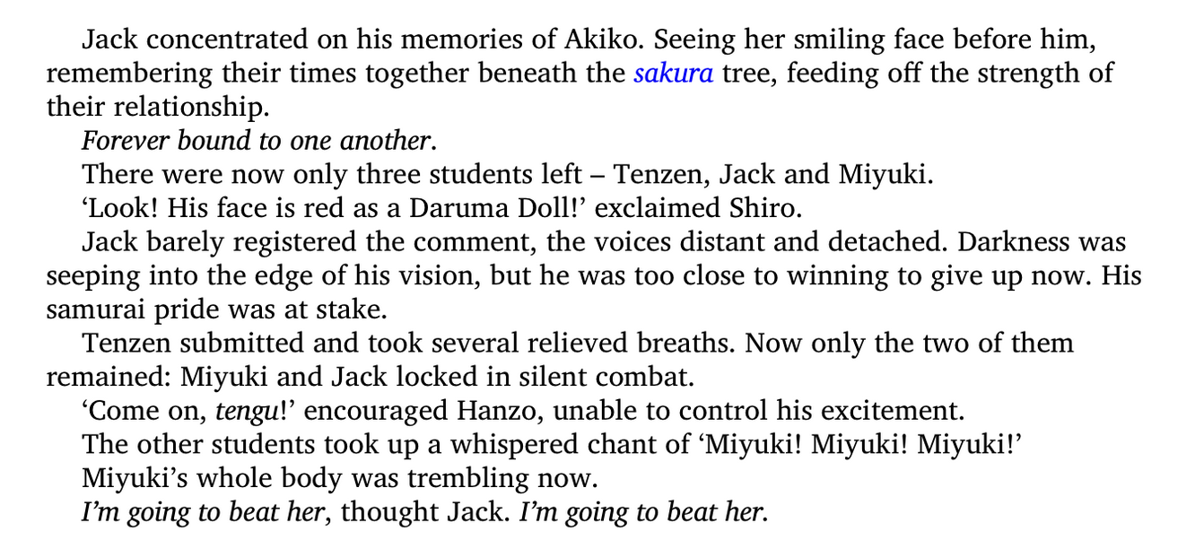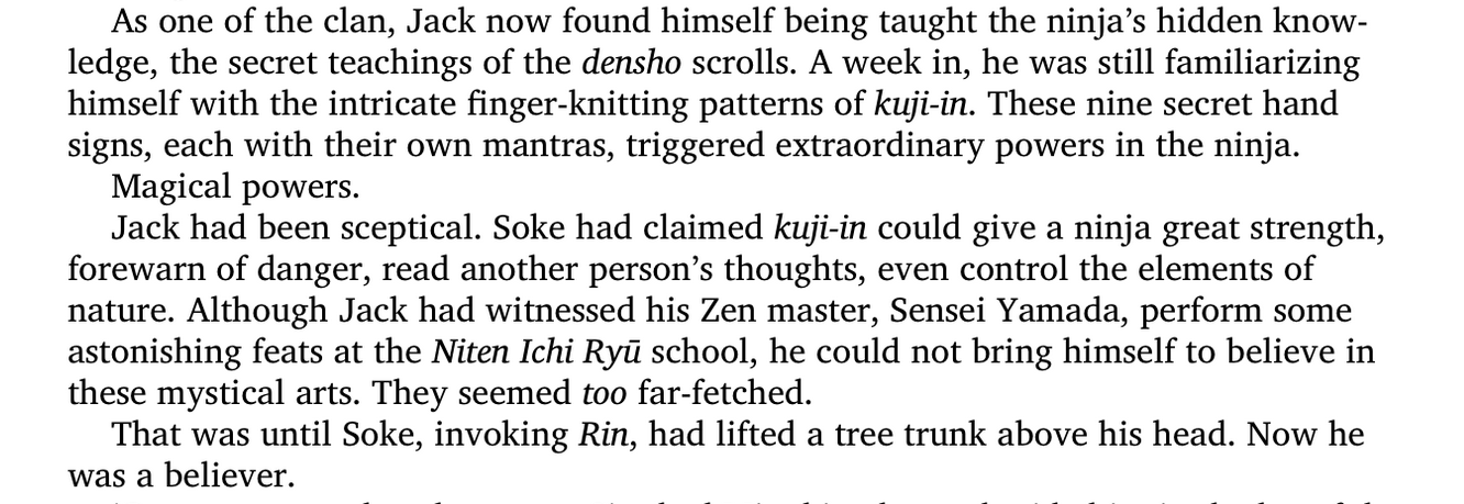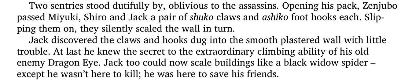 Jack trained in the arts of kenjutsu (swordplay), taijutsu (unarmed combat), bojutsu (staff fighting), and kyujutsu (archery), but his time at the school was strenuous. He had few friends, sometimes struggled with his lessons, and was looked down upon by his taijutsu instructor, Kyuzo, for being a gaijin, often singled out as a bad example and used as a training dummy for locks and holds. Some students even banded together to form the Scorpion Gang, a group dedicated to beating him and instilling the belief that he’d become a victim of daimyo Kamakura’s anti-Christian crusade.