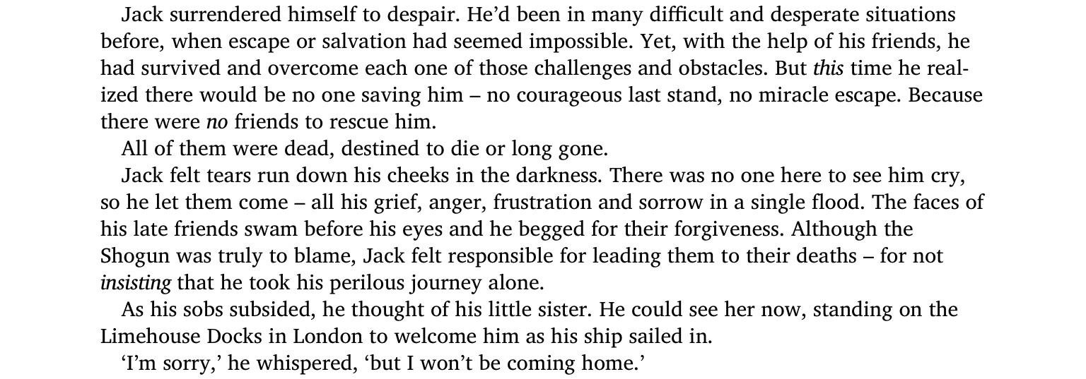 Until the Shogun’s samurai shanghaied the ship, threatening to kill the entire crew unless Captain Spilbergen turned over Jack and his friends. Left with no other choice, they complied, but seconds before Jack and the rest were to be burned at the stake, the execution was halted.